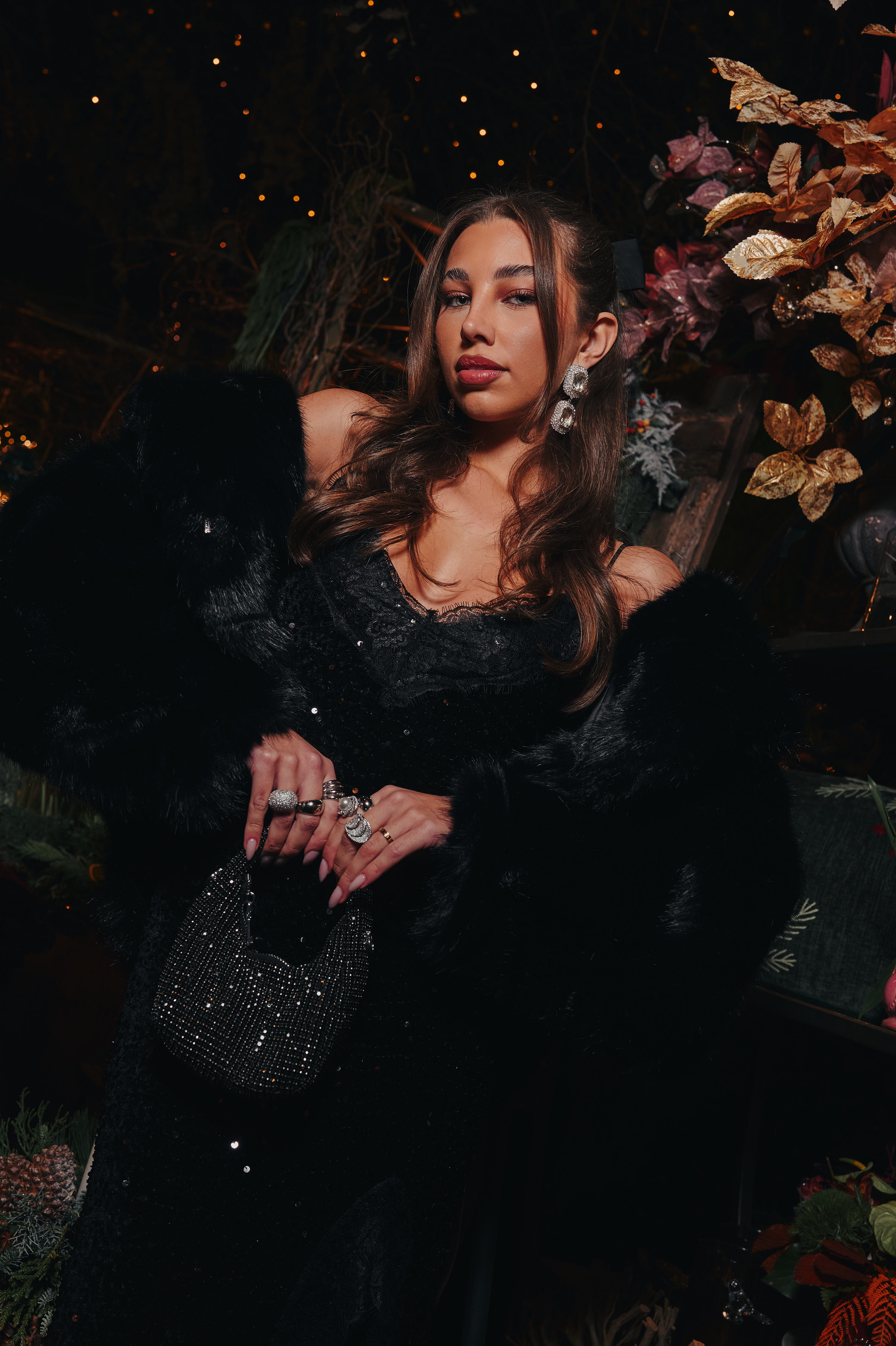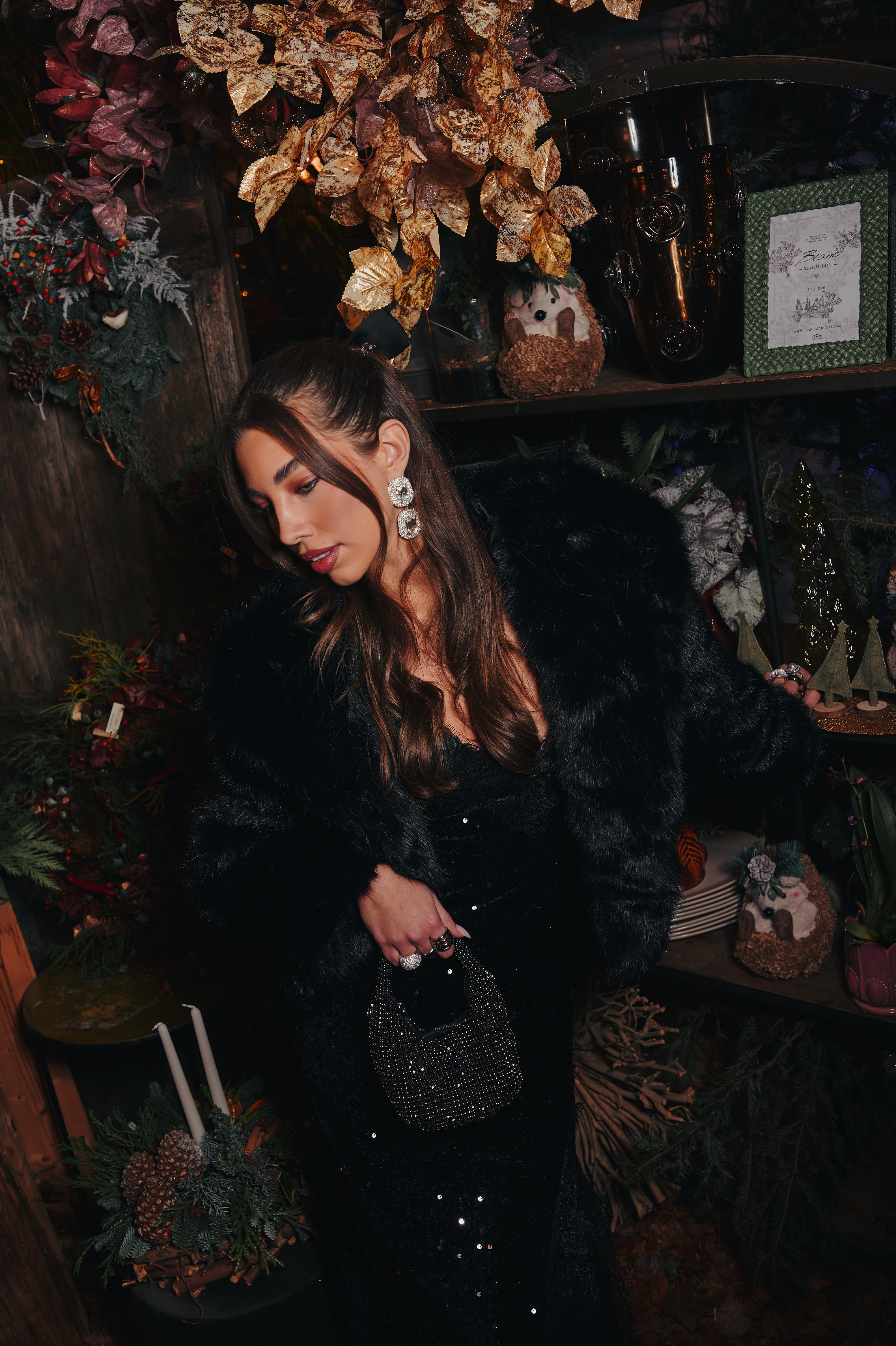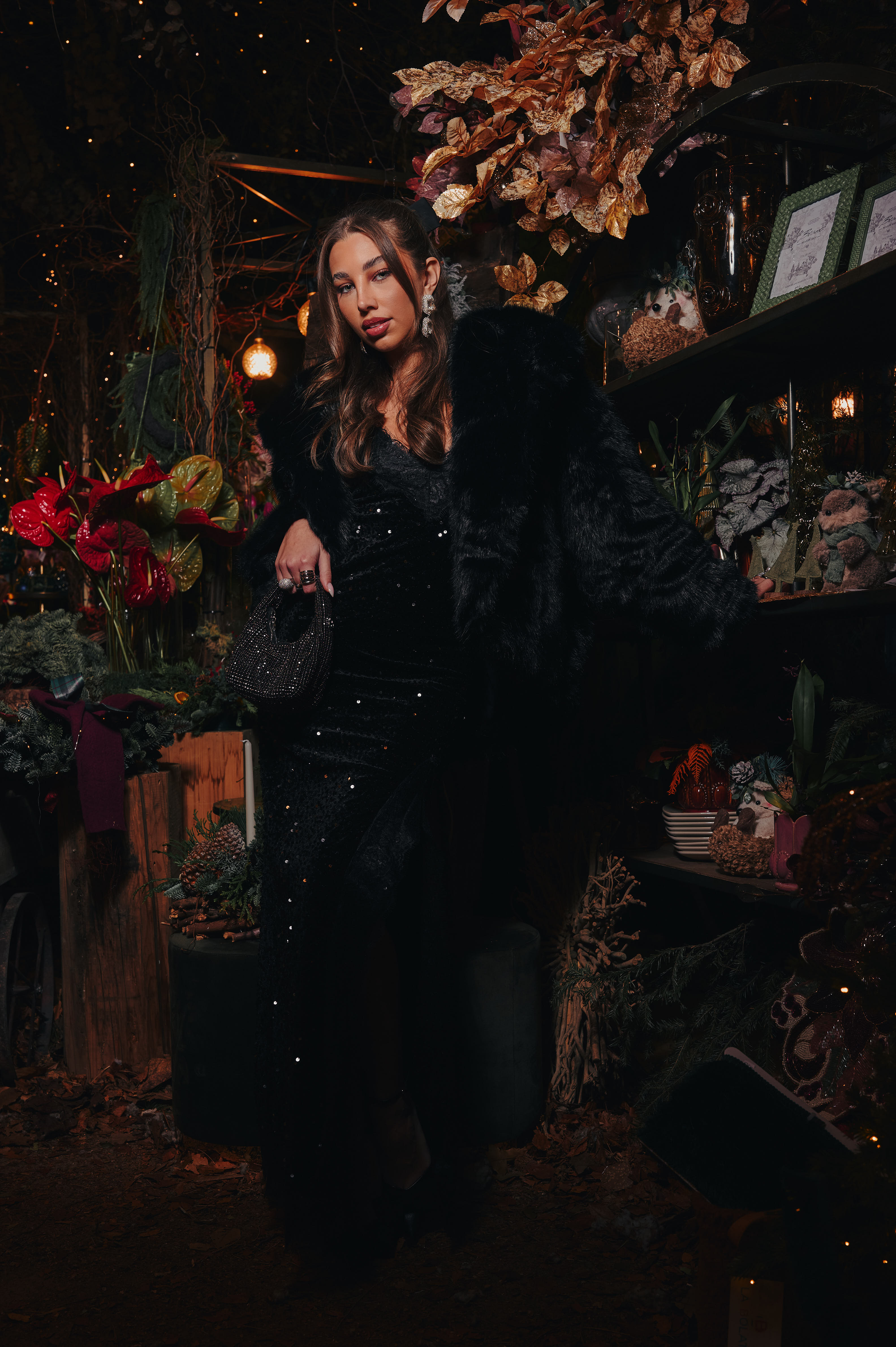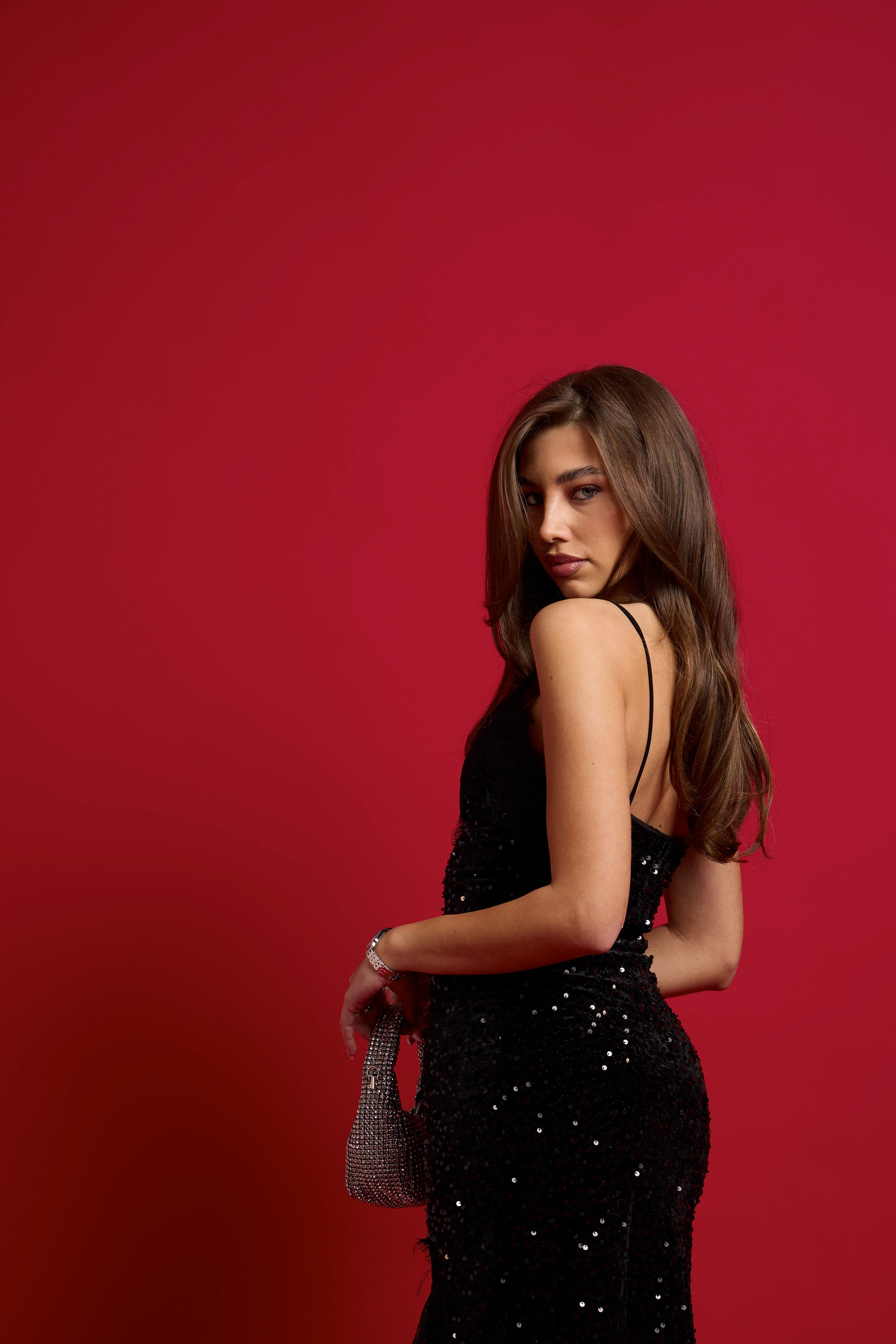 Abito lungo realizzato in tessuto simil velluto e completamente ricoperto di micro paillettes nere, illumina la silhouette con riflessi sofisticati. Lo scollo a V valorizza il décolleté, mentre la linea slim scende lungo il corpo creando un effetto slanciato e femminile. Lo spacco laterale, aggiunge movimento e sensualità. Le spalline sottili e il bordo in pizzo donano un tocco finale romantico e raffinato.