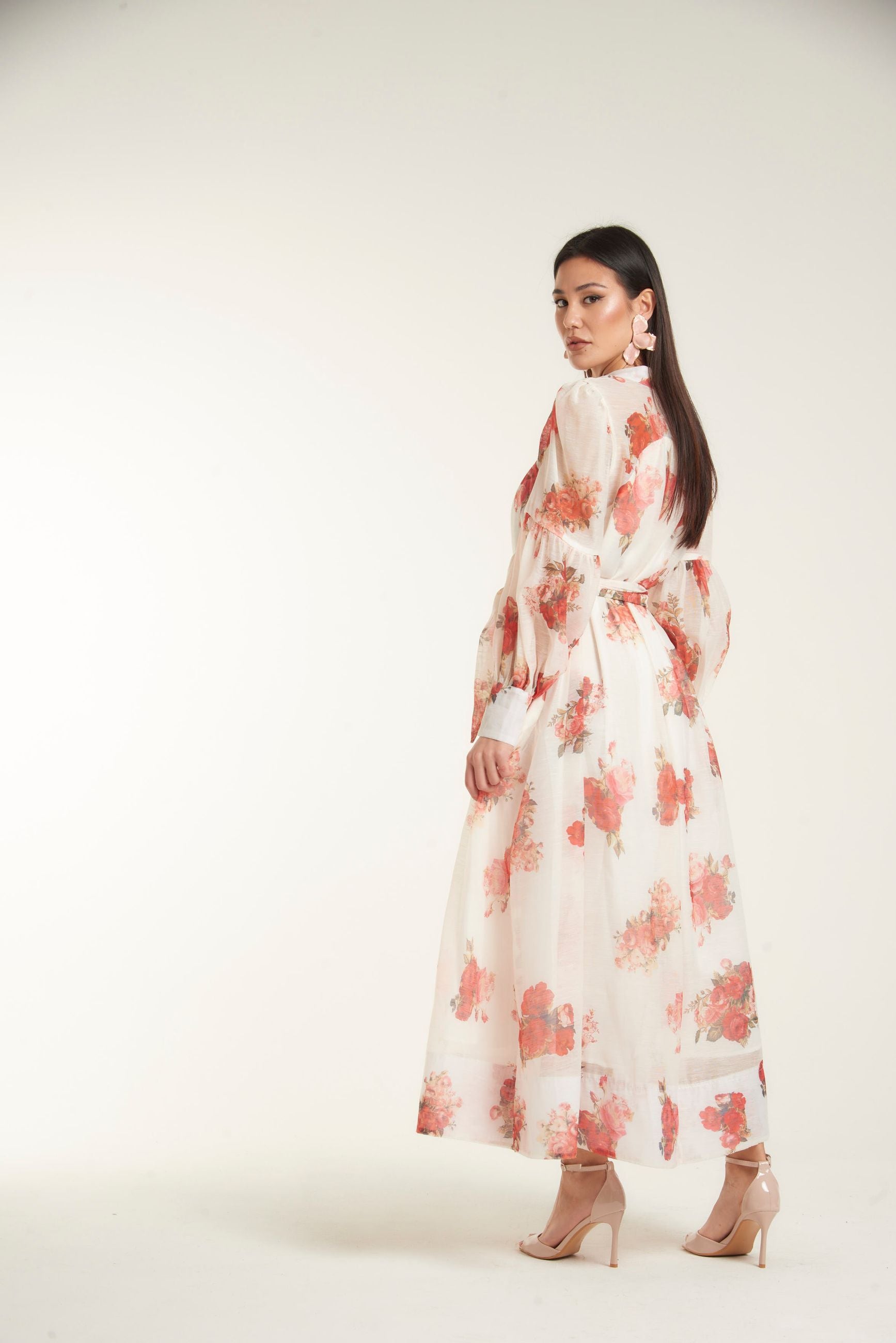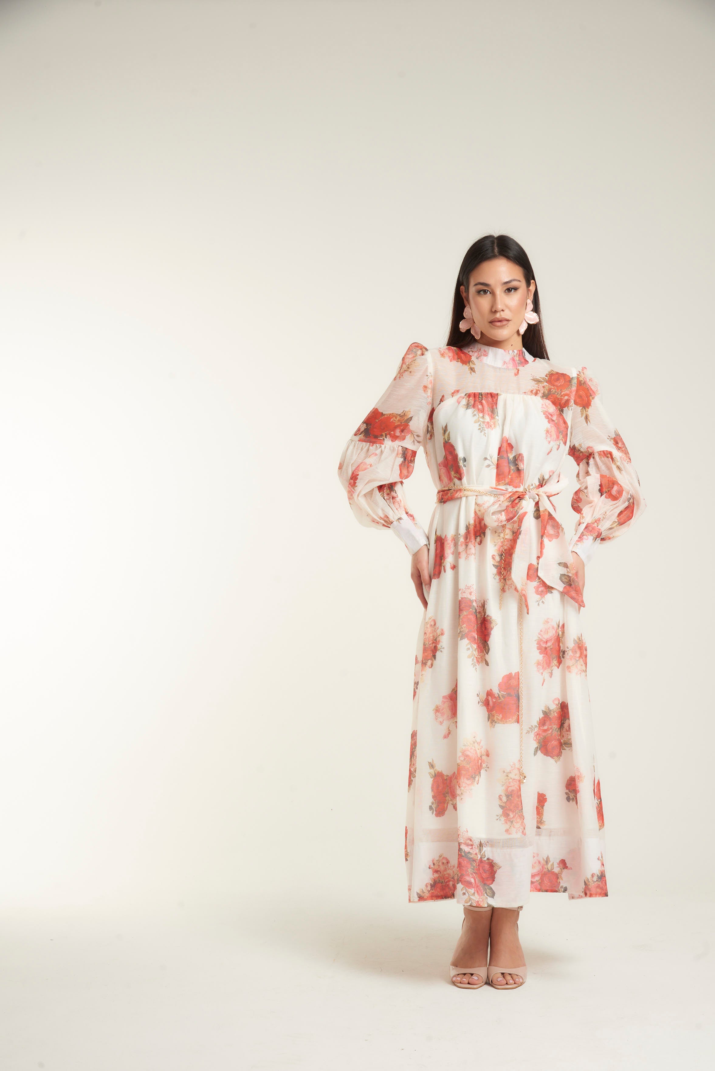 Abito lungo in chiffon leggero color avorio con stampa floreale nei toni del rosso corallo e rosa cipria. La linea è morbida e fluida, con cintura coordinata in vita che definisce la silhouette. Dettaglio collo alto leggermente arricciato dona un tocco romantico e raffinato.