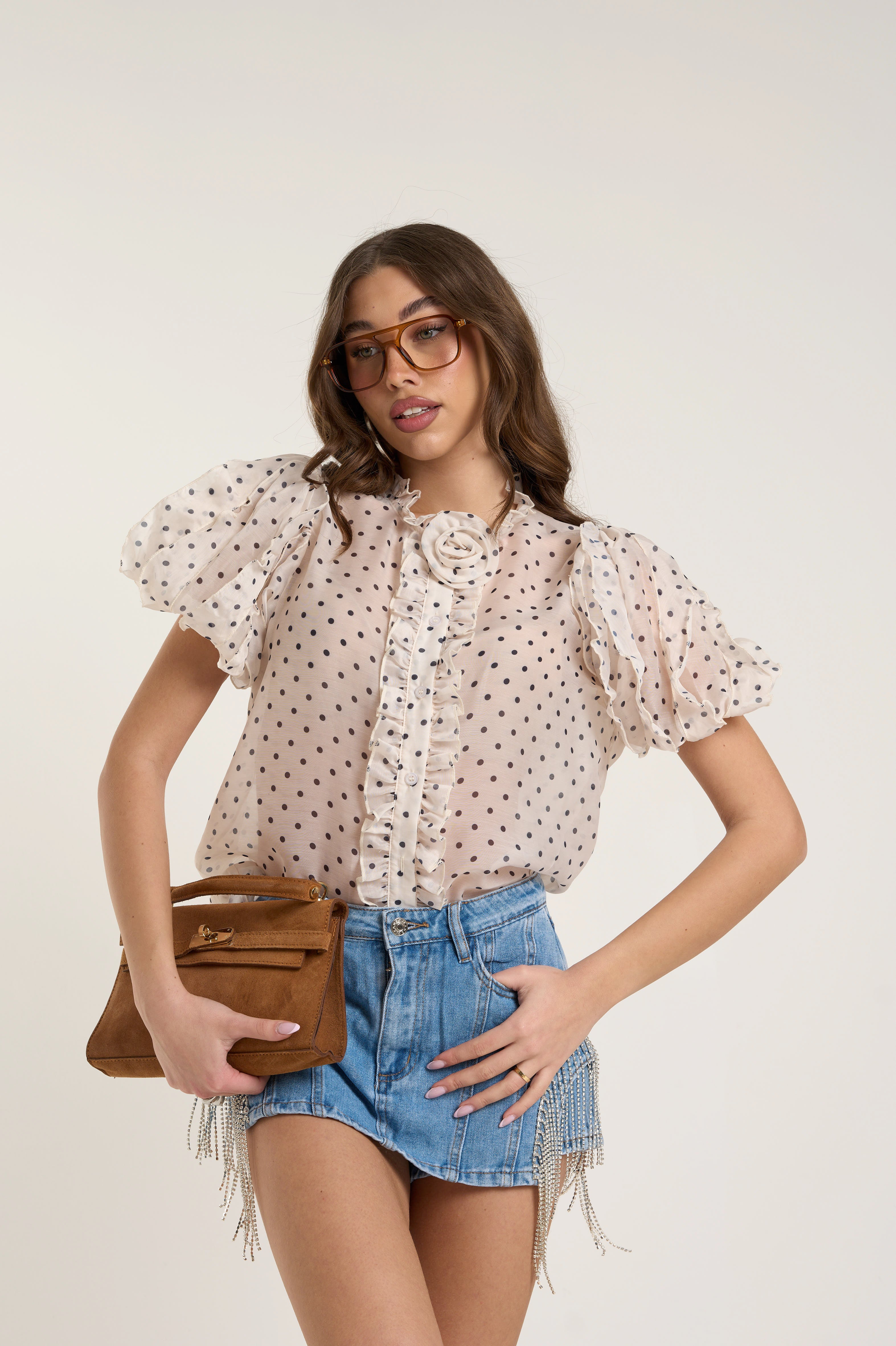 Camicia semitrasparente elegante. Colore beige chiaro. In fantasia pois neri piccoli all-over. In tessuto leggero. Con collo alto con dettaglio decorativo a rosa. Chiusura con bottoni. Dettagli frontali con ruches verticali lungo l'abbottonatura. Maniche corte a sbuffo.