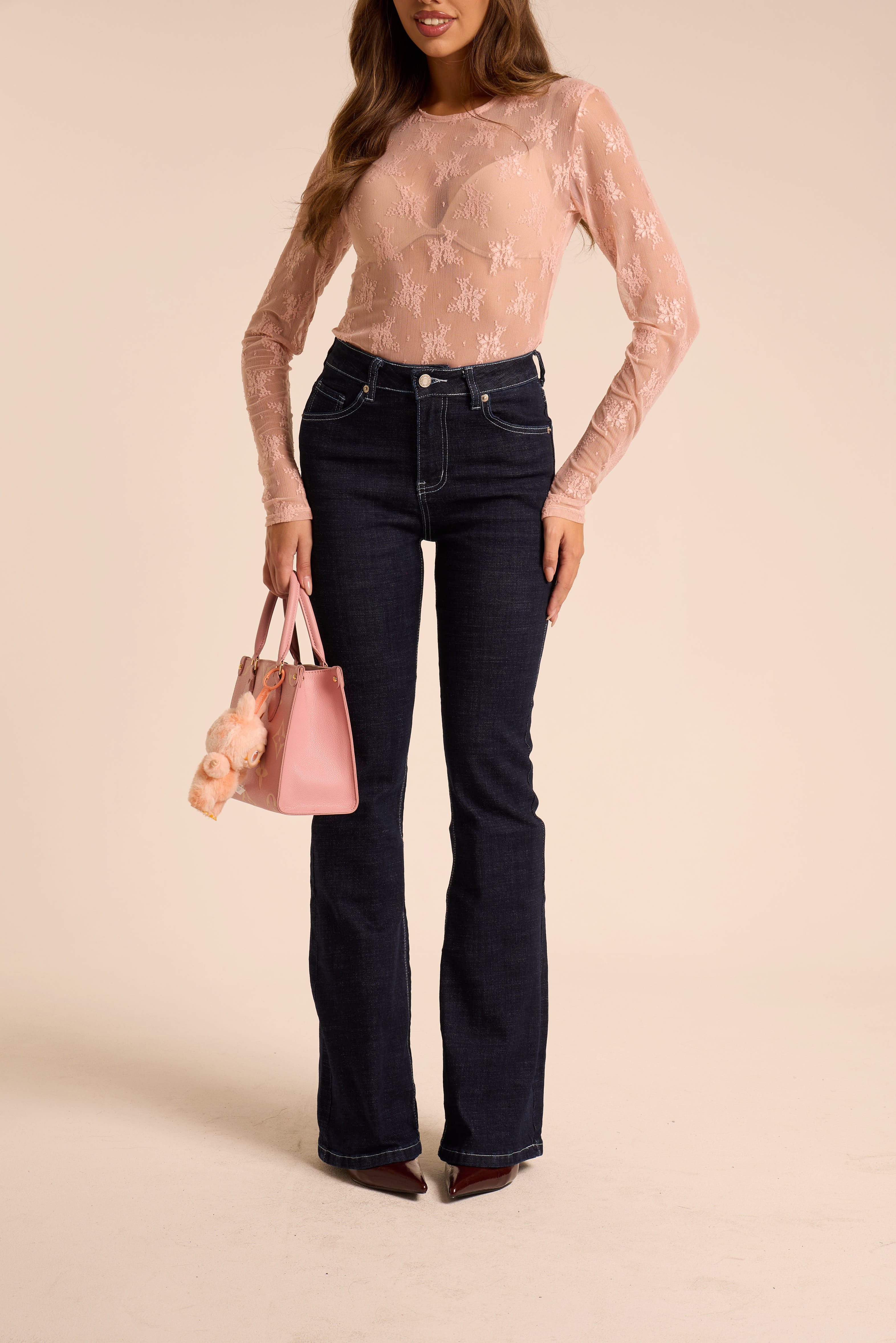 Jeans a zampa. Tessuto elasticizzato. Passanti in vita per cintura. A 5 tasche. Chiusura con cerniera zip e bottone. Cuciture e rifiniture a contrasto colore.