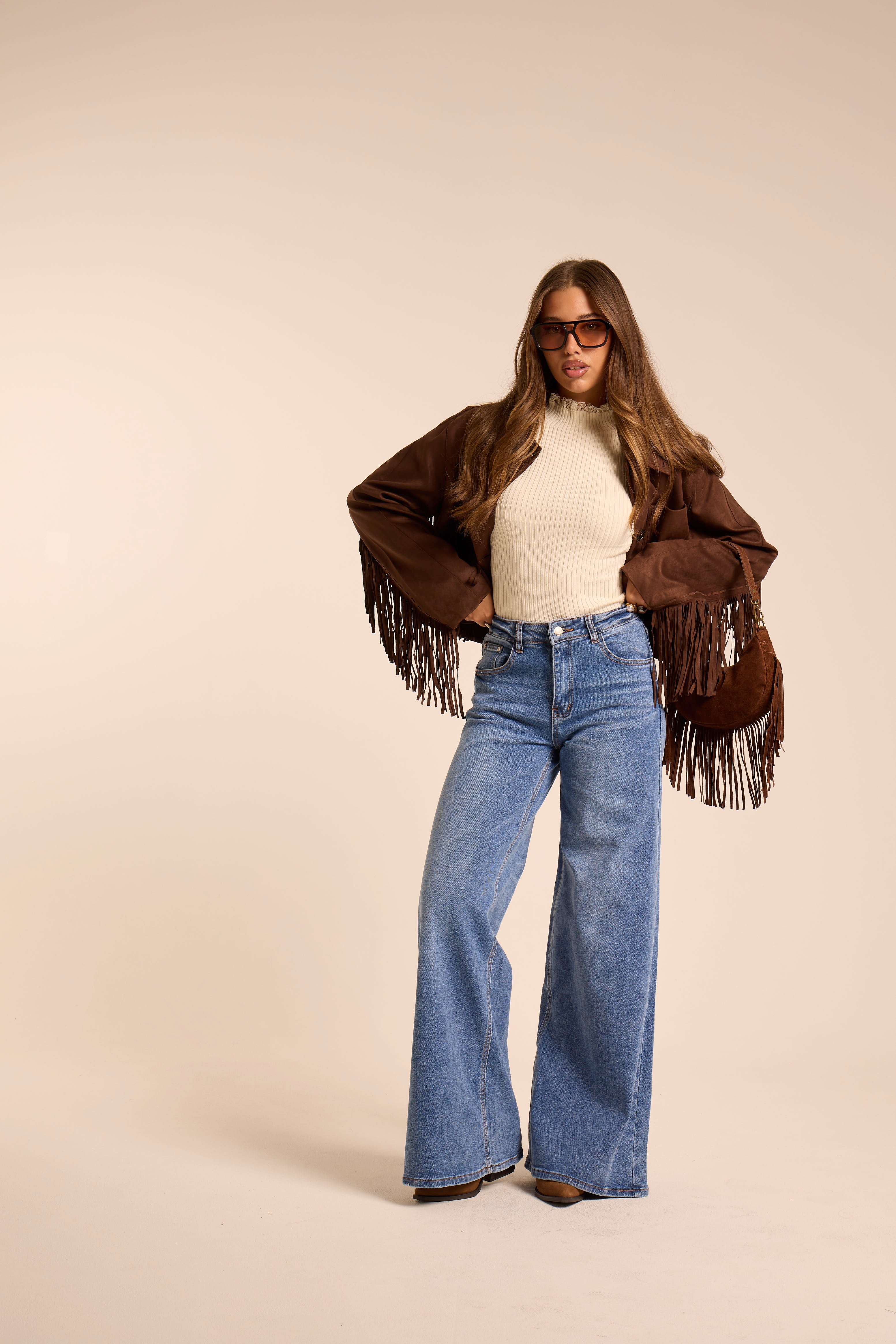 Jeans modello e colore basico. Relaxed fit. A vita media. A gamba larga e dritta. A 5 tasche. Passanti in vita per cintura. Chiusura con cerniera zip e bottone.