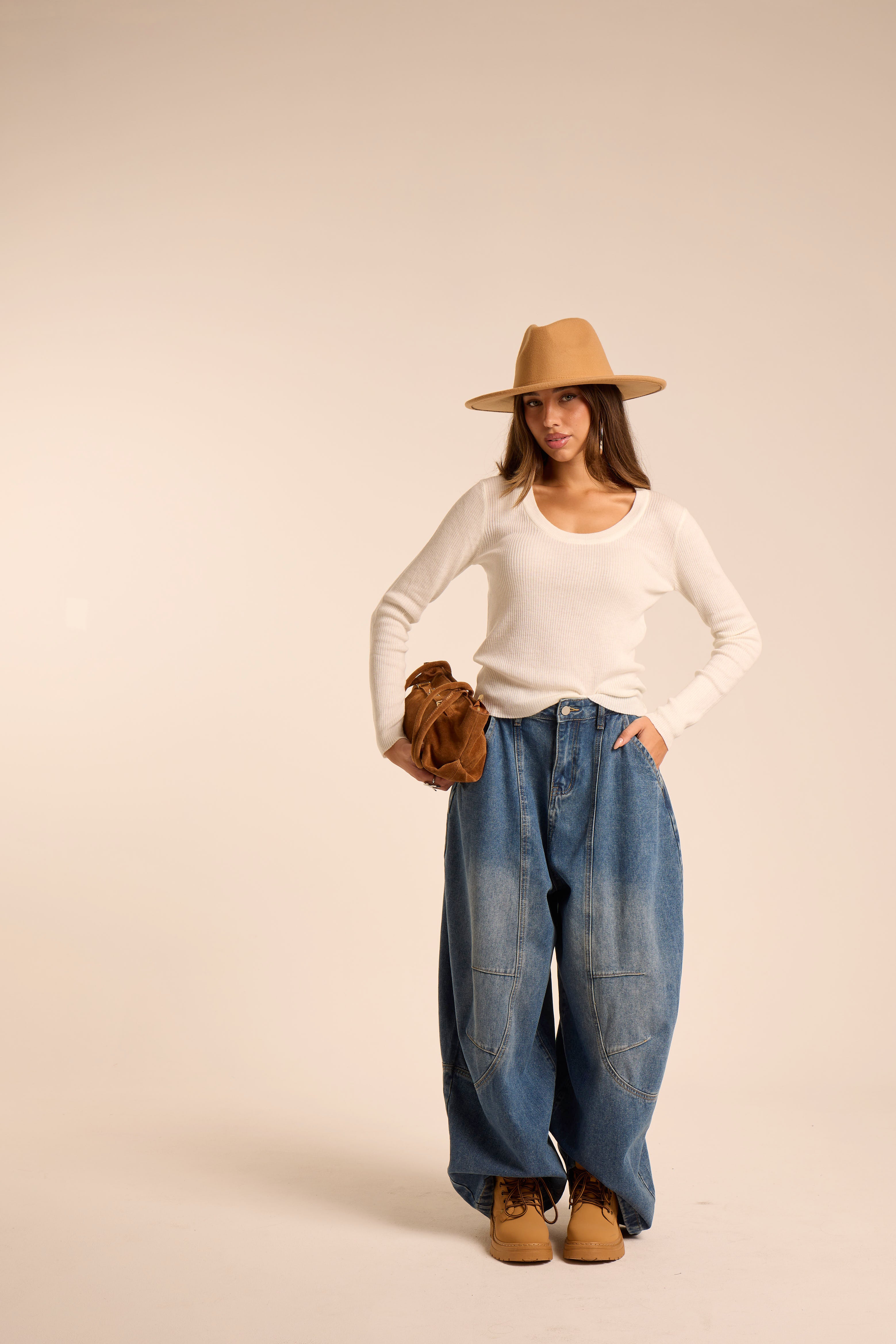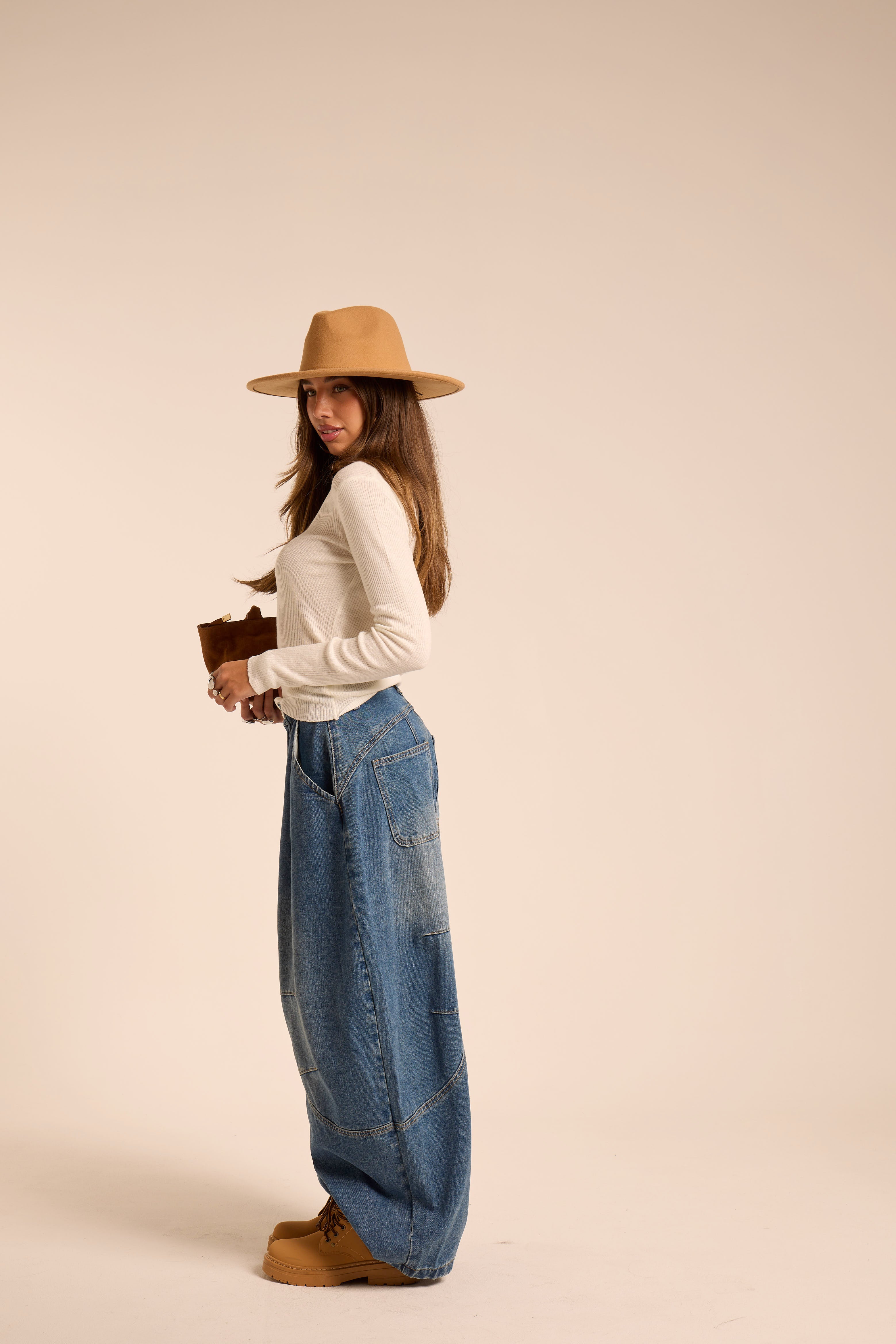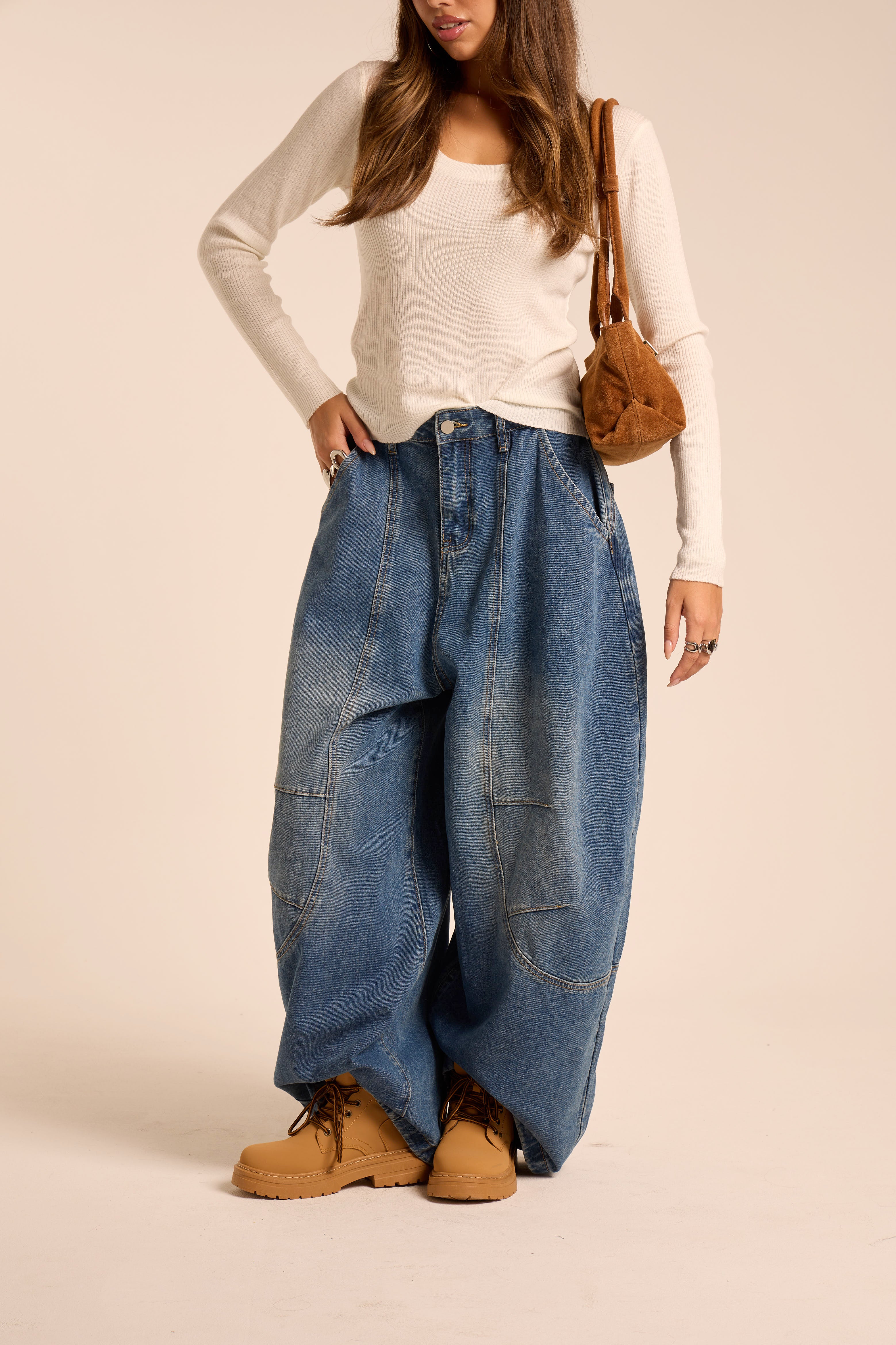 Jeans baggy extra balloon. Oversize. A 4 tasche. Passanti in vita per cintura. Chiusura con cerniera zip e bottone. Effetto leggermente slavato.