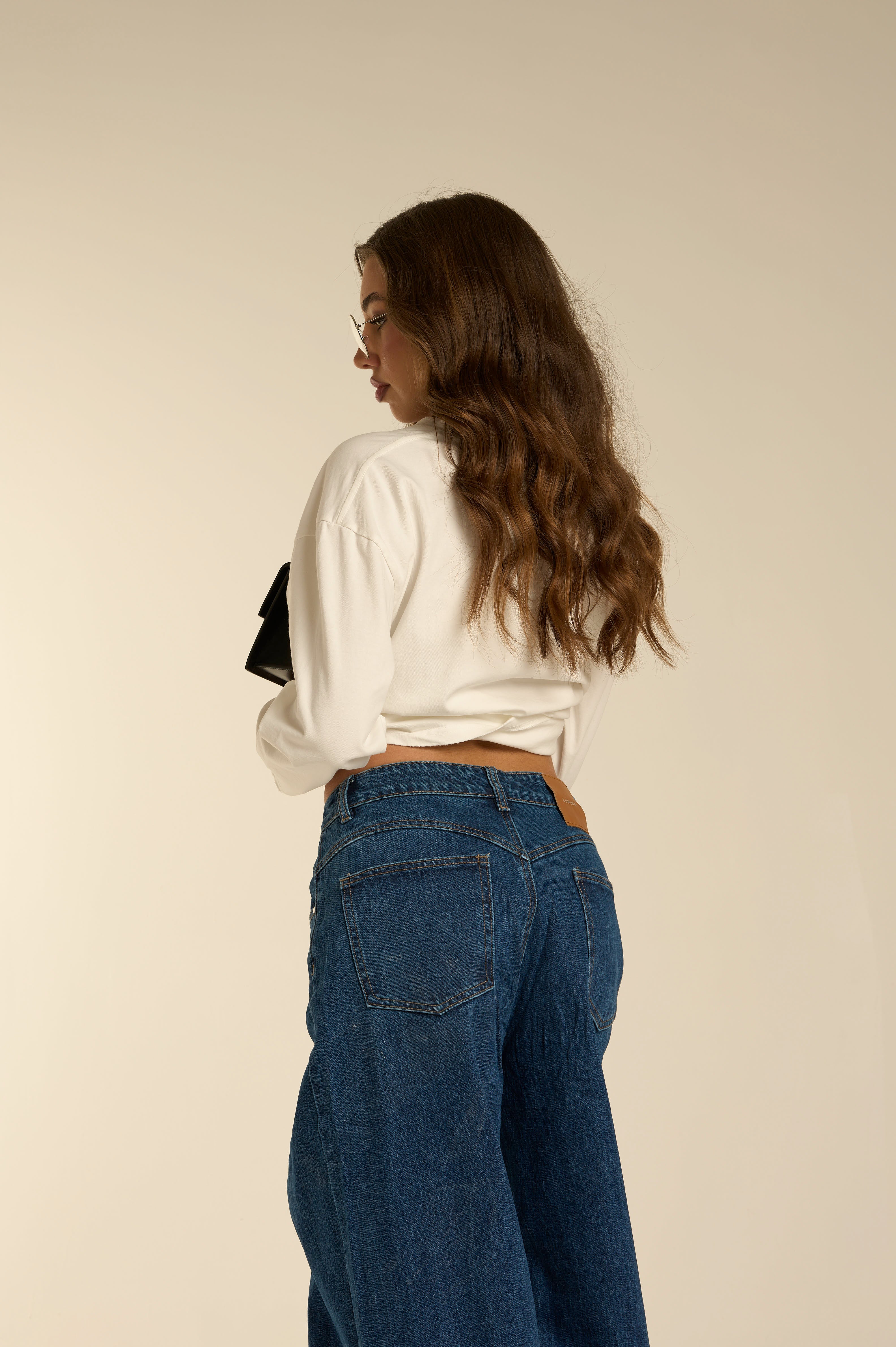 Jeans slavato a gamba dritta ampia. Relaxed fit. A 5 tasche. Passanti in vita per cintura. Dettaglio risvolto cucito. Chiusura con cerniera zip e bottone.