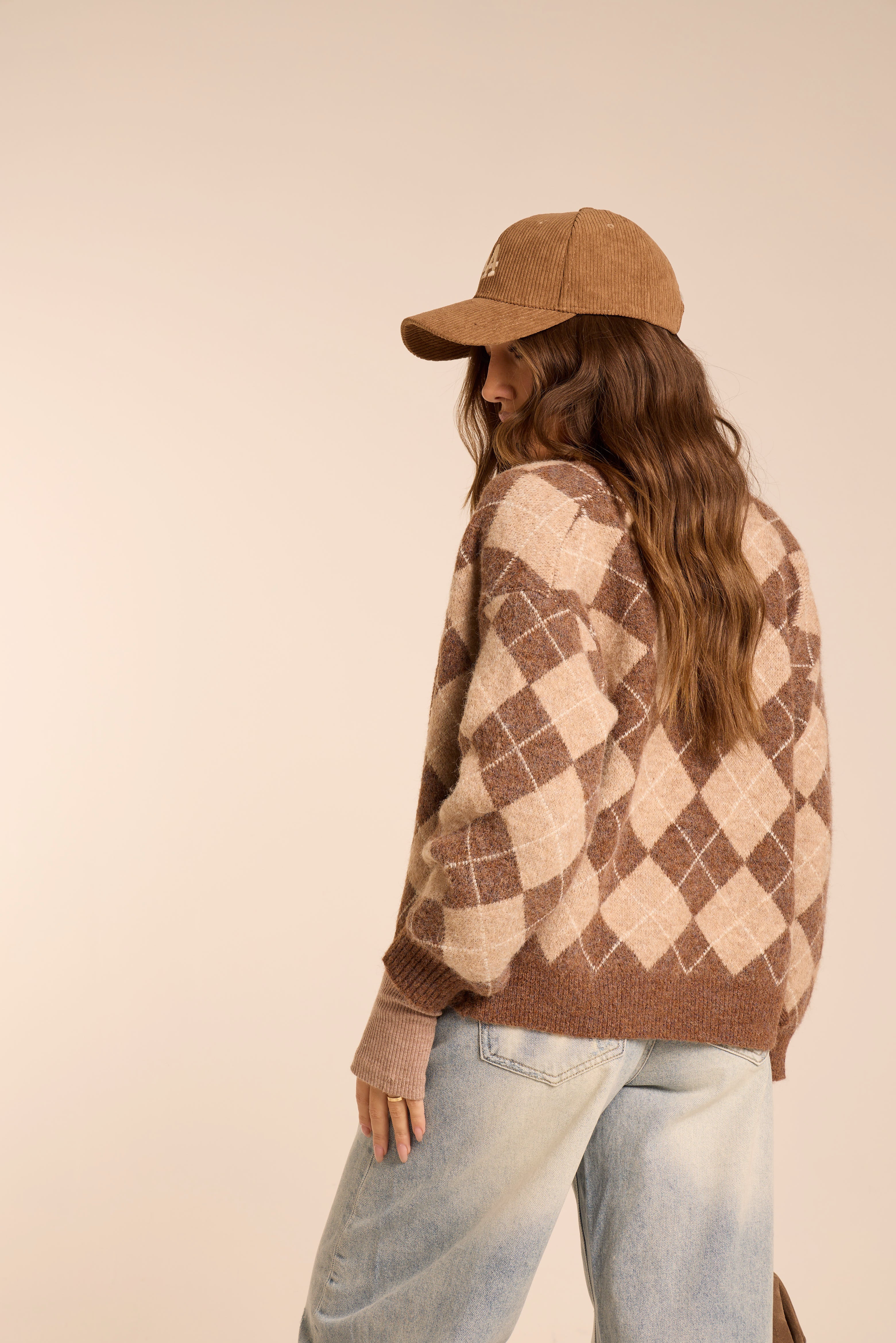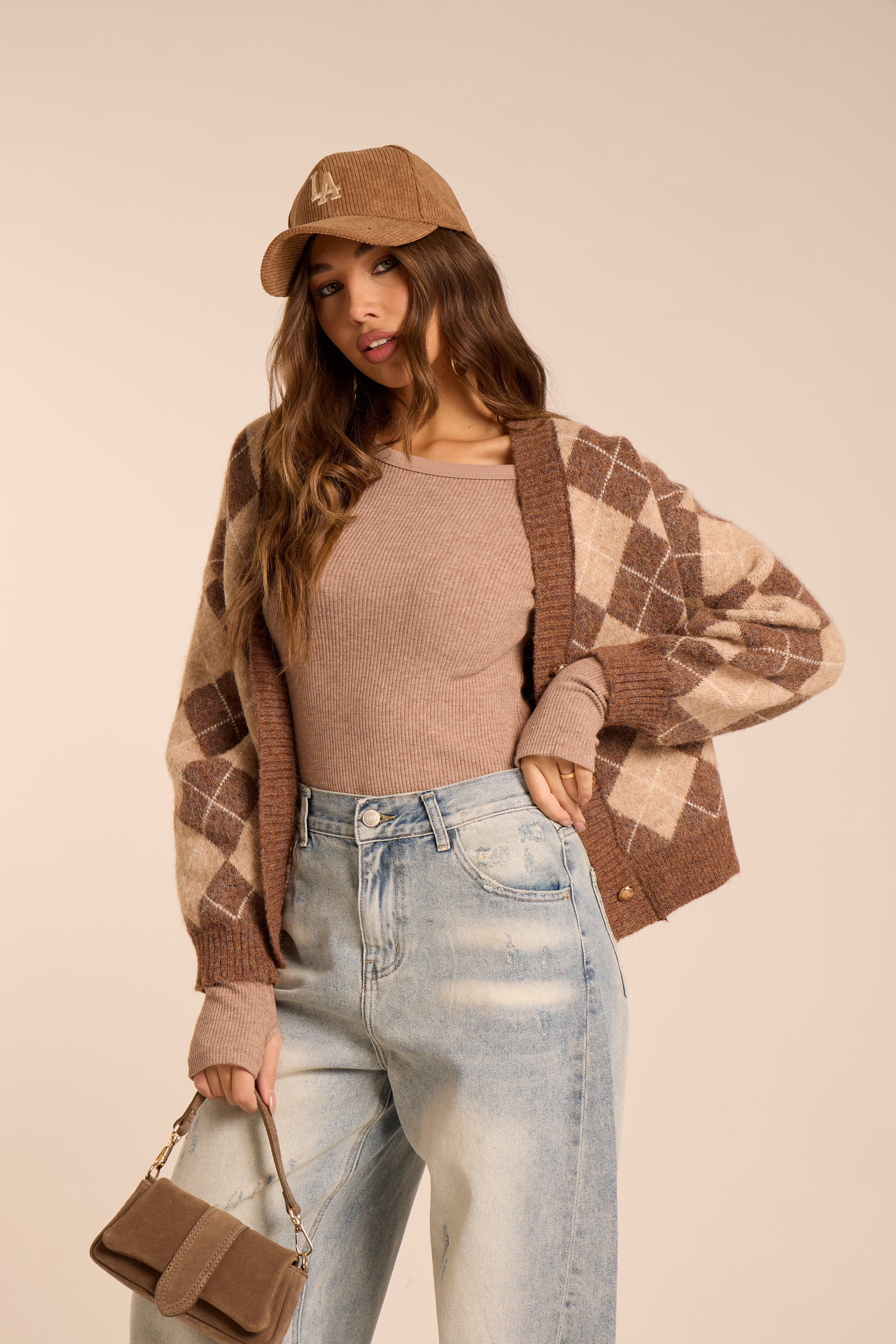 Cardigan in maglia. Effetto mohair. Oversize. Scollo a V. Chiusura con bottoni gioiello. Squadrato. Toni del beige, bianco e blu. Rifiniture a coste.