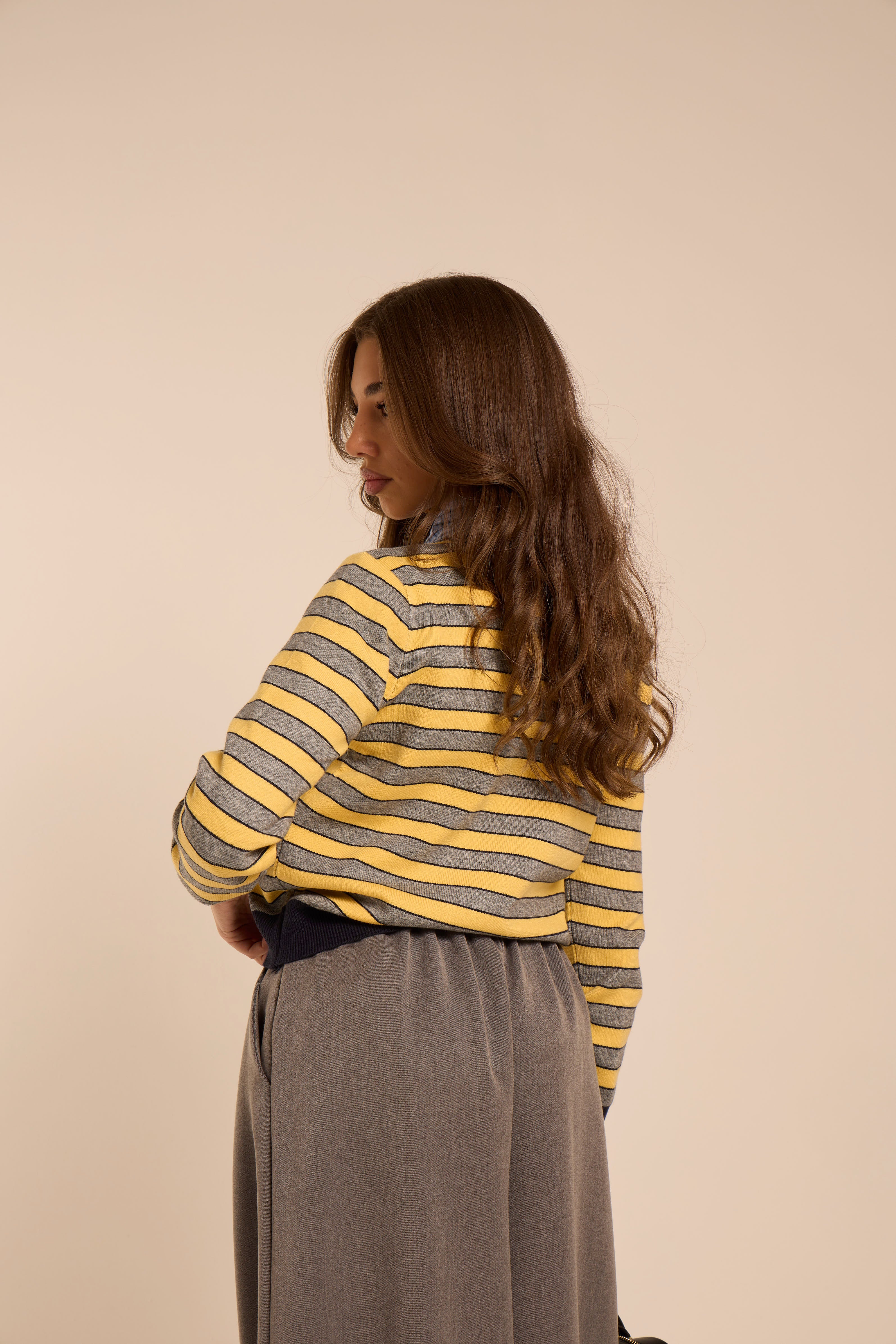 Cardigan in maglia fine. A righe orizzontali nei toni del giallo e grigio mélange, rifinito con profili e polsini in blu navy. Presenta una chiusura frontale con bottoni chiari e un piccolo dettaglio ricamato sul petto. Un modello morbido, leggero e versatile, perfetto per look casual raffinati.