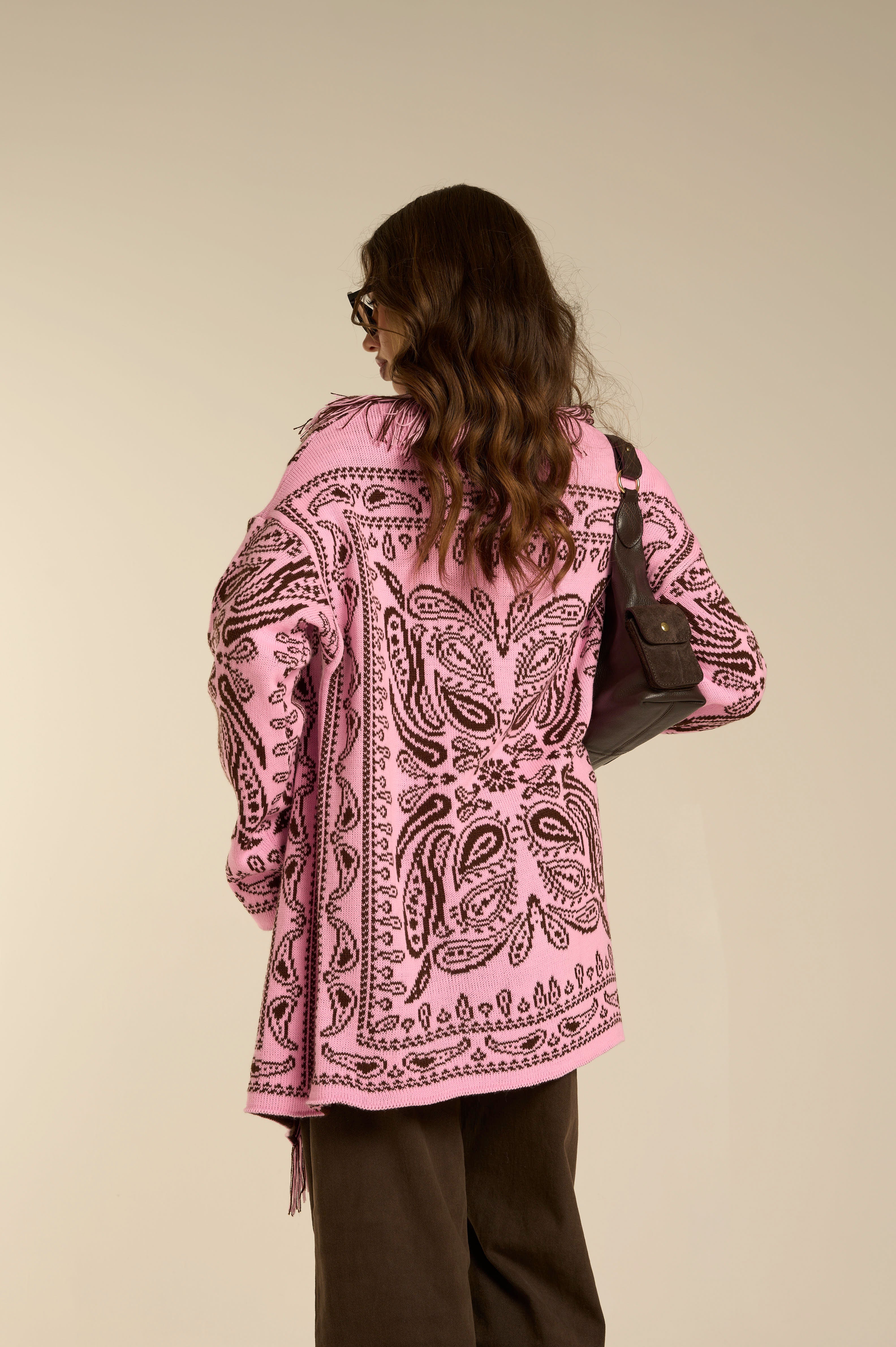 Cardigan in maglia a fantasia jacquard, caratterizzato da motivi geometrici nelle tonalità del rosa acceso e marrone. La lavorazione è morbida e avvolgente, con frange decorative sul davanti che donano un mood boho-chic e ricercato. Fit comodo e tessuto caldo.