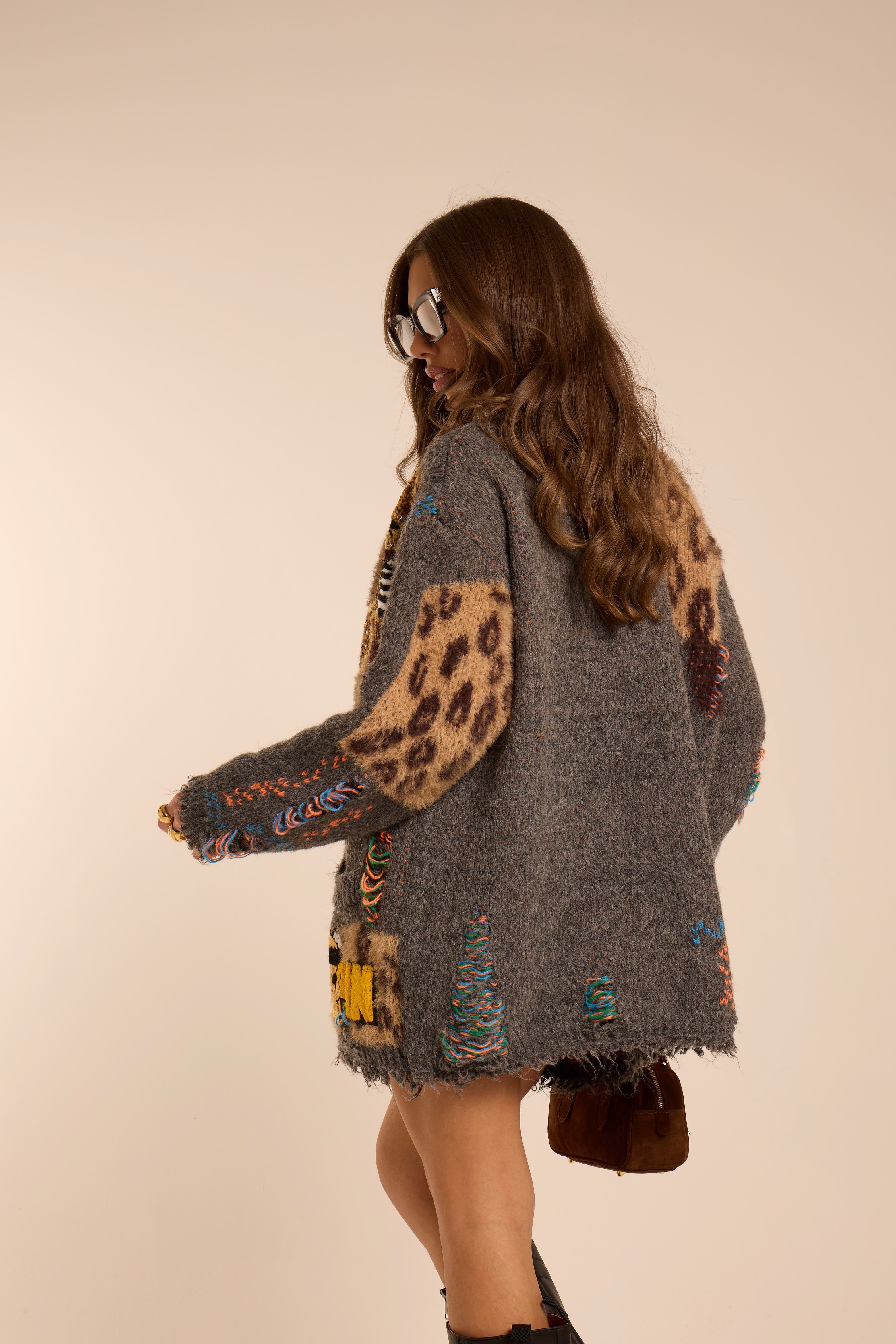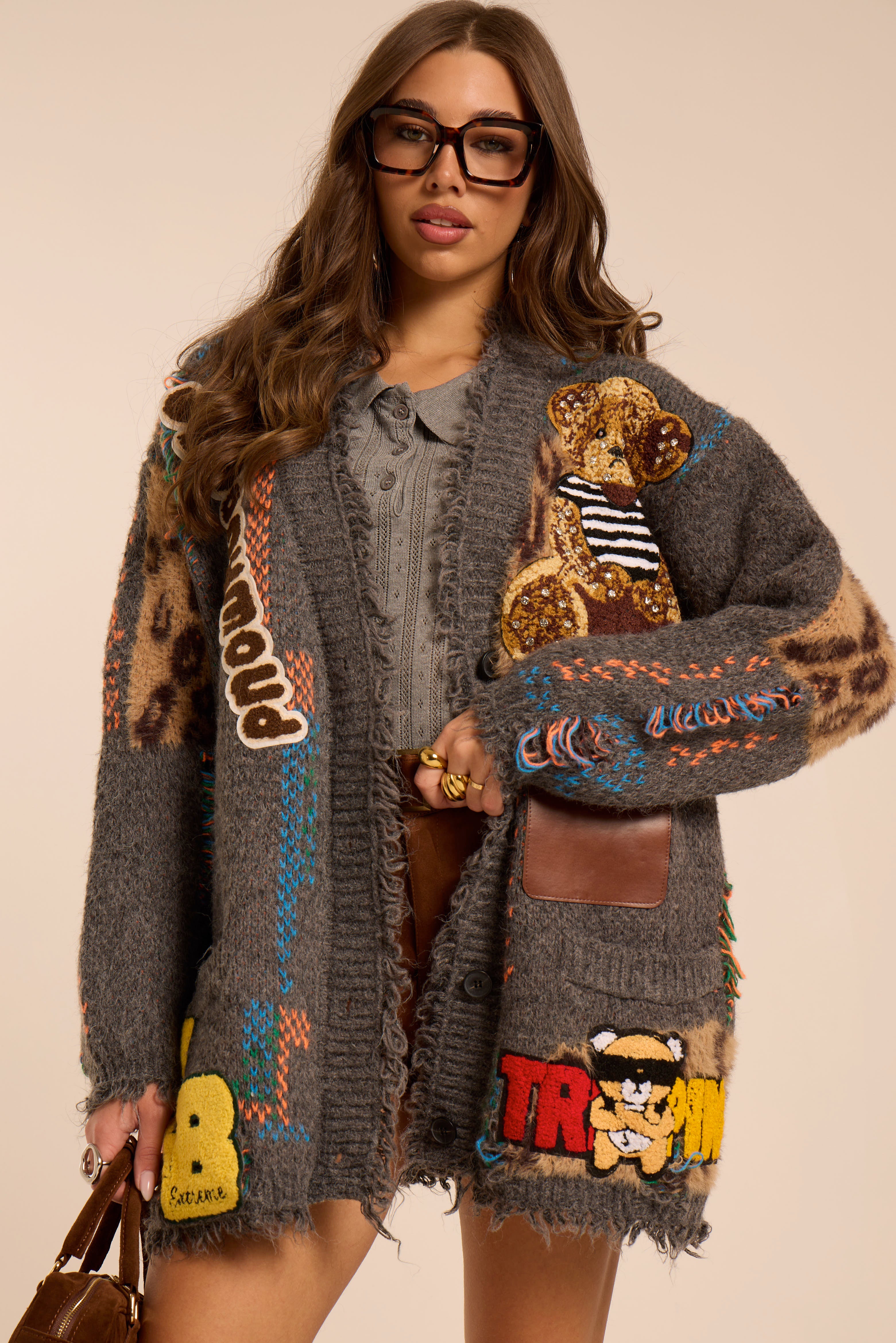 Cardigan oversize. A spalla bassa. Tasconi con patta parte frontale, in diversi tessuti. Trama multicolore. Chiusura con bottoni frontali. Dettagli toppe e ricami a contrasto colore.