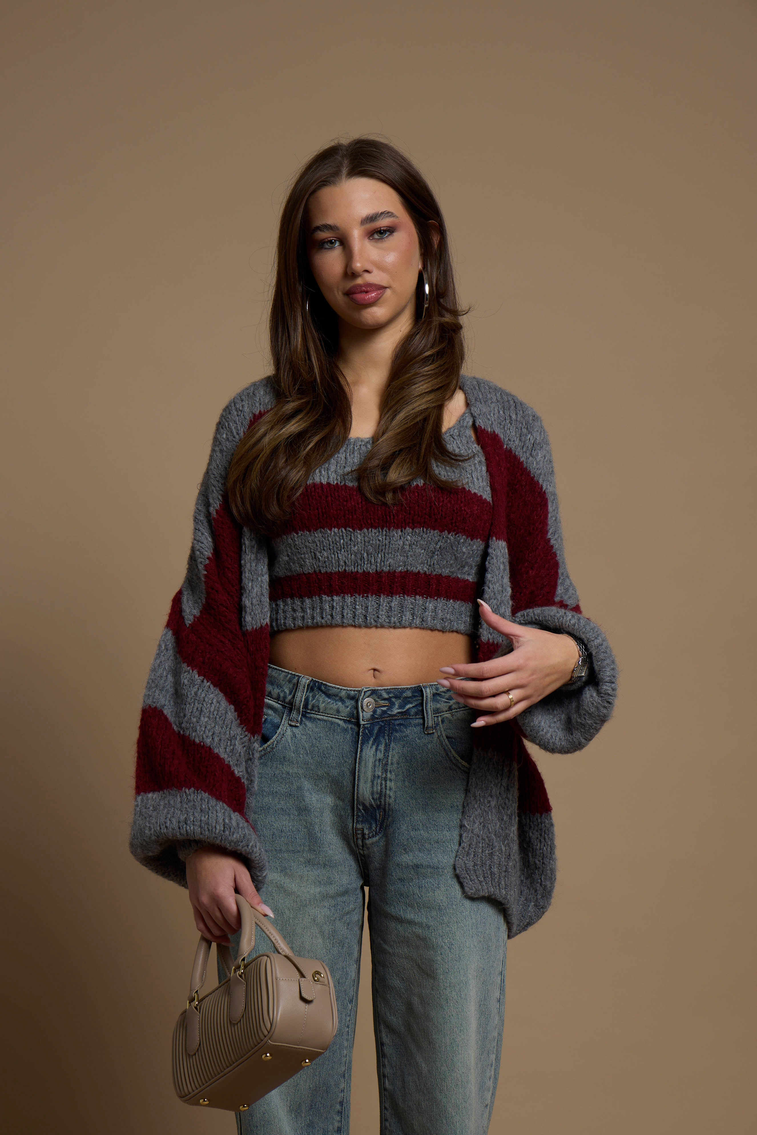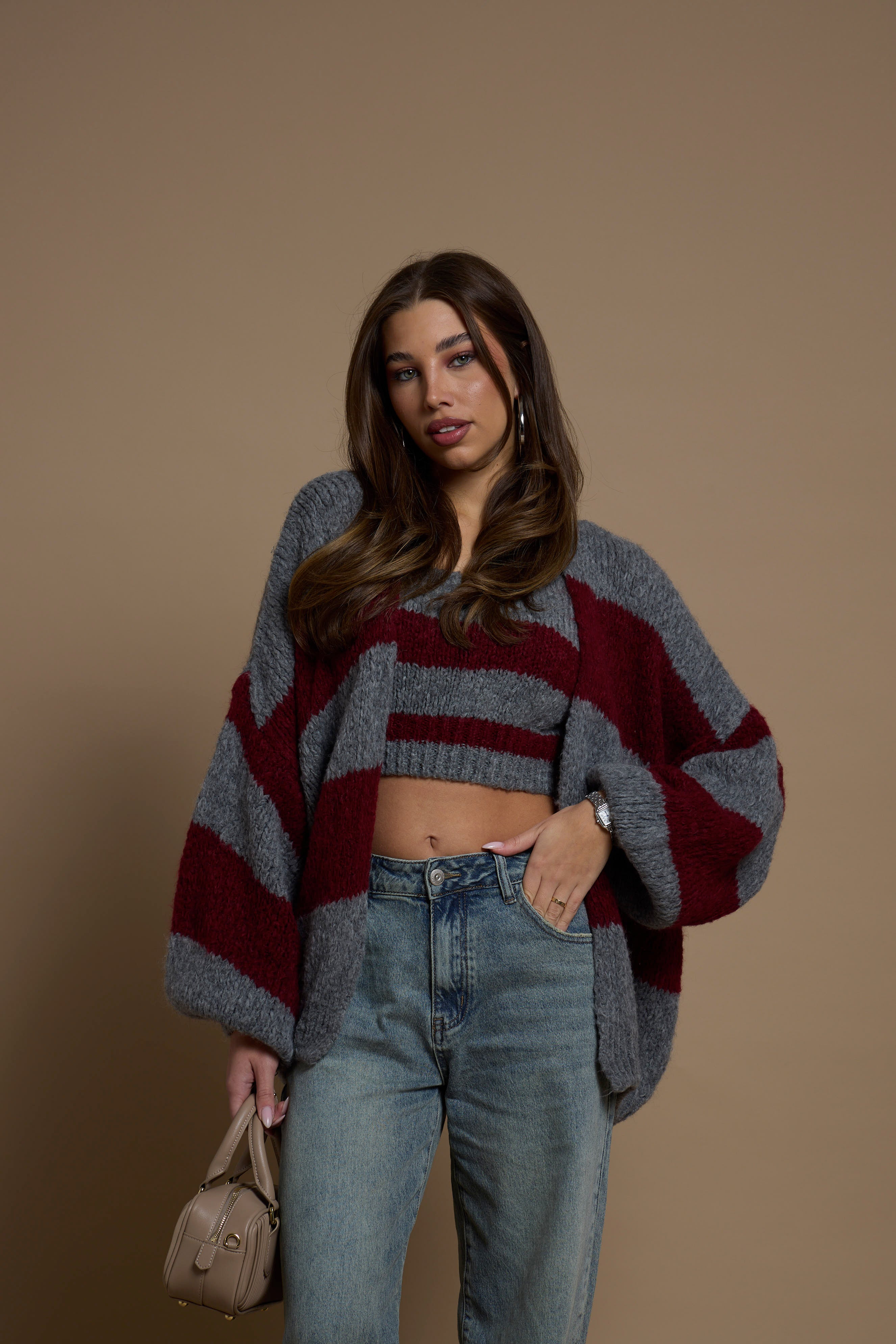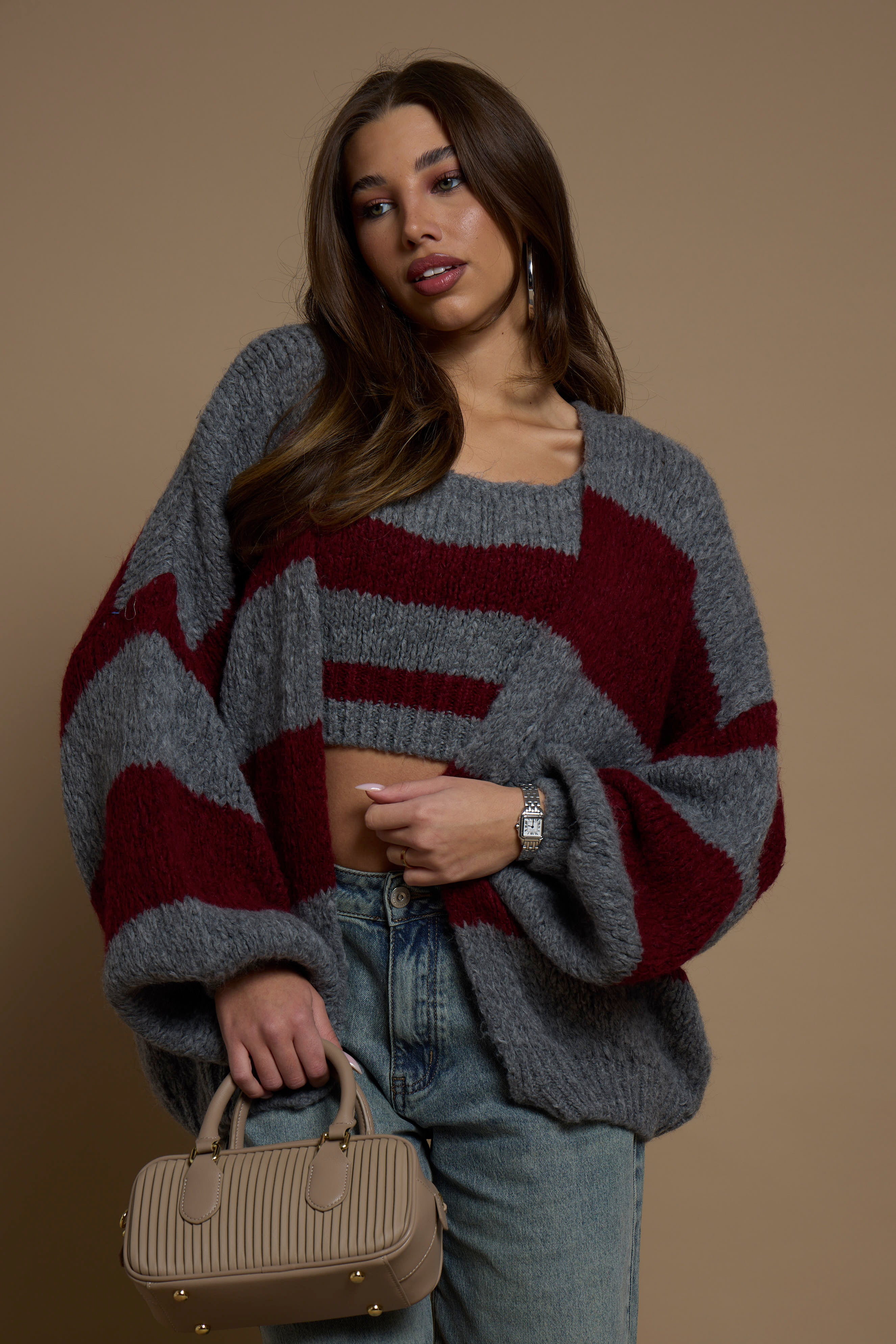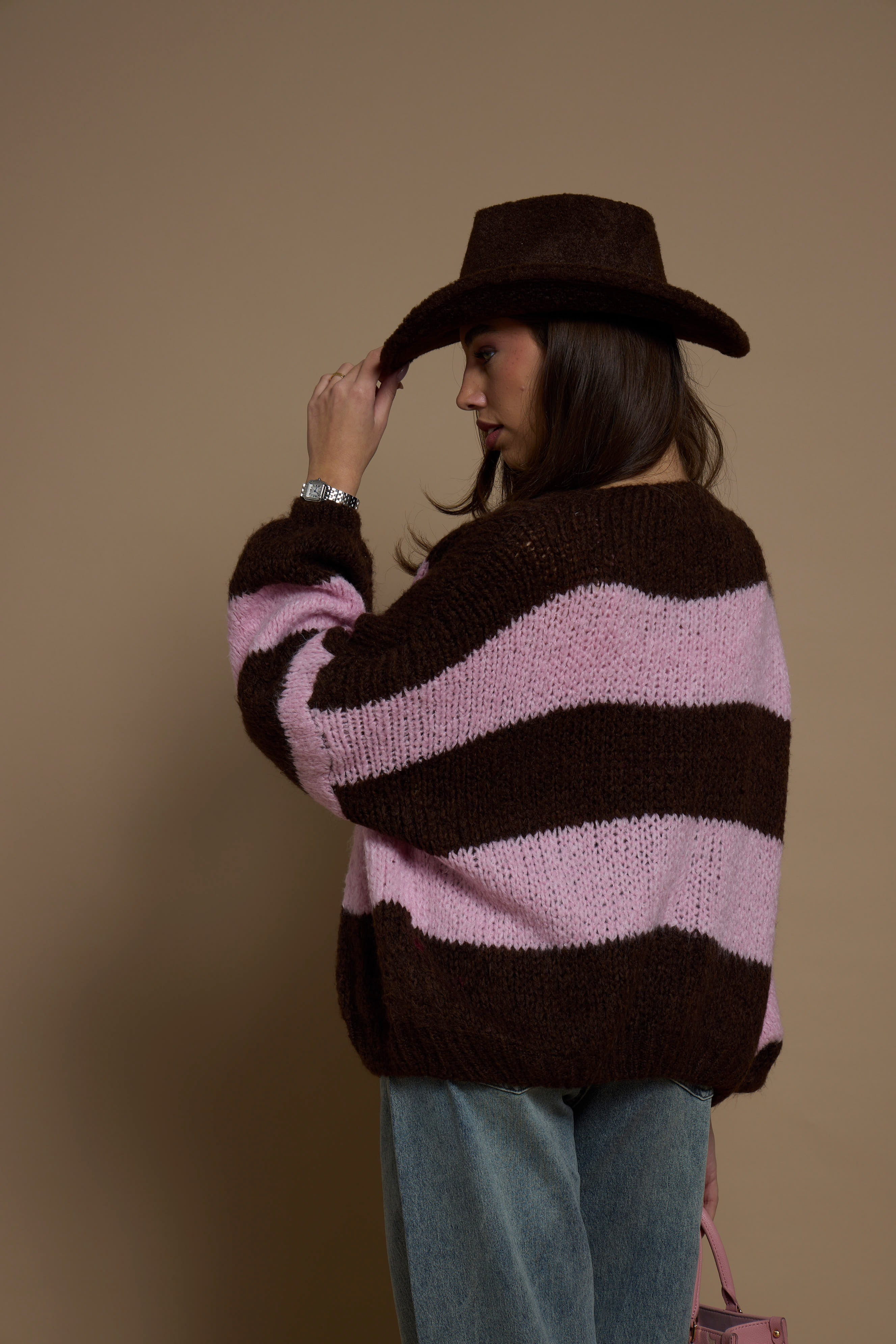 Set in maglia a righe marrone e rosa fluffy composto da cardigan aperto e top coordinato. Morbido, femminile e super trendy.