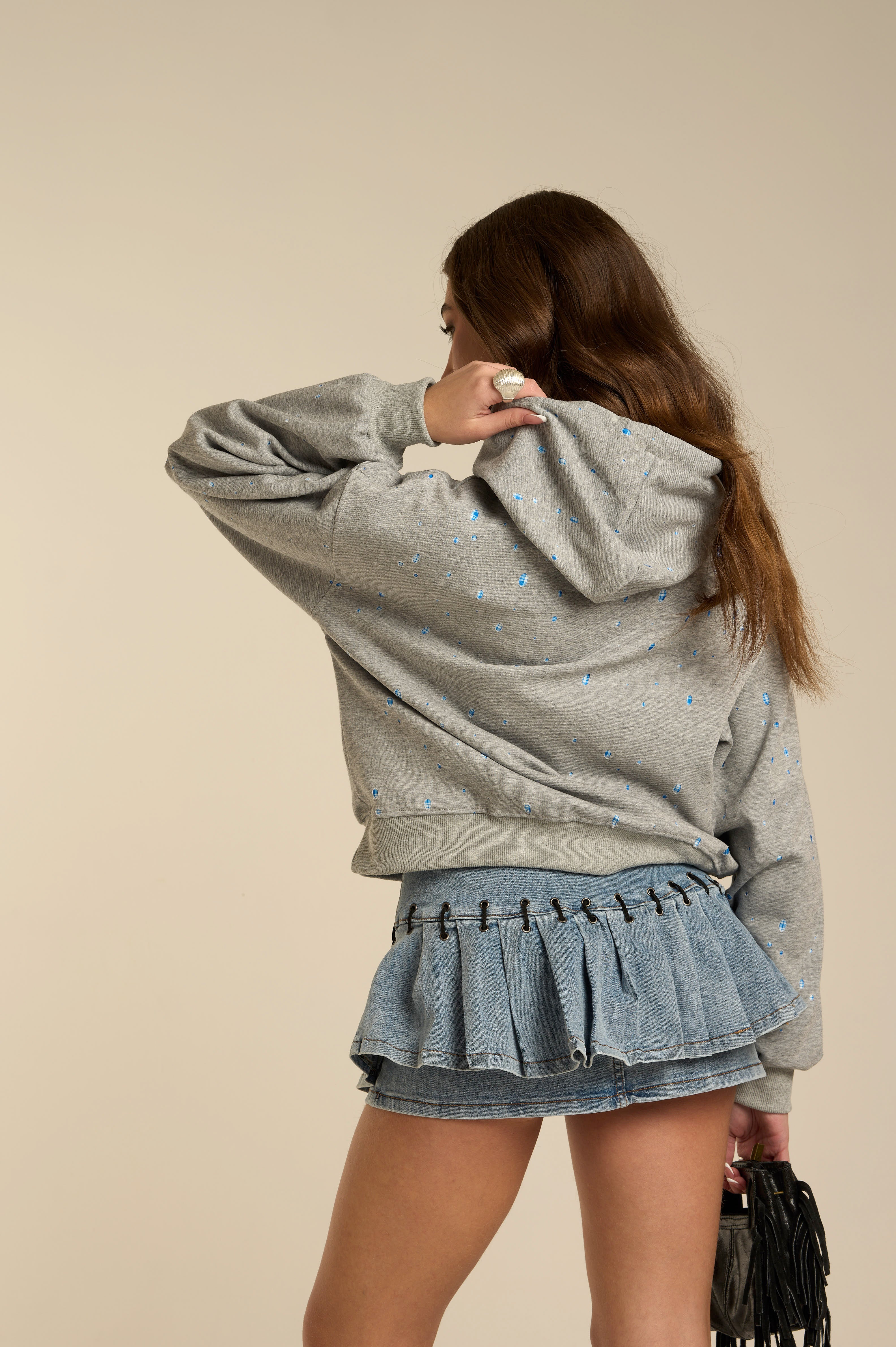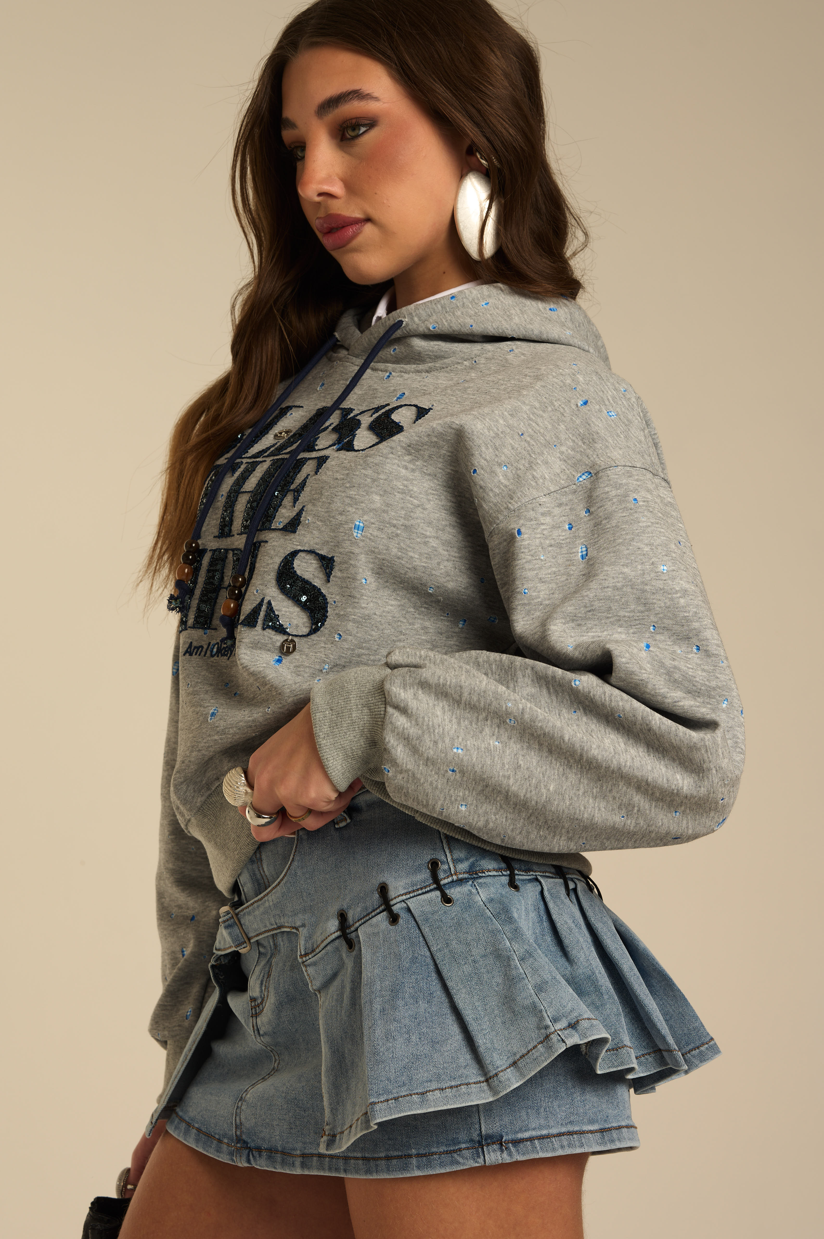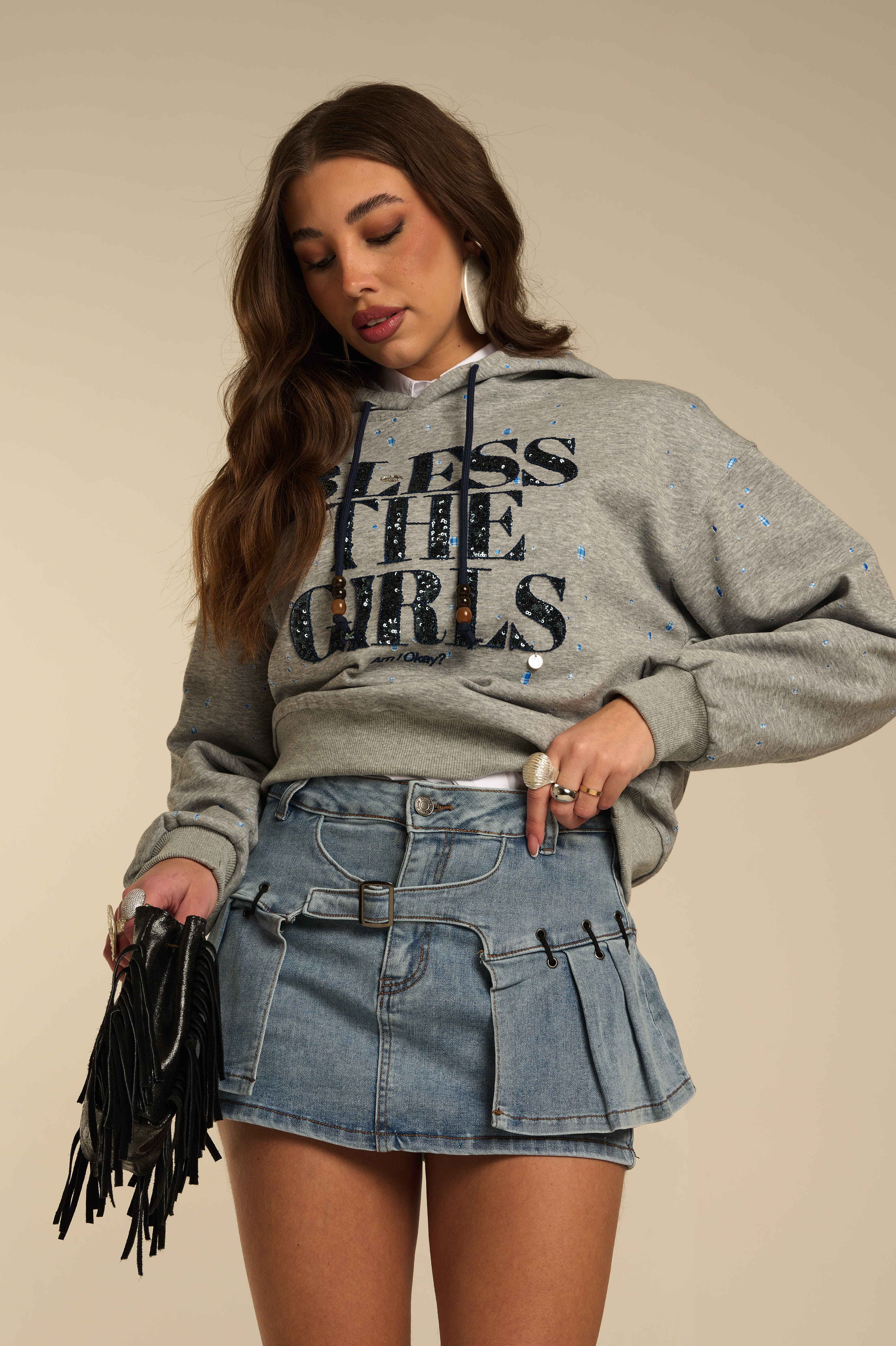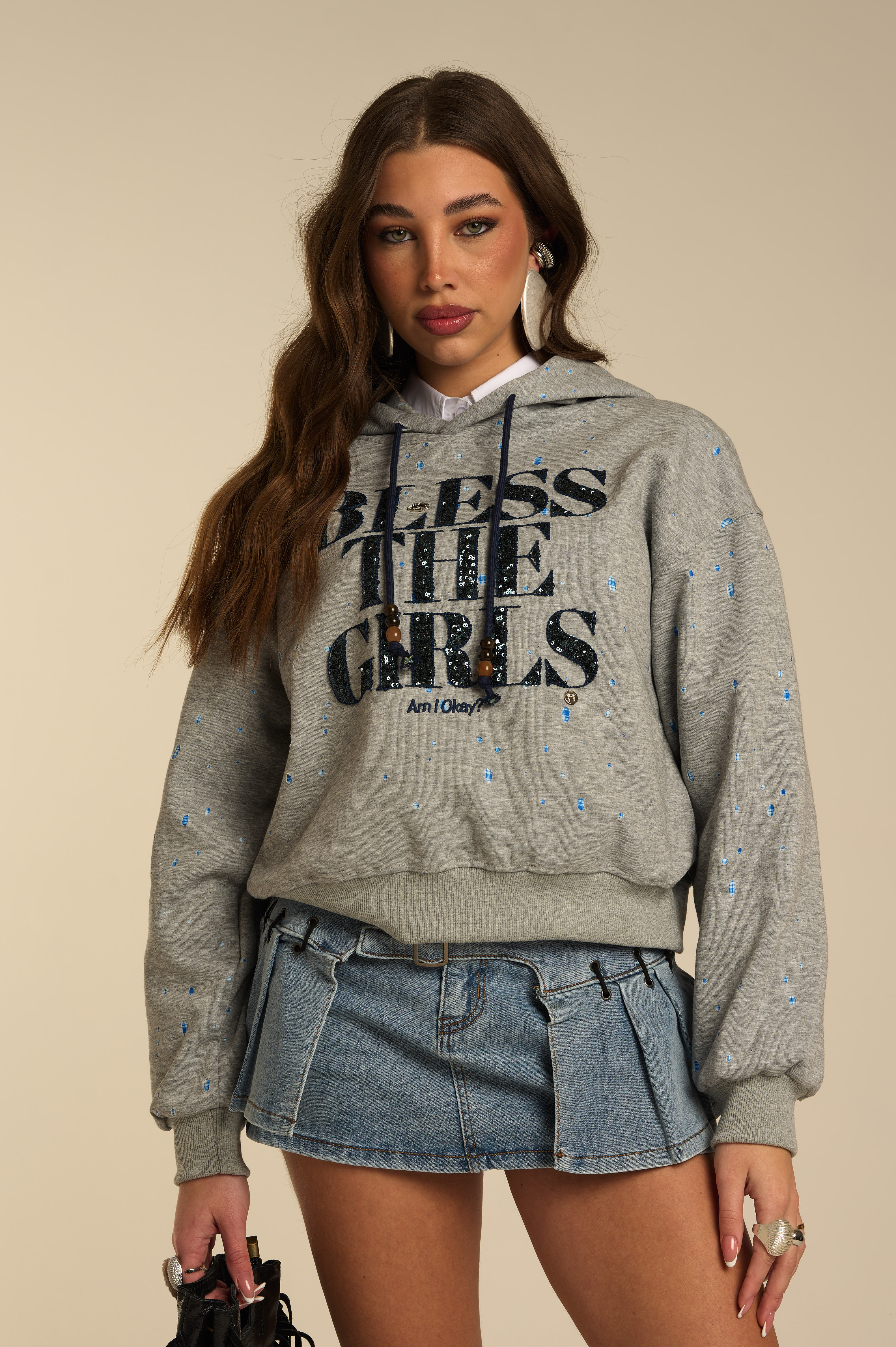 Felpa in cotone morbido con vestibilità relaxed, cappuccio regolabile e stampa frontale “Bless the Girls” dal carattere bold e urbano. Dettagli effetto splatter a contrasto che aggiungono un mood street-cool e vissuto. Polsini e fondo elasticizzati.