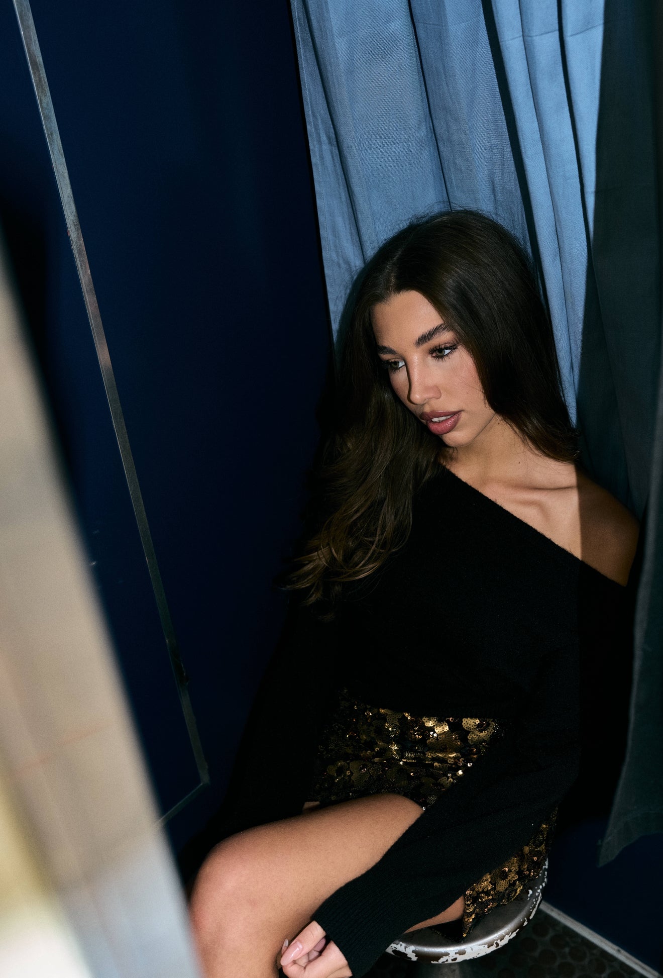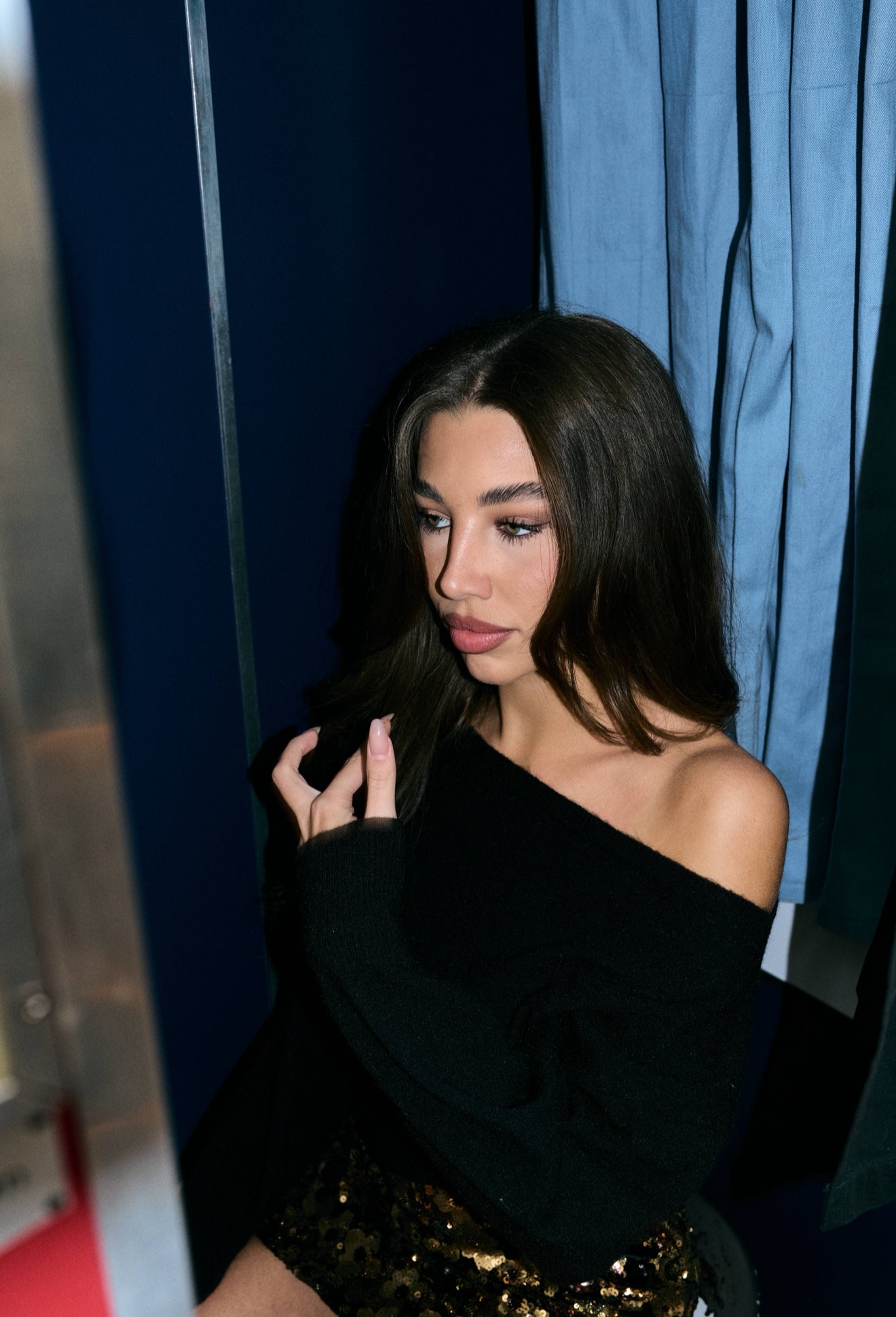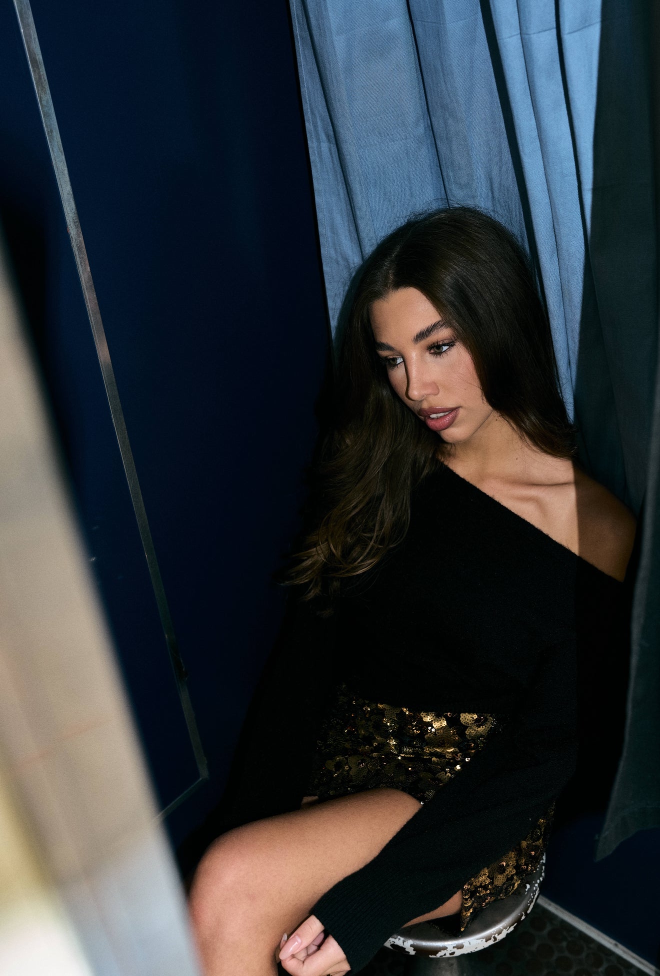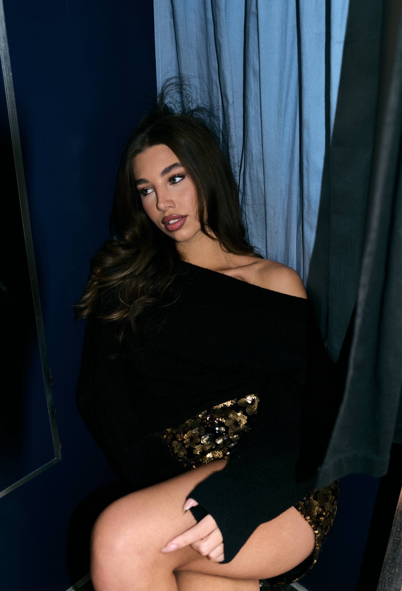 Maglia nera in maglia morbida con scollo monospalla, silhouette femminile e vibe super chic. Un capo versatile che aggiunge carattere anche al look più semplice, perfetto sia con denim che con pezzi più glam.