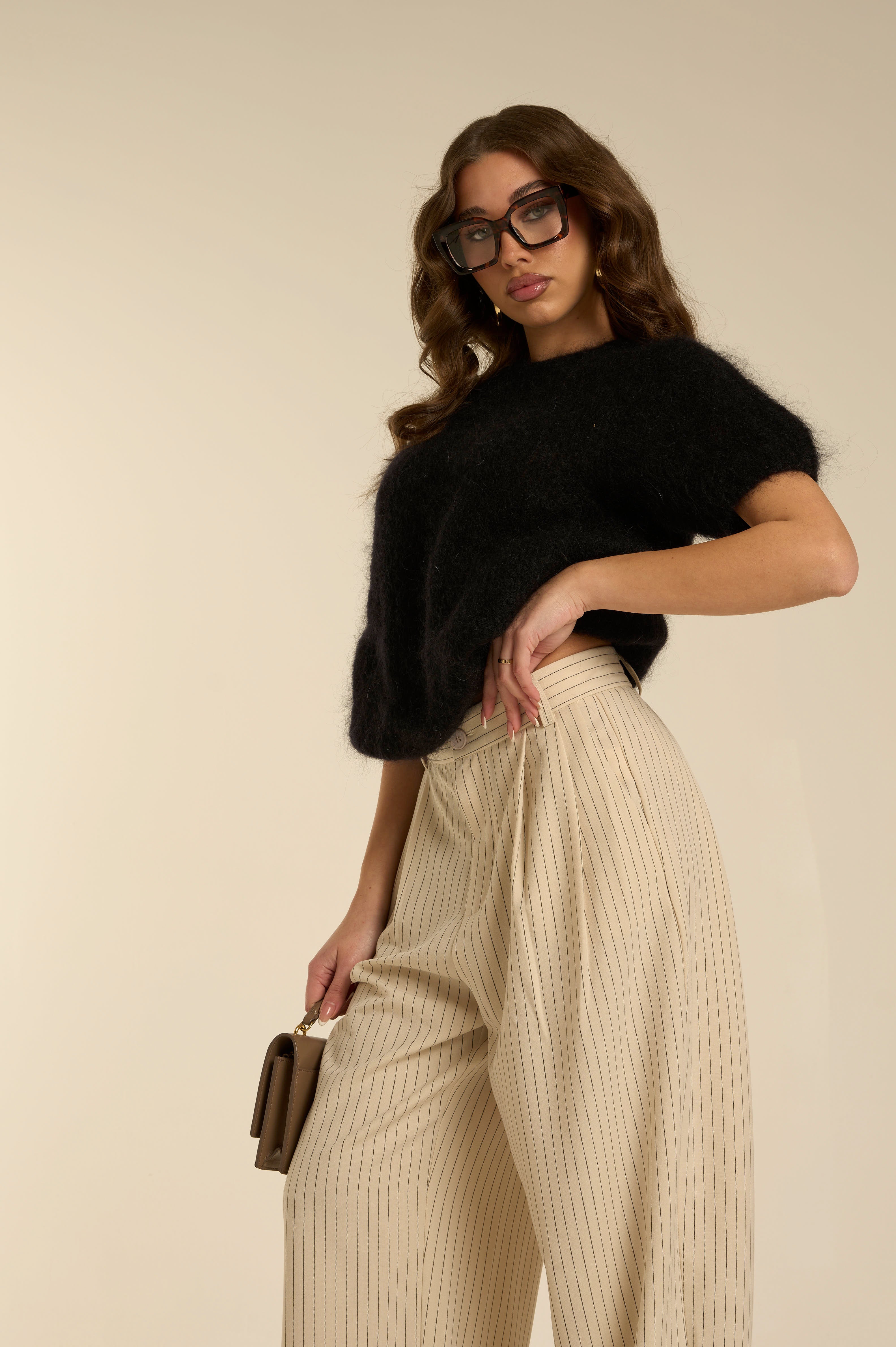 Pantalone sartoriale a vita alta color sabbia con sottili righe verticali a contrasto colore. Gamba ampia e fluida con pieghe frontali che valorizzano la linea. Chiusura con bottone e tasche laterali. Elegante, strutturato, dal taglio raffinato.