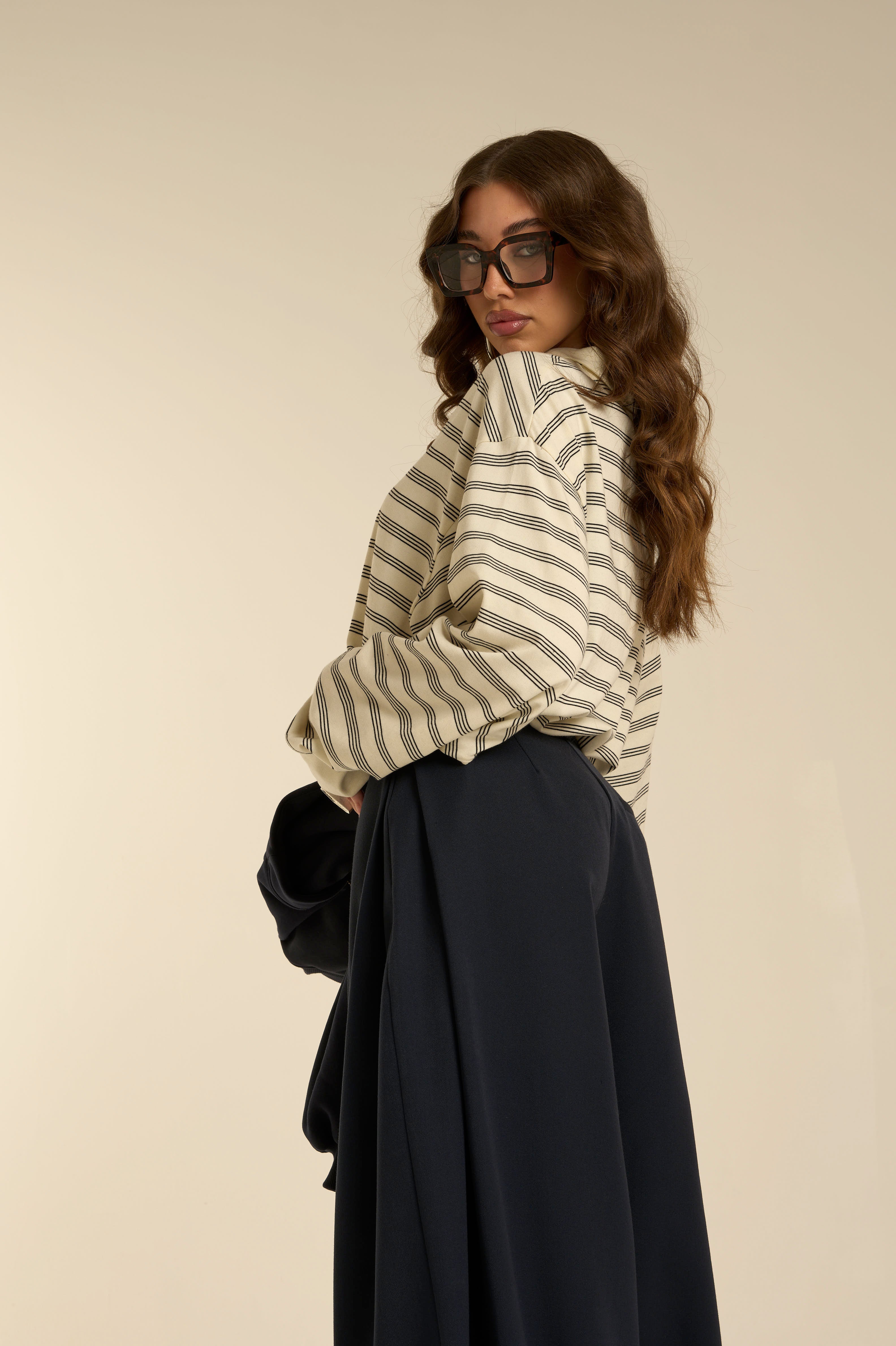 Pantalone a vita alta color blu navy con gamba extra wide e caduta fluida. Linea morbida e ampia che crea movimento, struttura minimal senza dettagli evidenti. Fit rilassato dal carattere urbano e sofisticato. Tasche laterali in linea. Chiusura con cerniera zip e bottone.