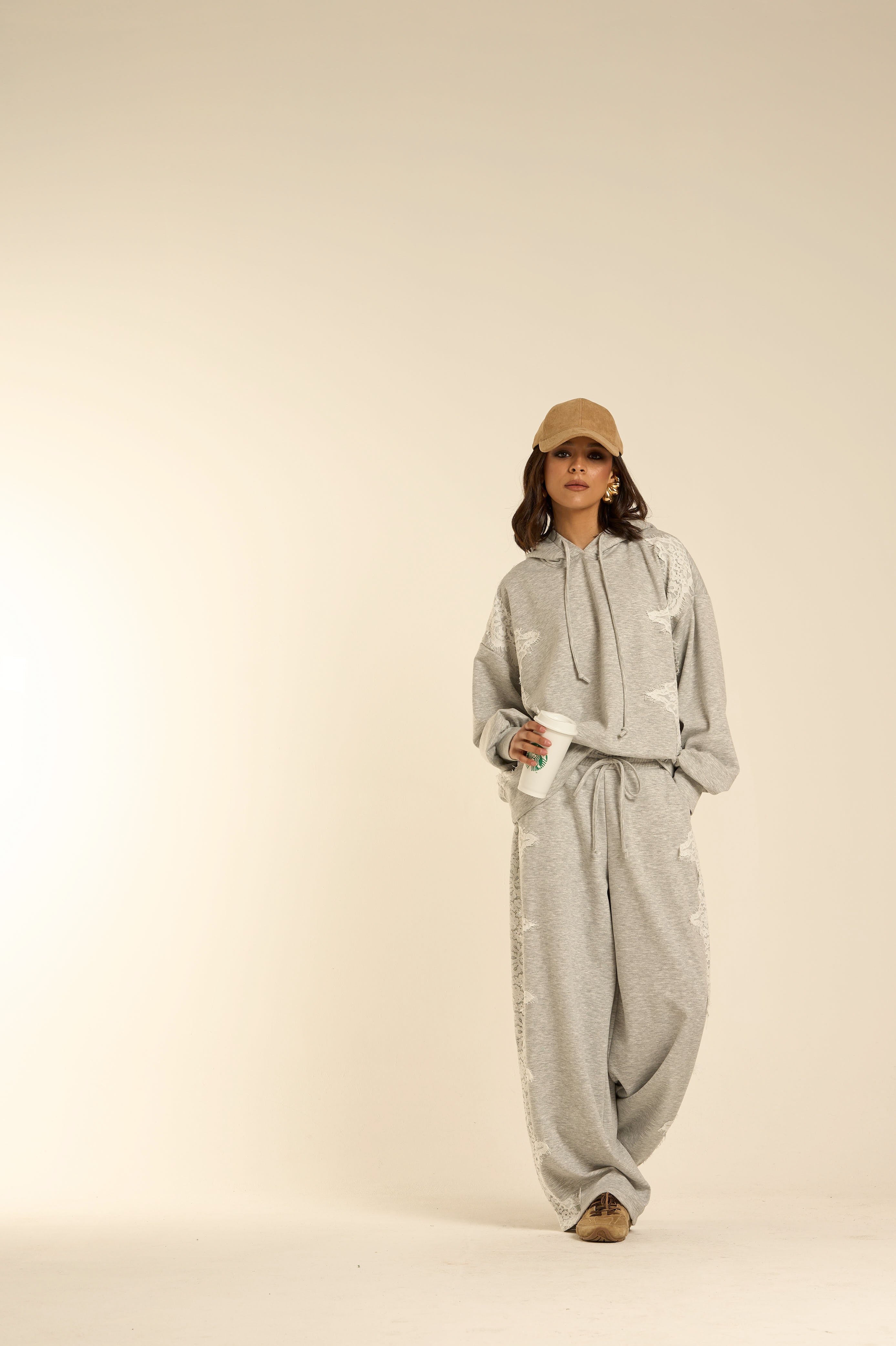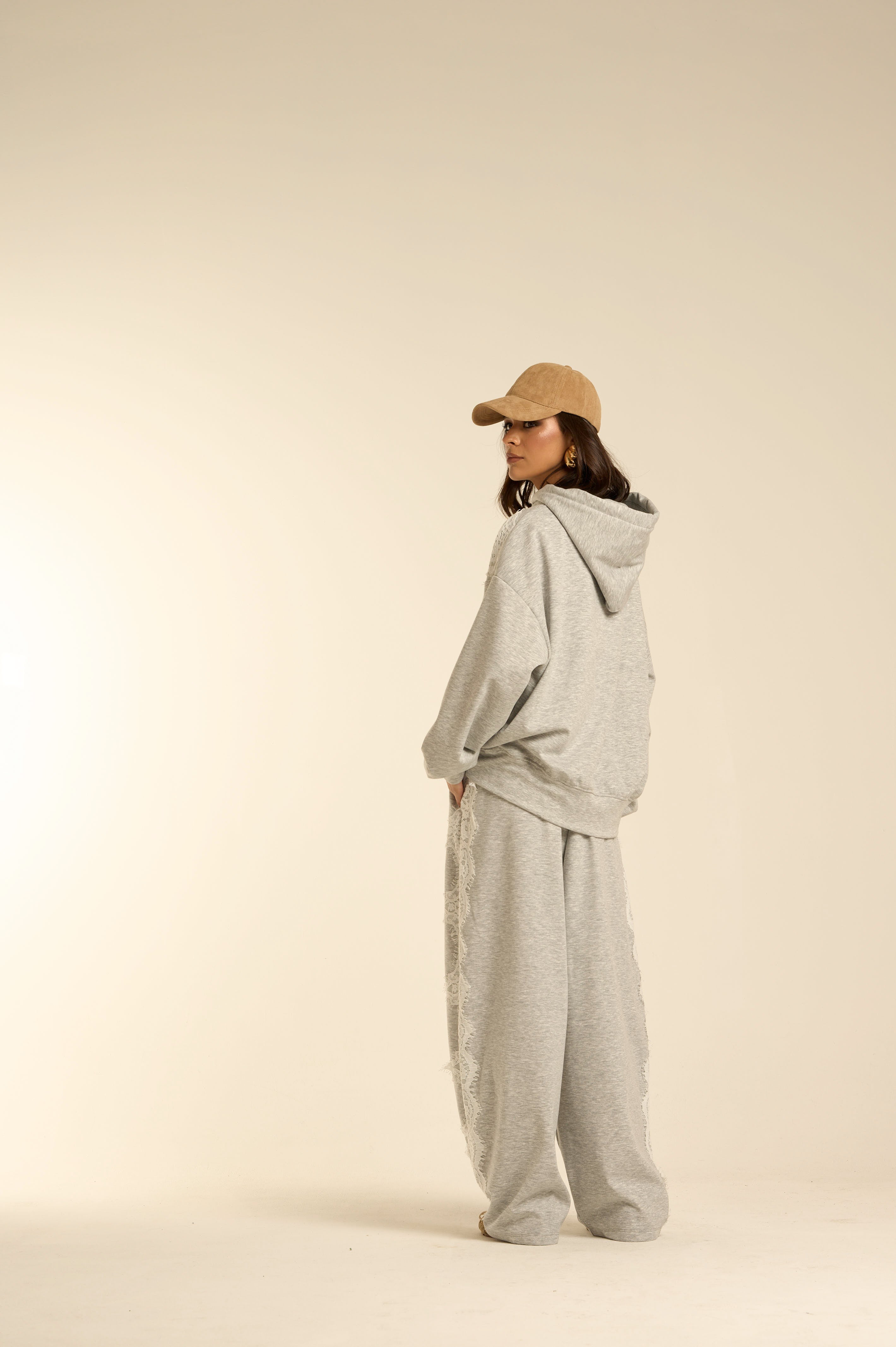 Pantalone ampio in felpa grigio melange, modello palazzo con gamba larga e caduta fluida. Vita elasticizzata con coulisse regolabile. Linea morbida sui fianchi che scende dritta fino al fondo, creando movimento e slancio visivo.