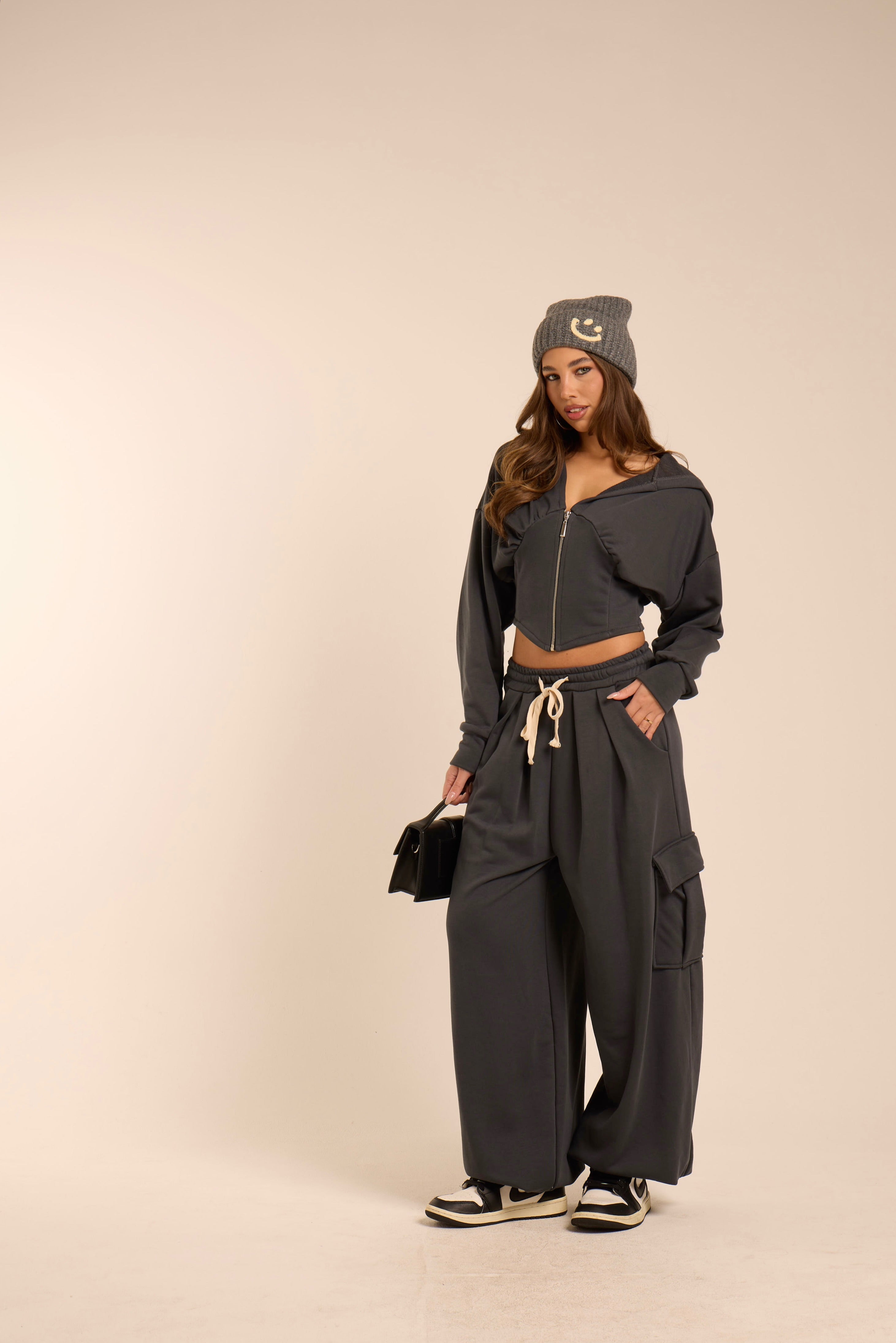Completo in jersey ultra-morbido dal taglio rilassato: felpa cropped con zip e cappuccio e pantaloni cargo wide. Minimalismo metropolitano, comfort di lusso.