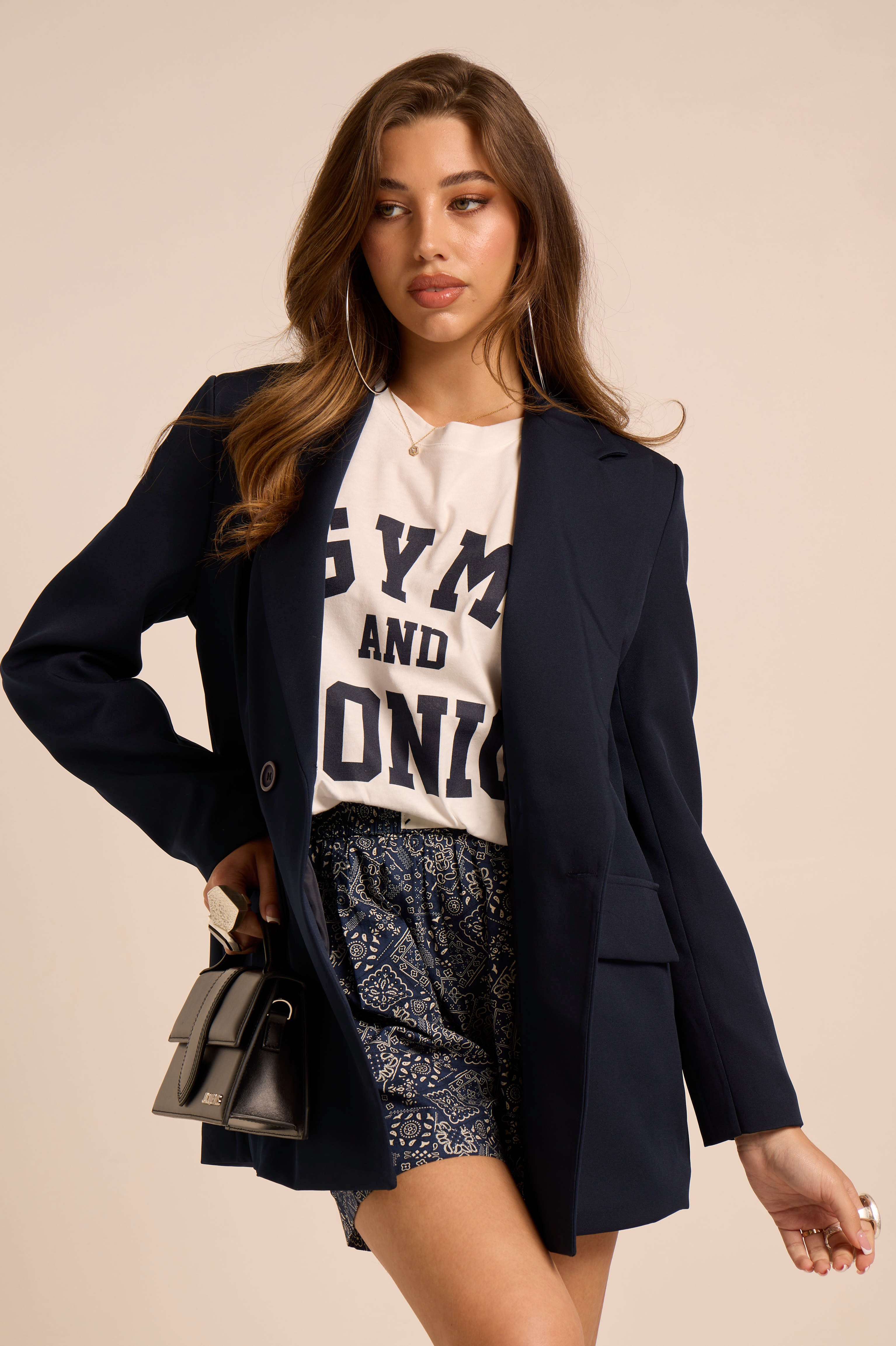 Blazer oversize. Spallina imbottita. Foderata. Chiusura ad intreccio. Bottoni tono su tono. Tasche con patta finte e tasca in linea.