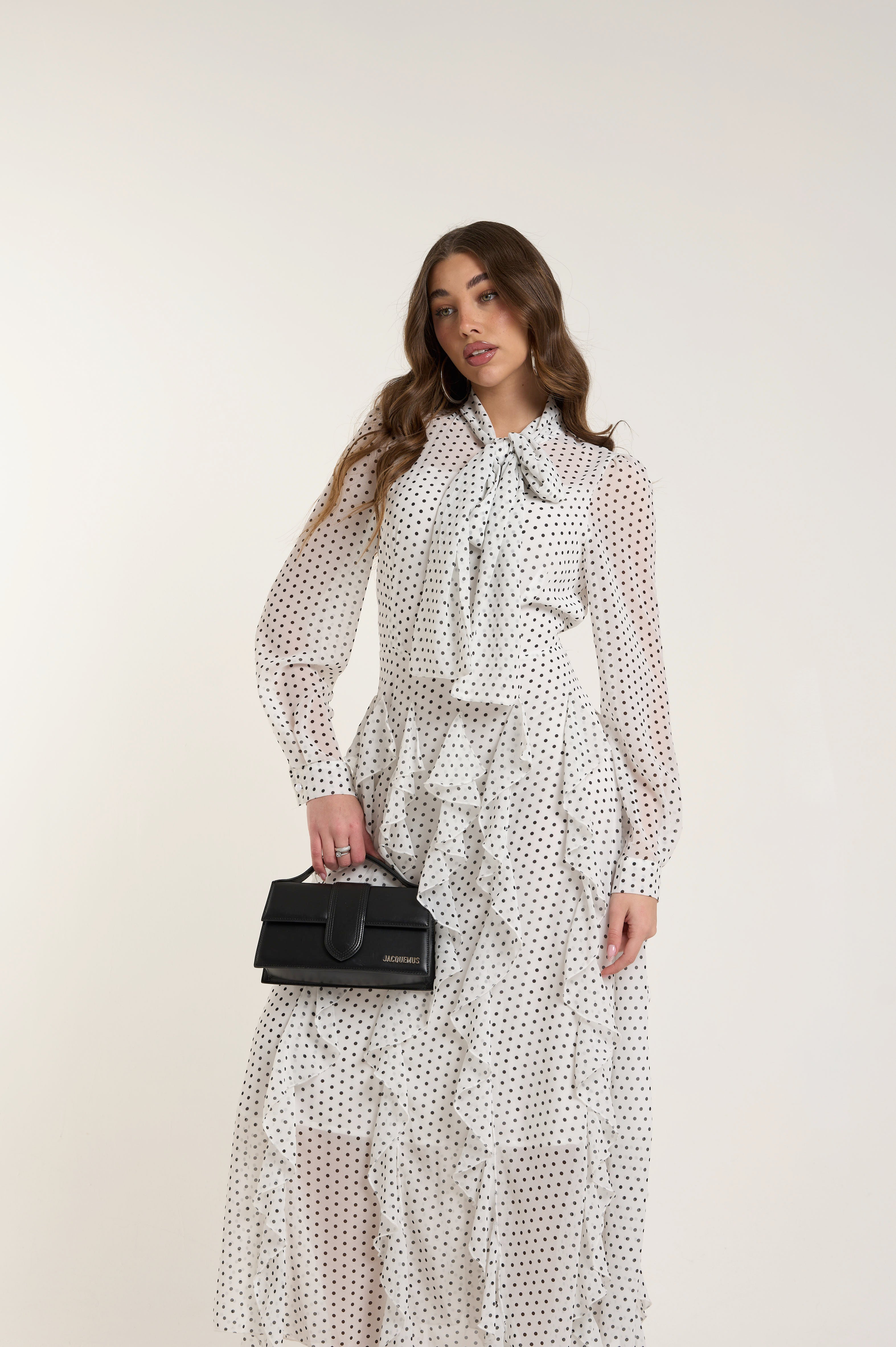 Abito lungo in tessuto leggero e fluido. Fantasia a pois piccoli. Collo con fiocco, dettaglio femminile e raffinato. A manica lunga leggermente a palloncino e polsino regolabile. Gonna lunga con balze morbide per movimento e leggerezza. Foderato.