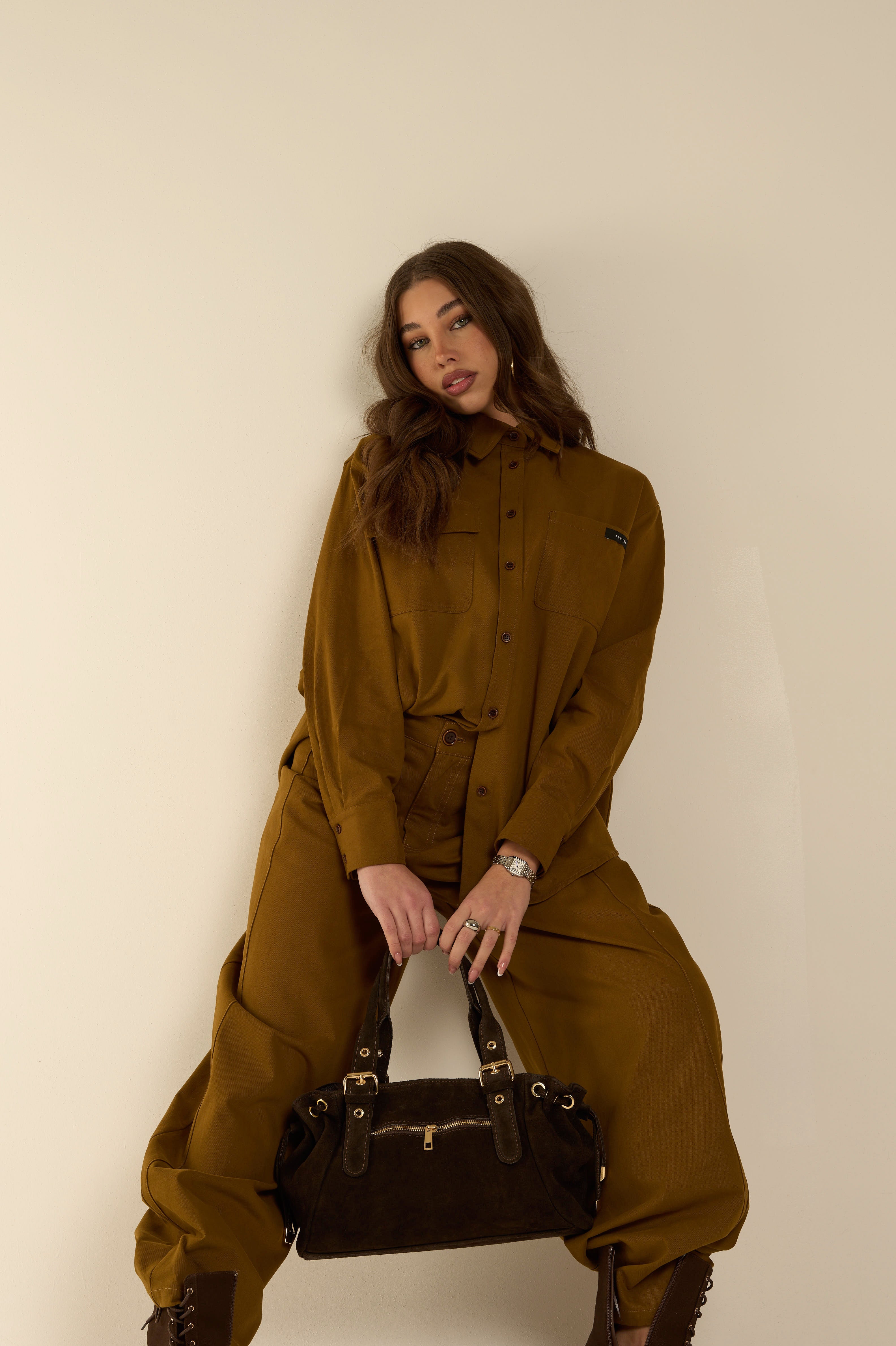 Camicia donna in tessuto strutturato, colore terra calda. Linea regolare con vestibilità leggermente morbida. Collo classico, chiusura frontale con bottoni tono su tono. Taschino applicato sul petto. Maniche lunghe con polsino.