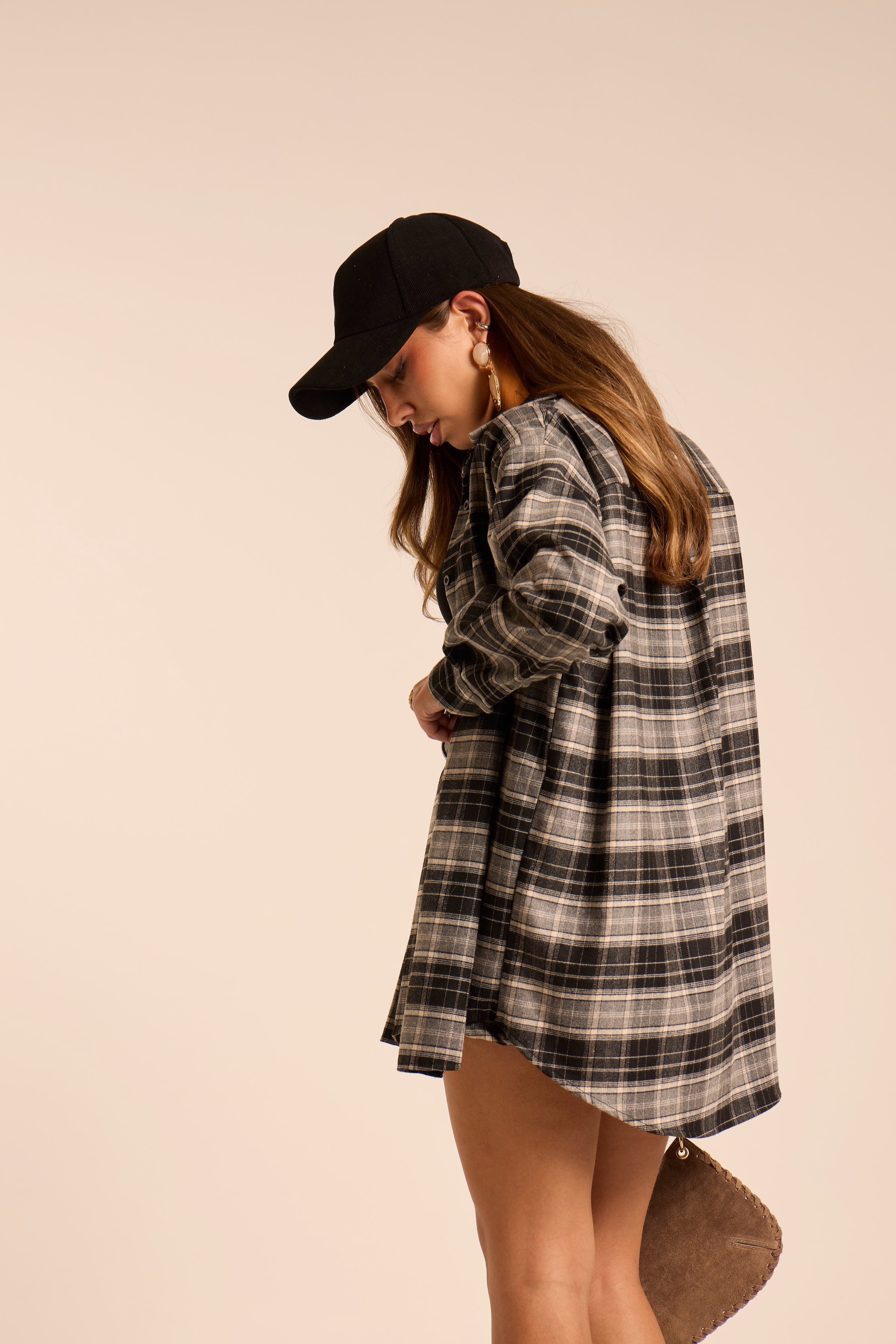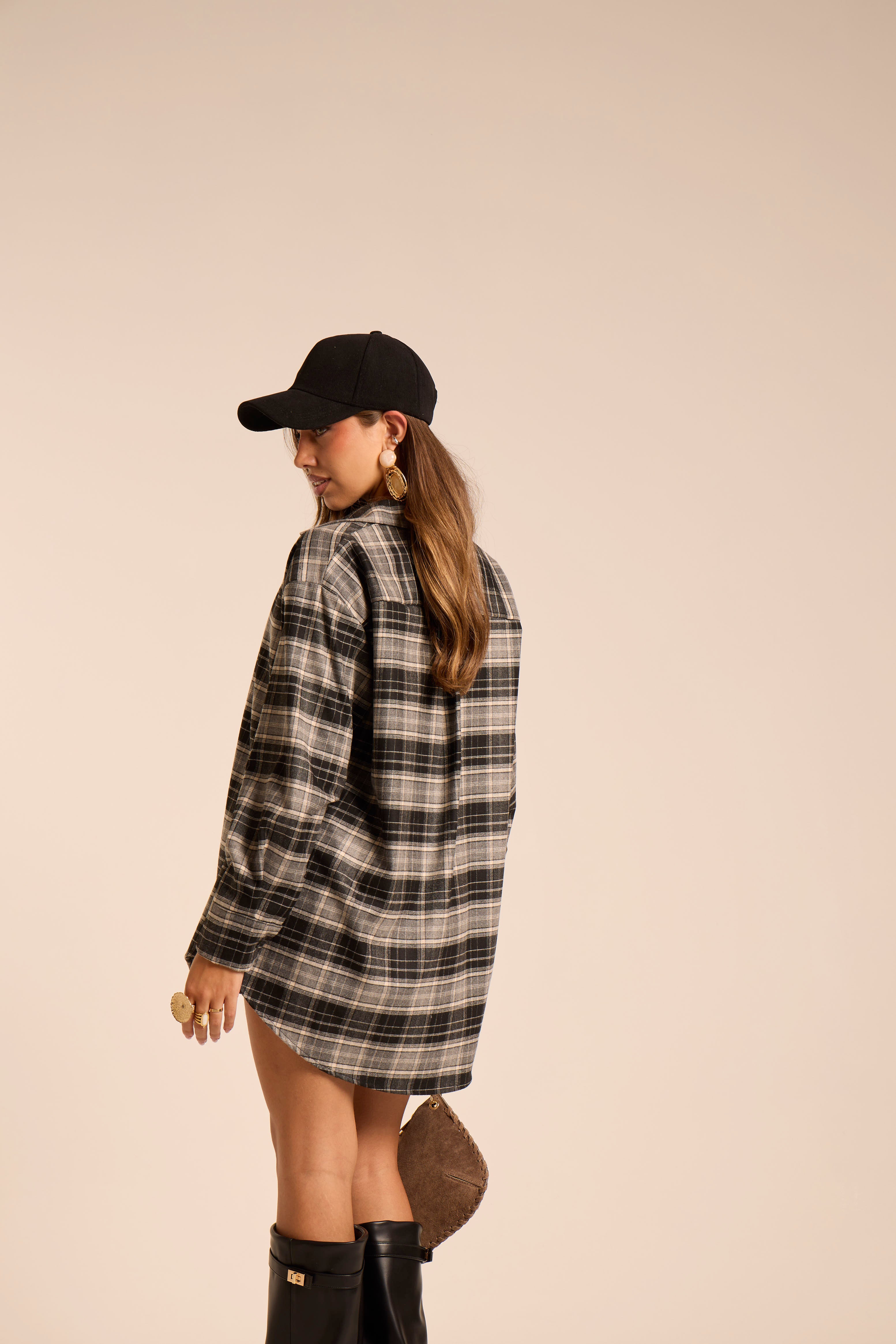 Coordinato a quadri composto da camicia e gonna a pantaloncino. Camicia modello oversize. Lunga. Gonna con vita elasticizzata. Passanti in vita per cintura. A pieghe.