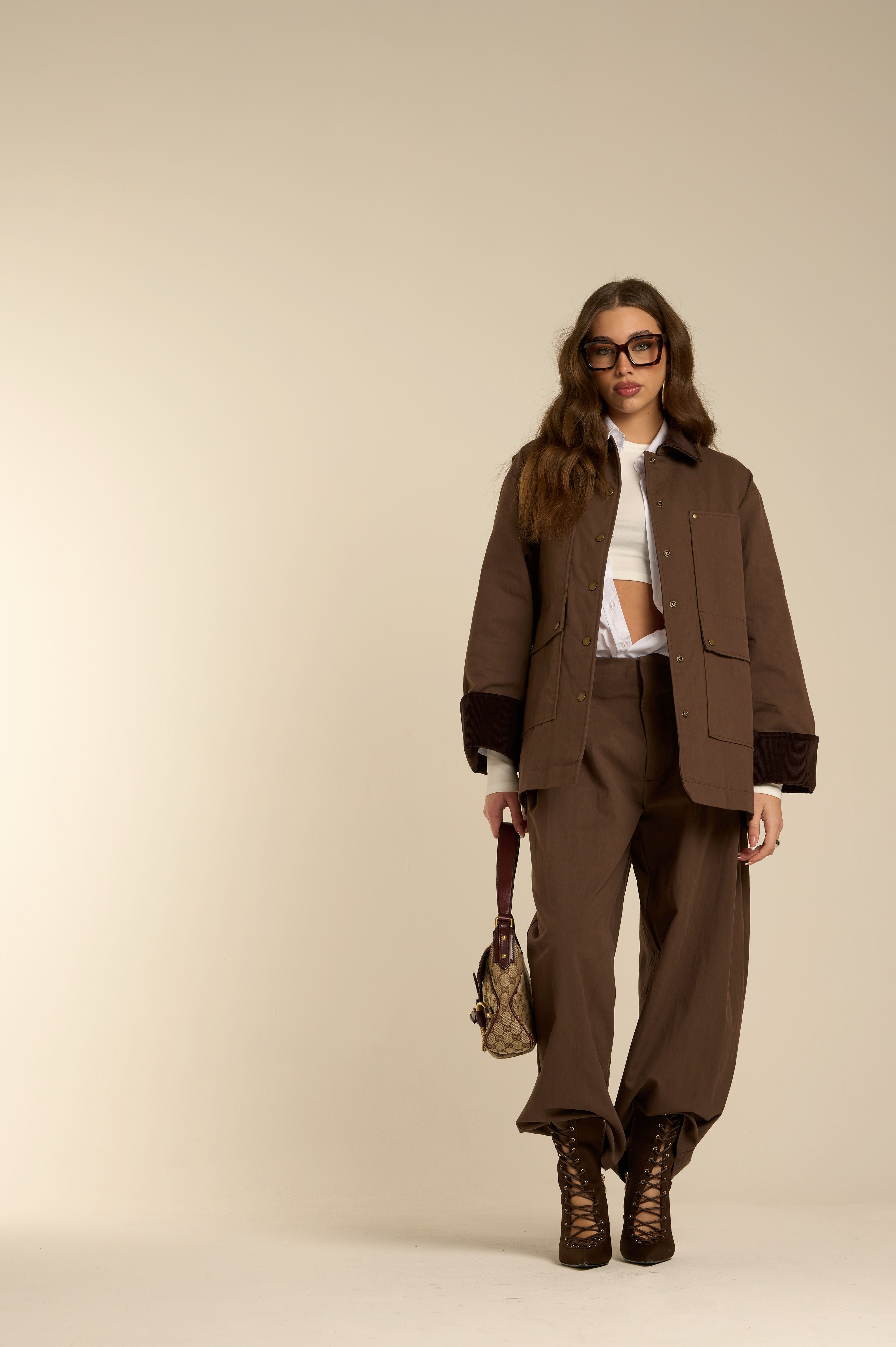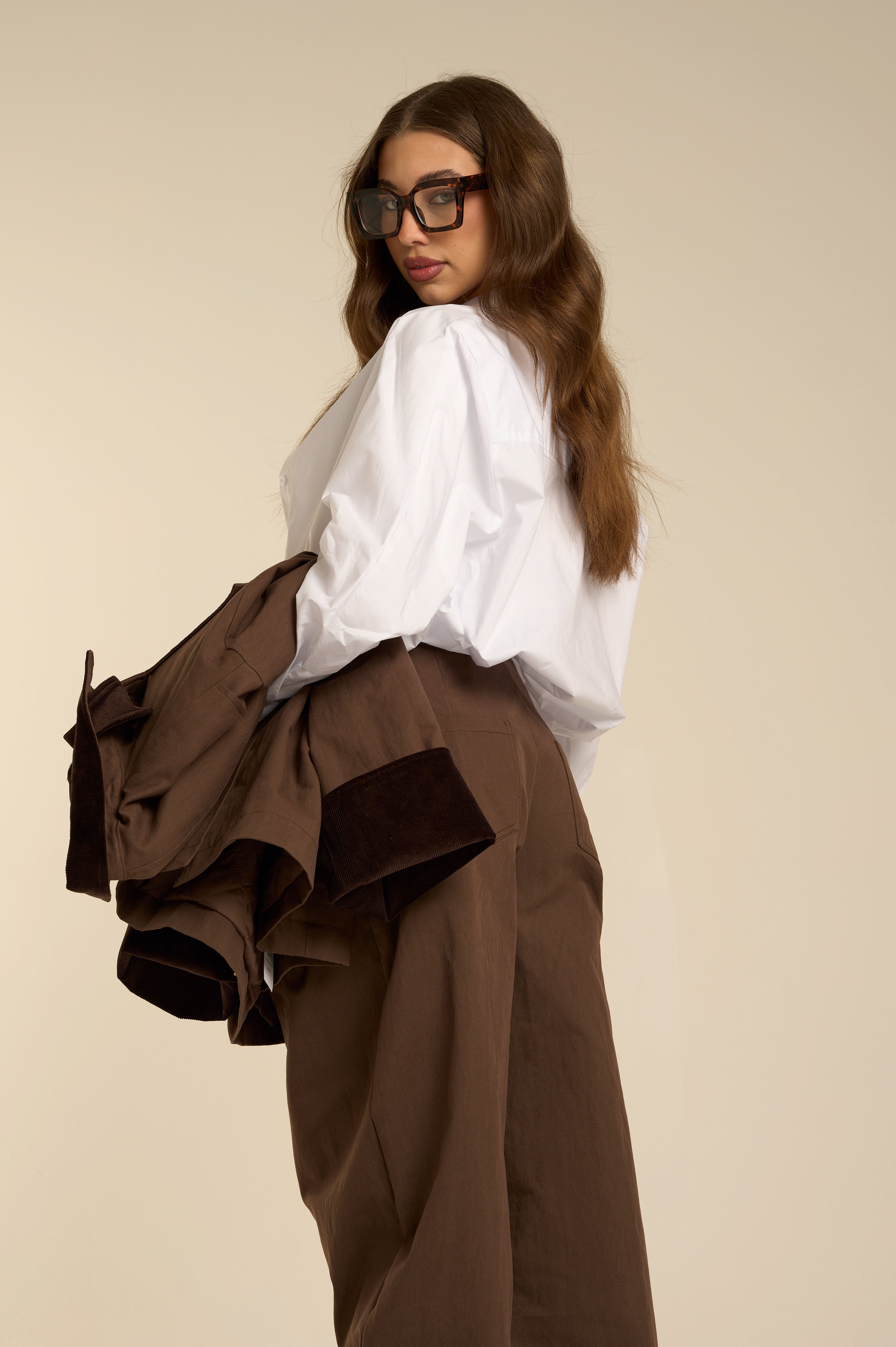 Pantalone coordinato in tessuto fluido color marrone scuro. Vita alta con pinces frontali, gamba ampia e fondo morbido che crea una caduta rilassata. Vestibilità confortevole ma curata, ideale per un look completo coerente e moderno, con richiami sartoriali rivisitati in chiave contemporanea. Tessuto strutturato.