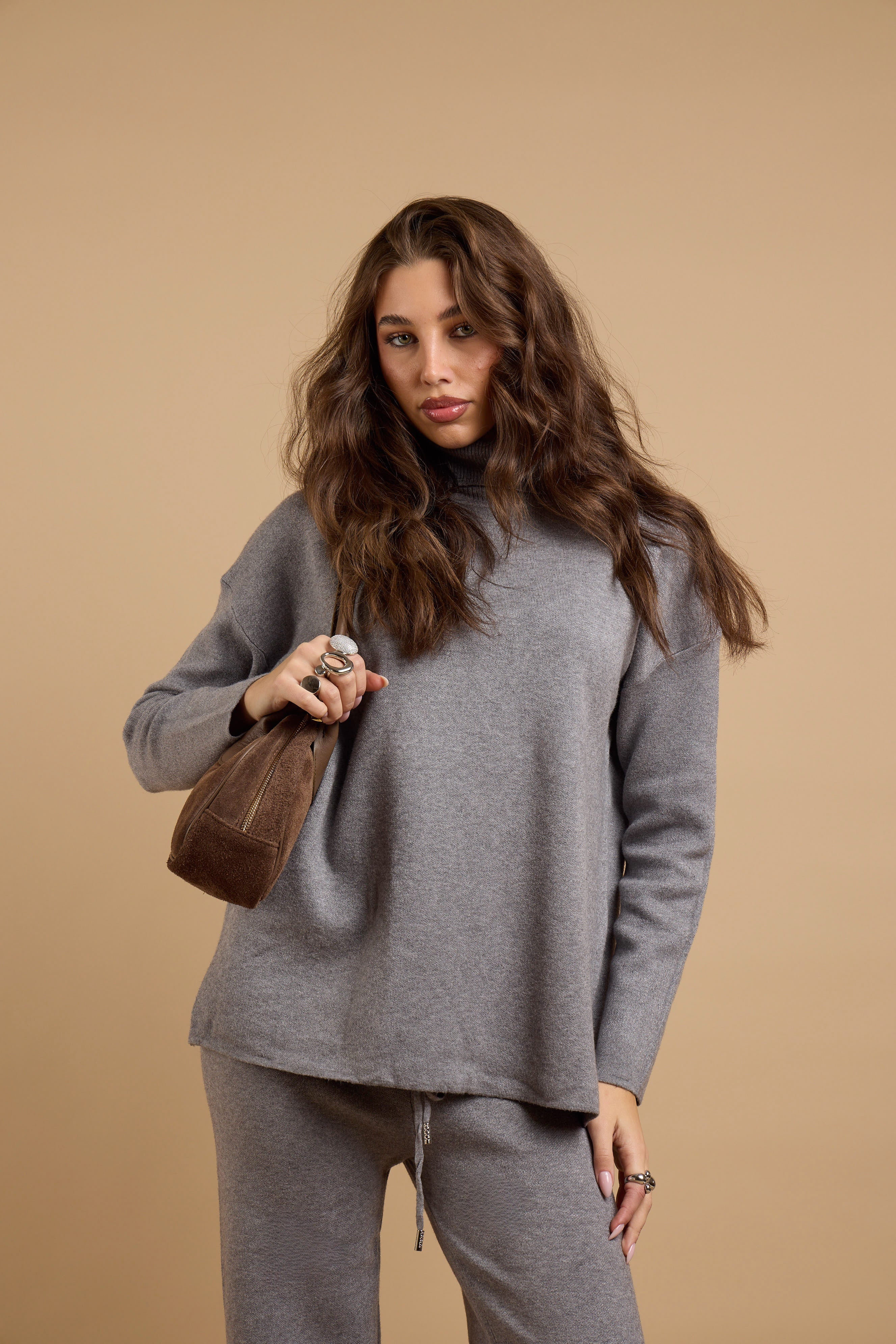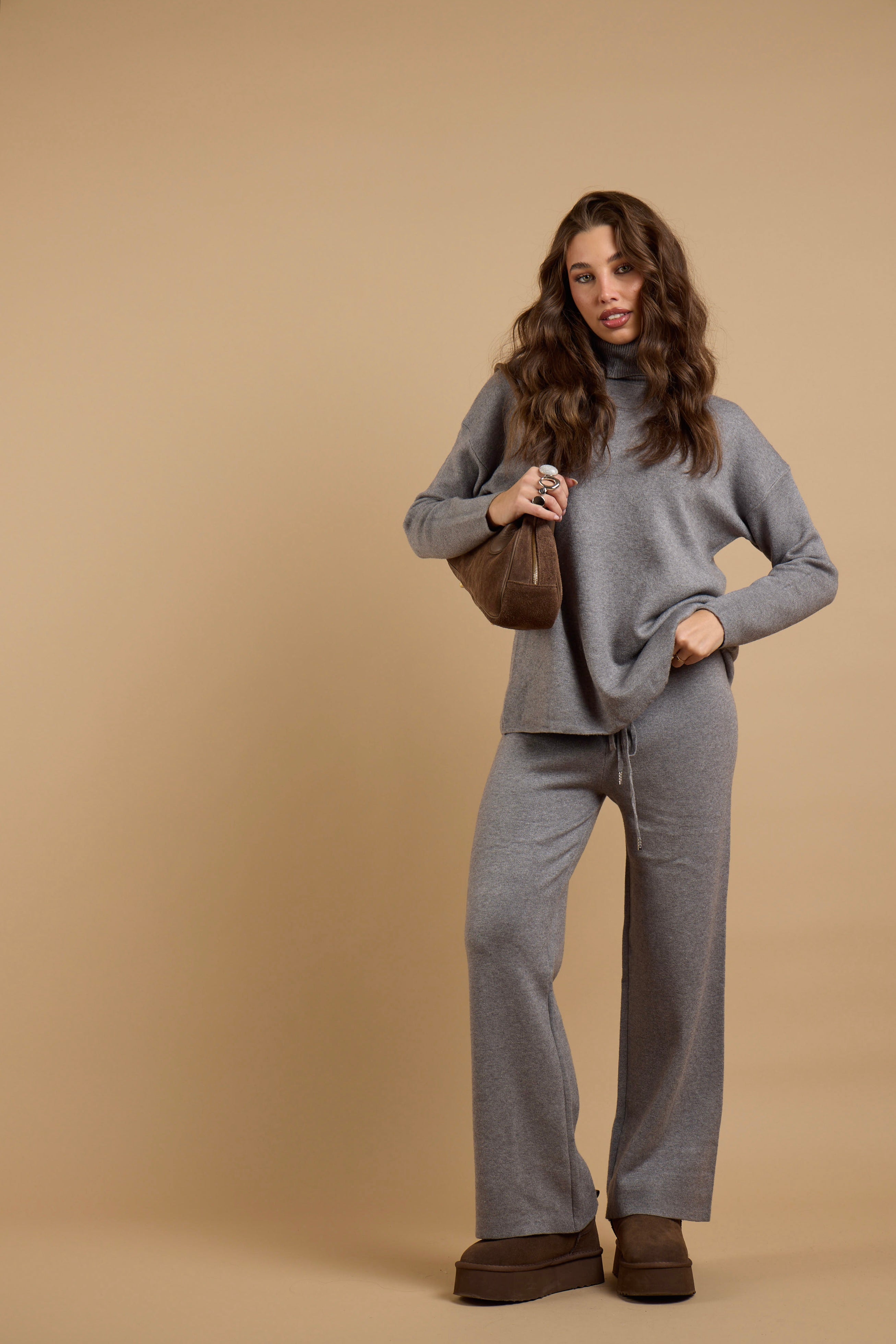 Coordinato due pezzi con maglia e pantalone. Presenta una vestibilitá morbida e fluida. Con linee pulite e design contemporaneo. A collo alto elegante e confortevole e pantalone dalla gamba morbida e slanciato. Ideale per look casual chic, travel wear e urban comfort