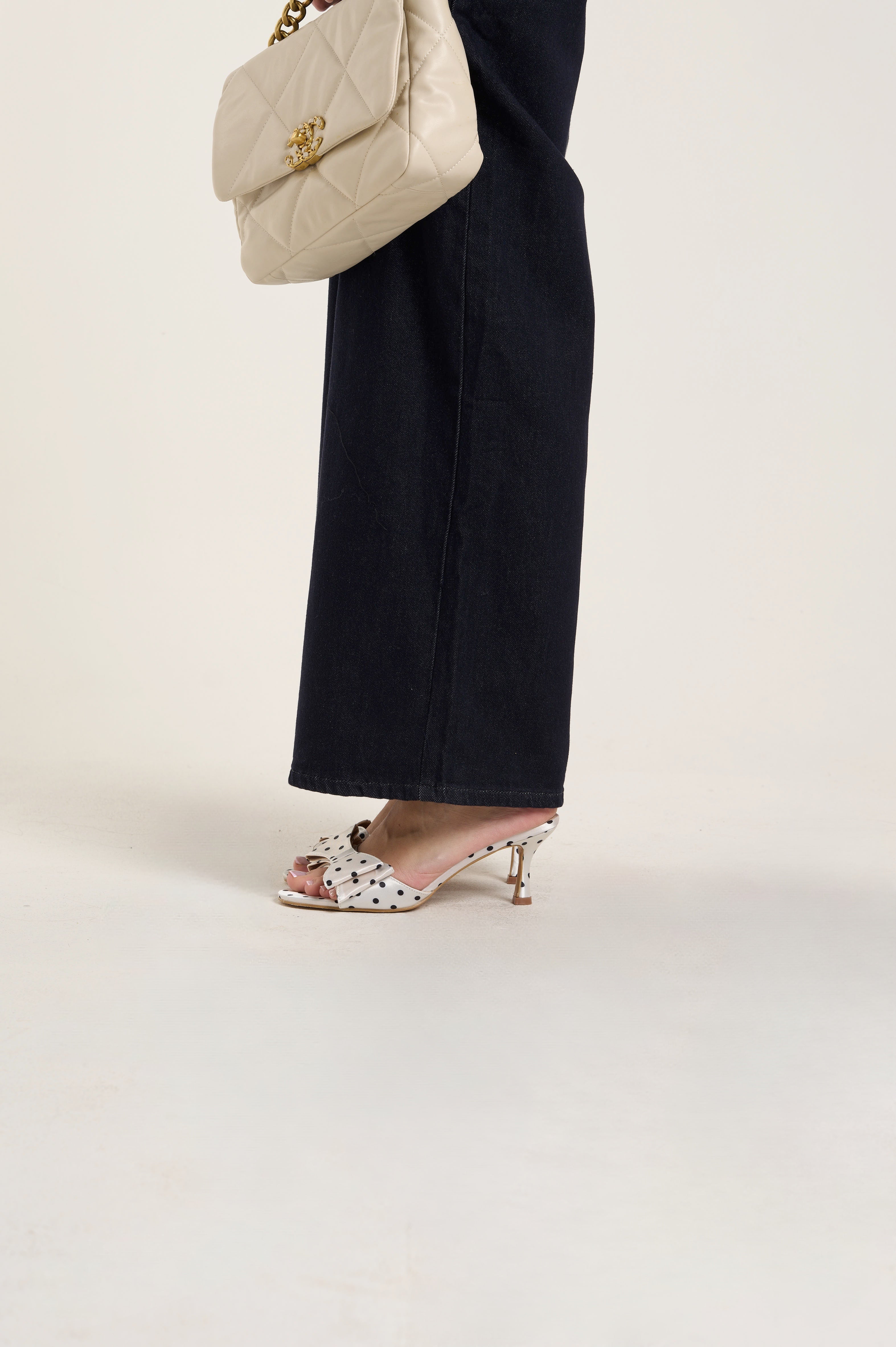 Tacco medio a rocchetto, design mule aperto. Fantasia a pois bianco e nero. Con fiocco frontale per un tocco chic e distintivo. Stile rètro rivisitato in chiave moderna.