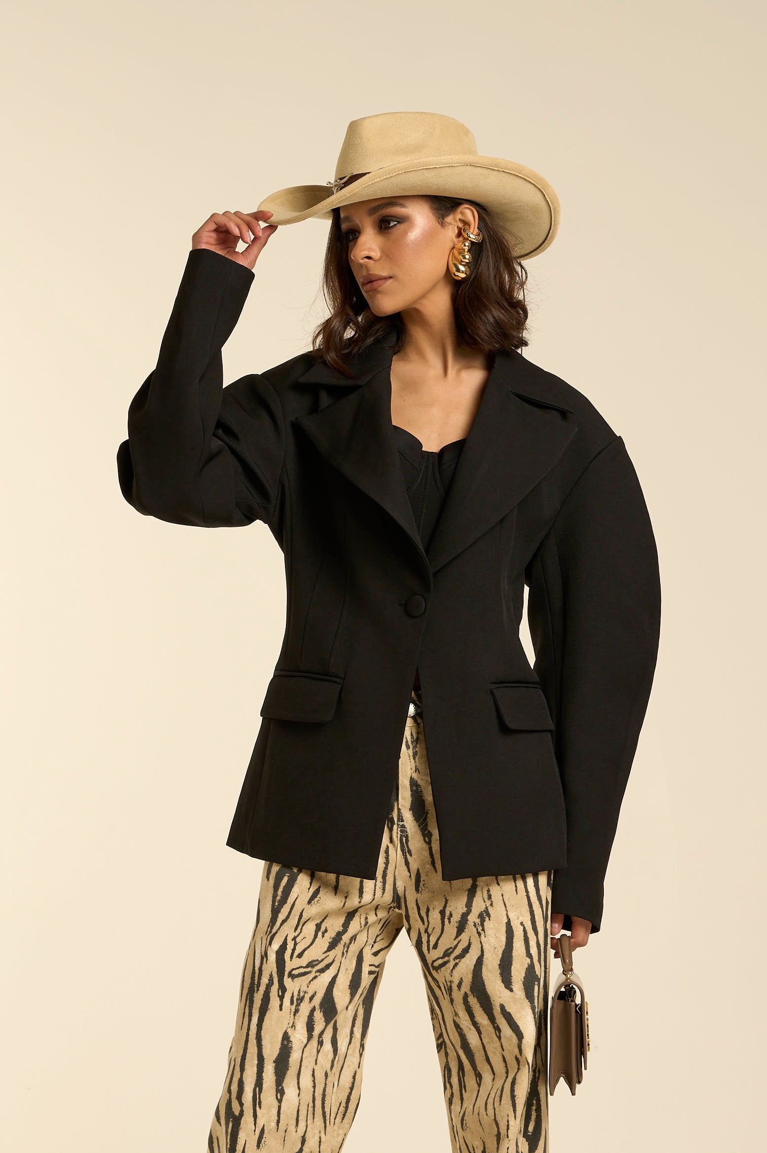 Blazer monopetto colore nero in tessuto compatto liscio e struttura definita. Linea leggermente oversize con spalle e maniche costruite balloon che donano carattere alla silhouette. Chiusura frontale con bottone singolo, tasche con patta finta e lunghezza che cade sotto il fianco per un effetto contemporaneo.