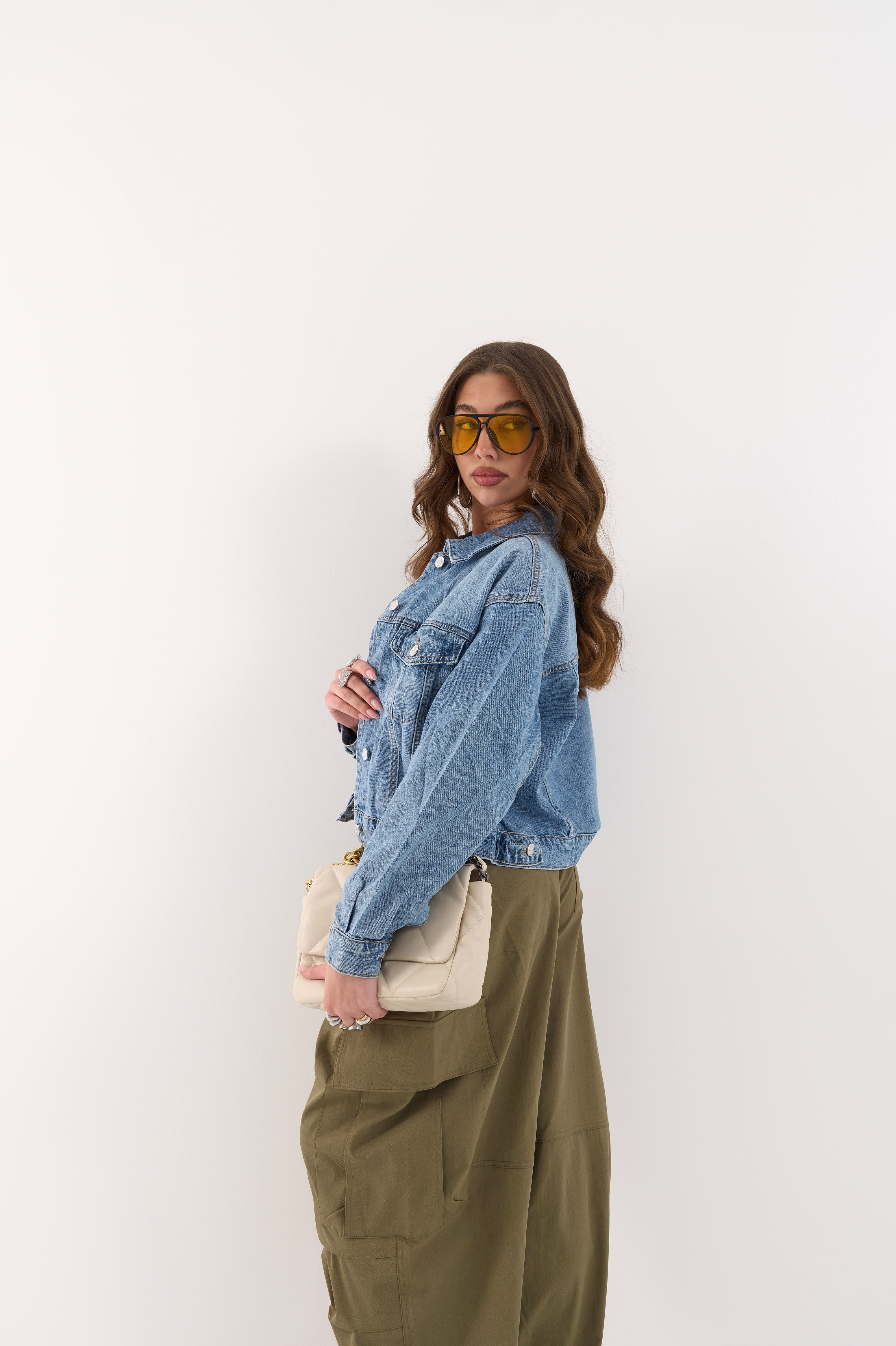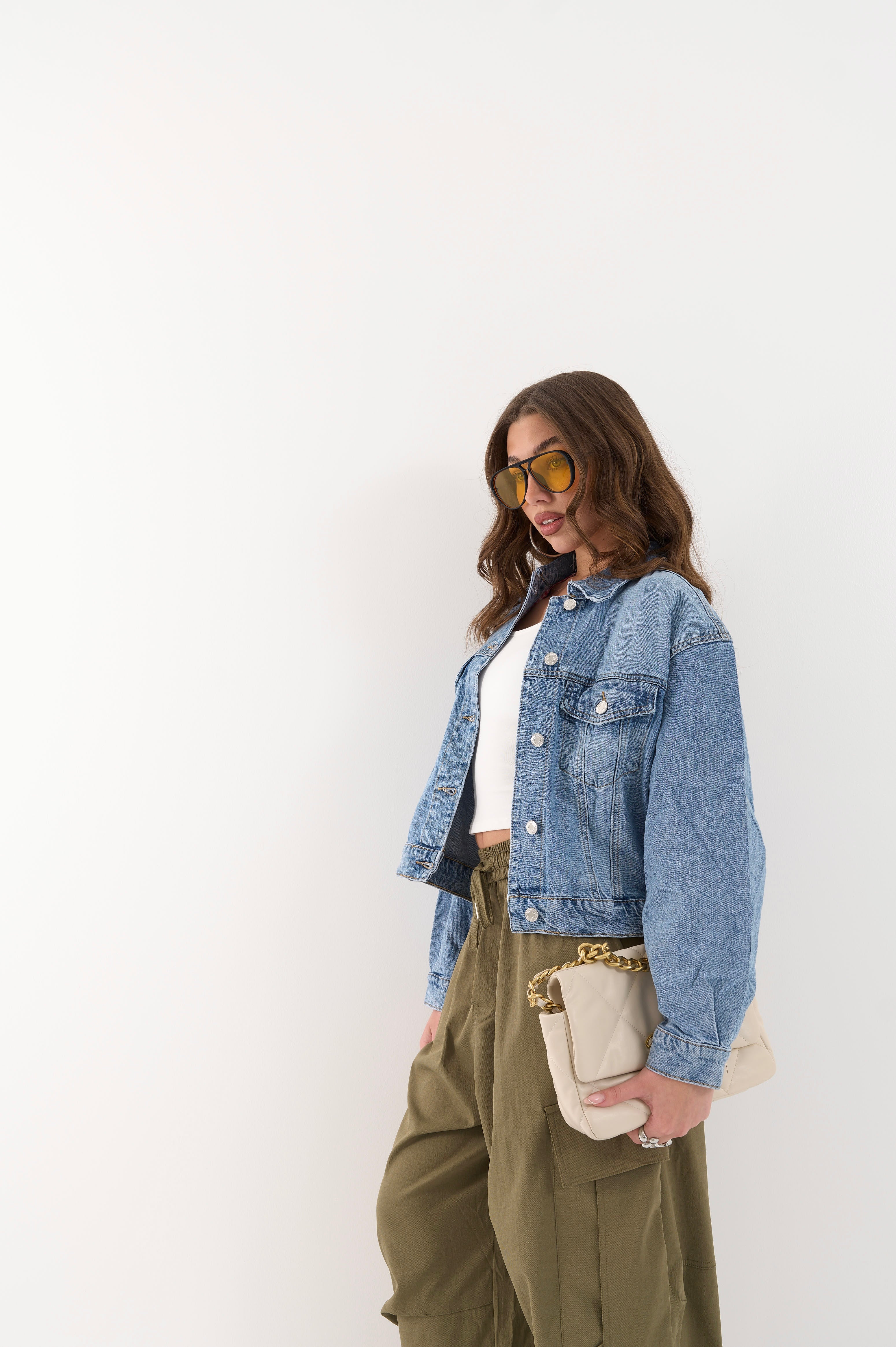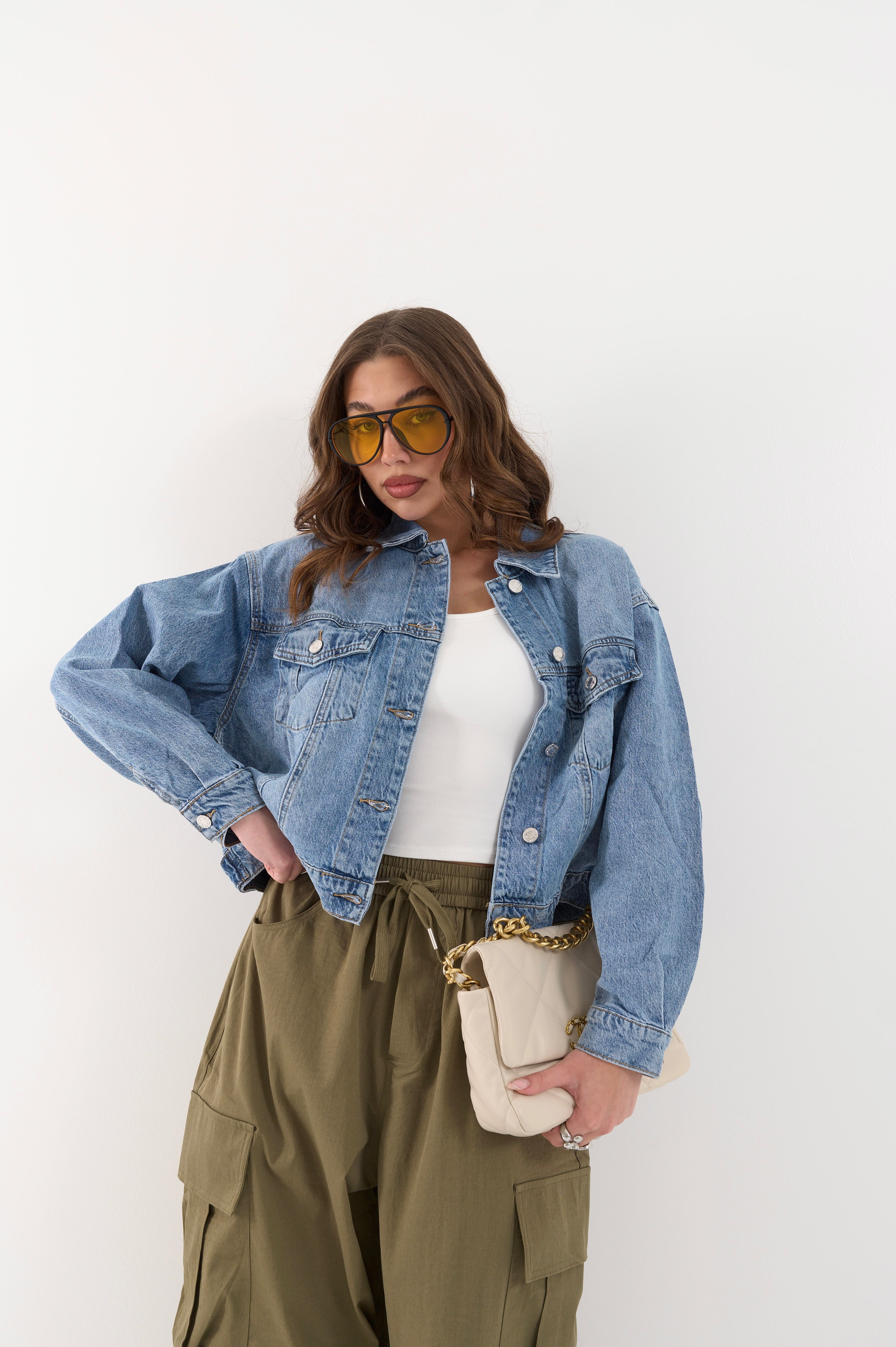 Giacca in jeans. Colore denim azzurro slavato. Finiture effetto lavato vintage. Vestibilità regolare, leggermente boxy. Lunghezza corta. Chiusura centrale con bottoni. Colletto a camicia. Tasche con patta e laterali.