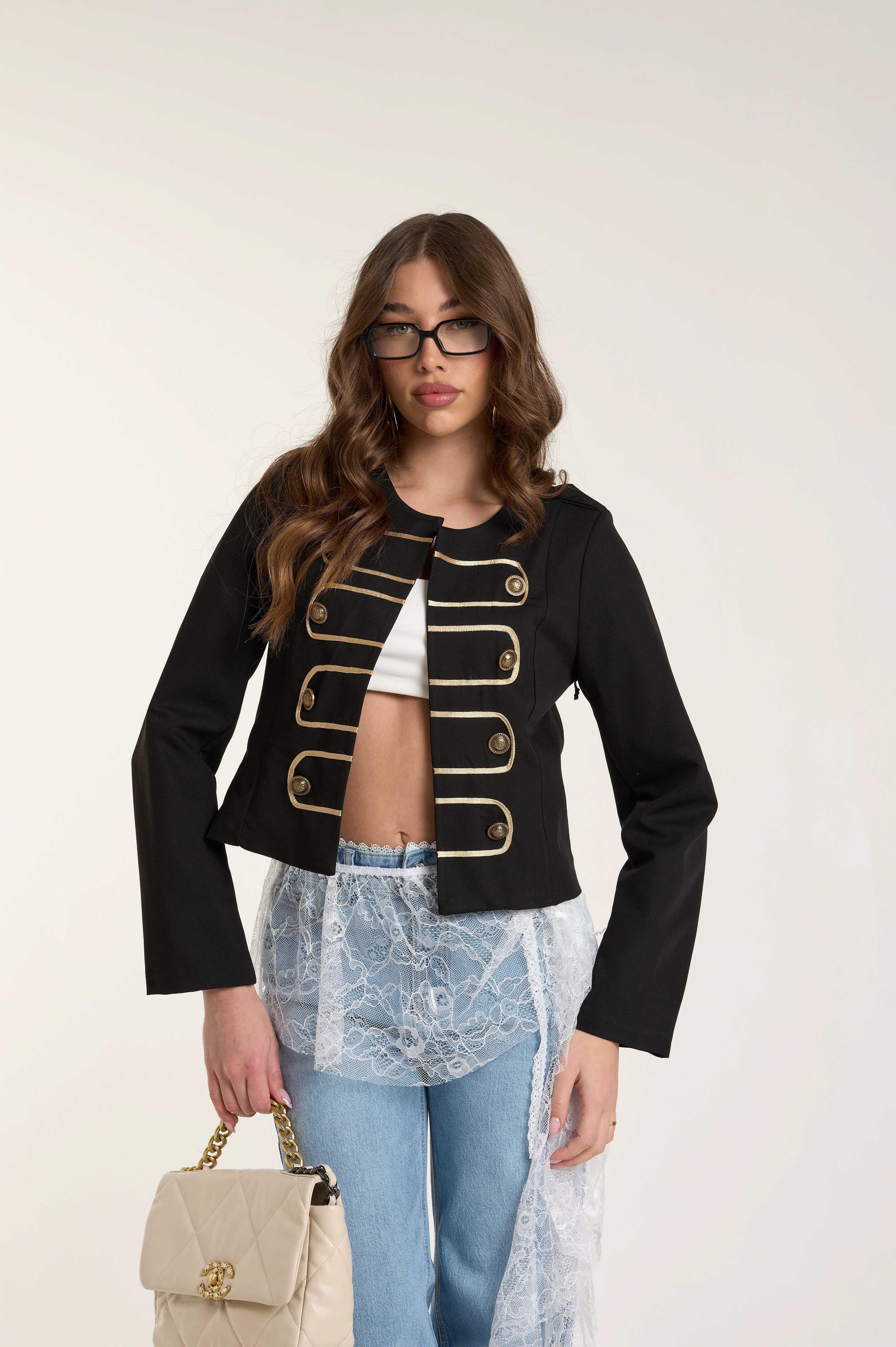 Giacca leggera dal design strutturato. Colore nero con dettagli decorativi a contrasto color oro. chiusura frontale con bottoni metallici. Linee orizzontali decorative stile military chic. Taglio corto che valorizza la silhouette. Colletto girocollo minimal. Dal tessuto leggero, ideale per le mezze stagioni.