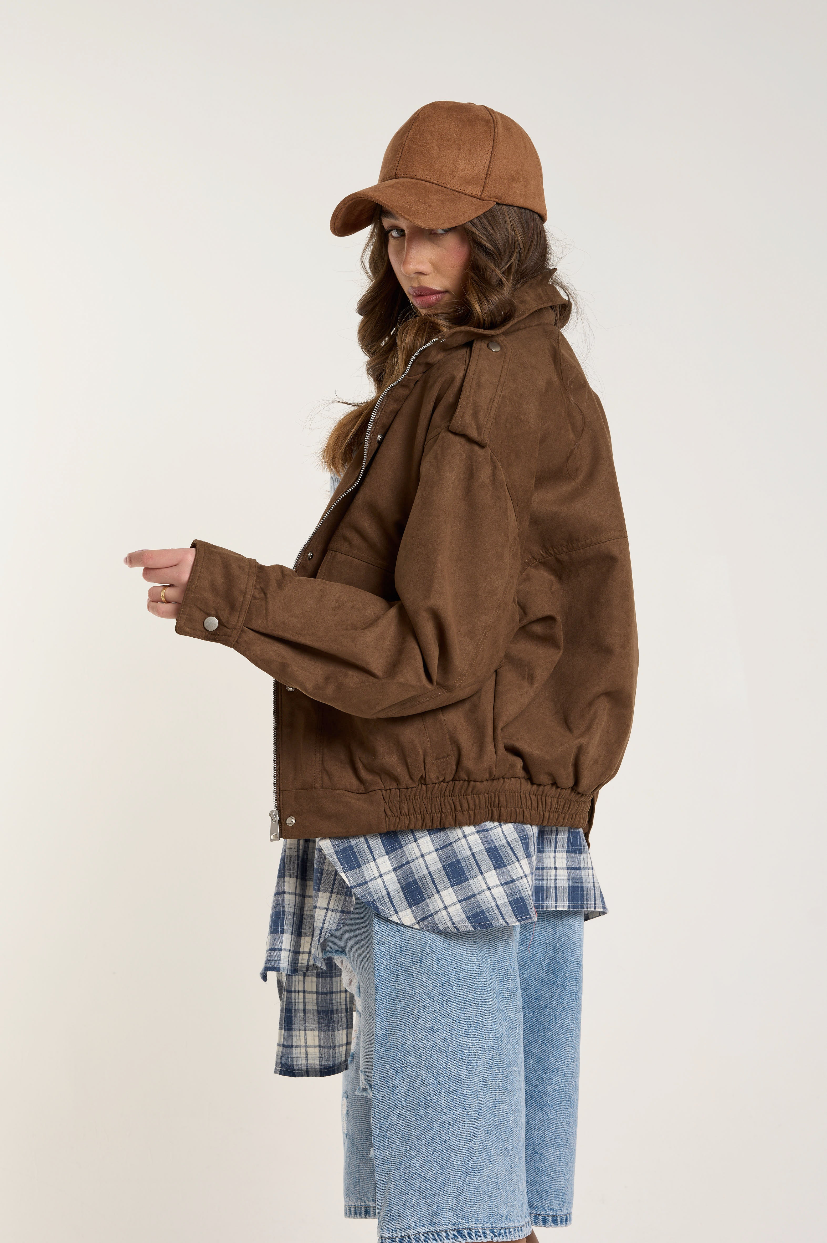 Giacca in simil suede color cammello scuro con finitura morbida e leggermente effetto vissuto. Linea rilassata con struttura utility, collo alto e chiusura frontale con zip. Tasche applicate con patta sul davanti e spalle morbide che mantengono una costruzione fluida. Fondo elasticizzato e maniche lunghe con polsino regolabile. Vestibilità regolare dal carattere casual-chic.