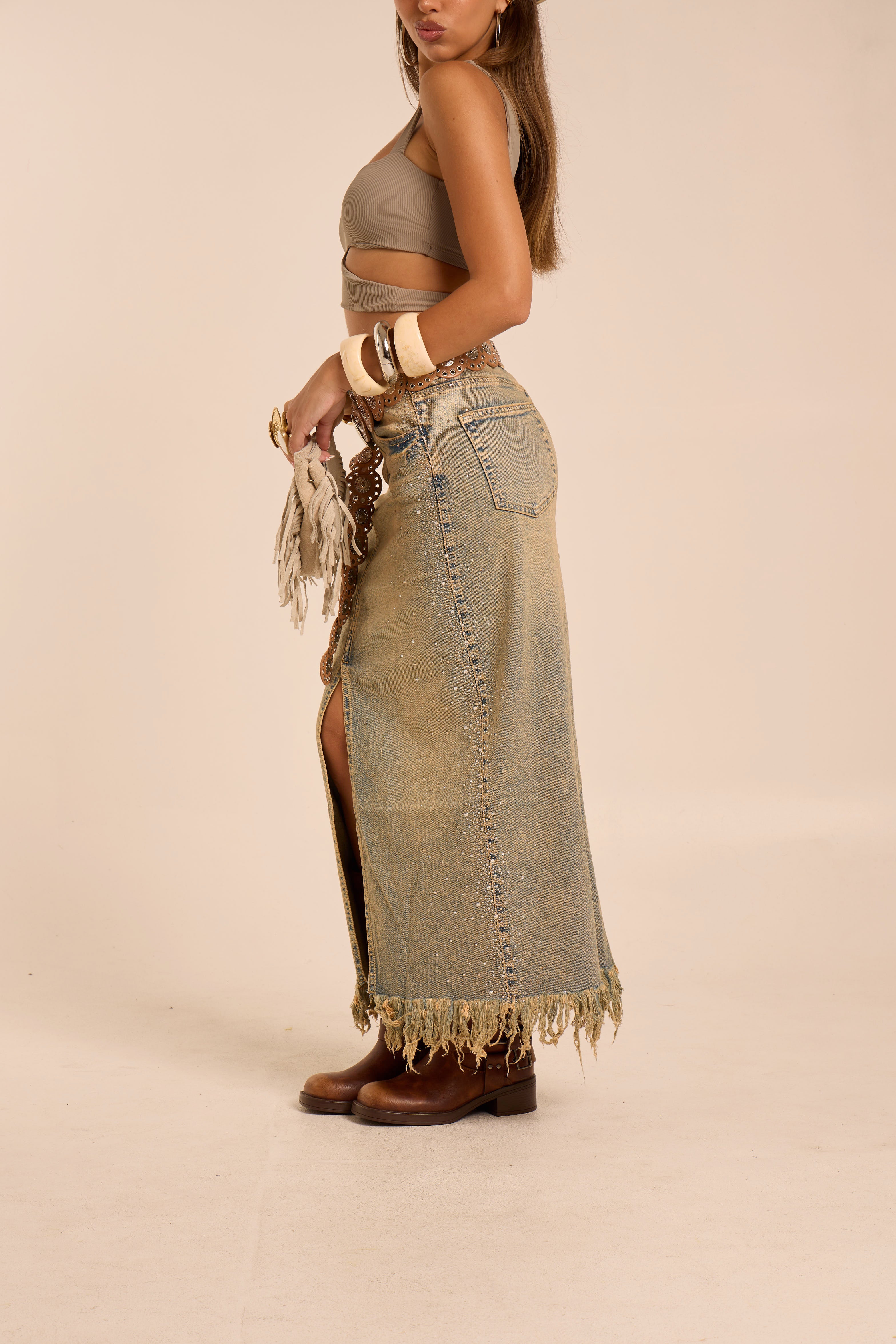 Gonna lunga in denim. Lavaggio slavato, sottotono beige. Con strass. Parte finale a taglio vivo. Spacco frontale. A 5 tasche. Passanti in vita per cintura. Chiusura con cerniera zip e bottone.