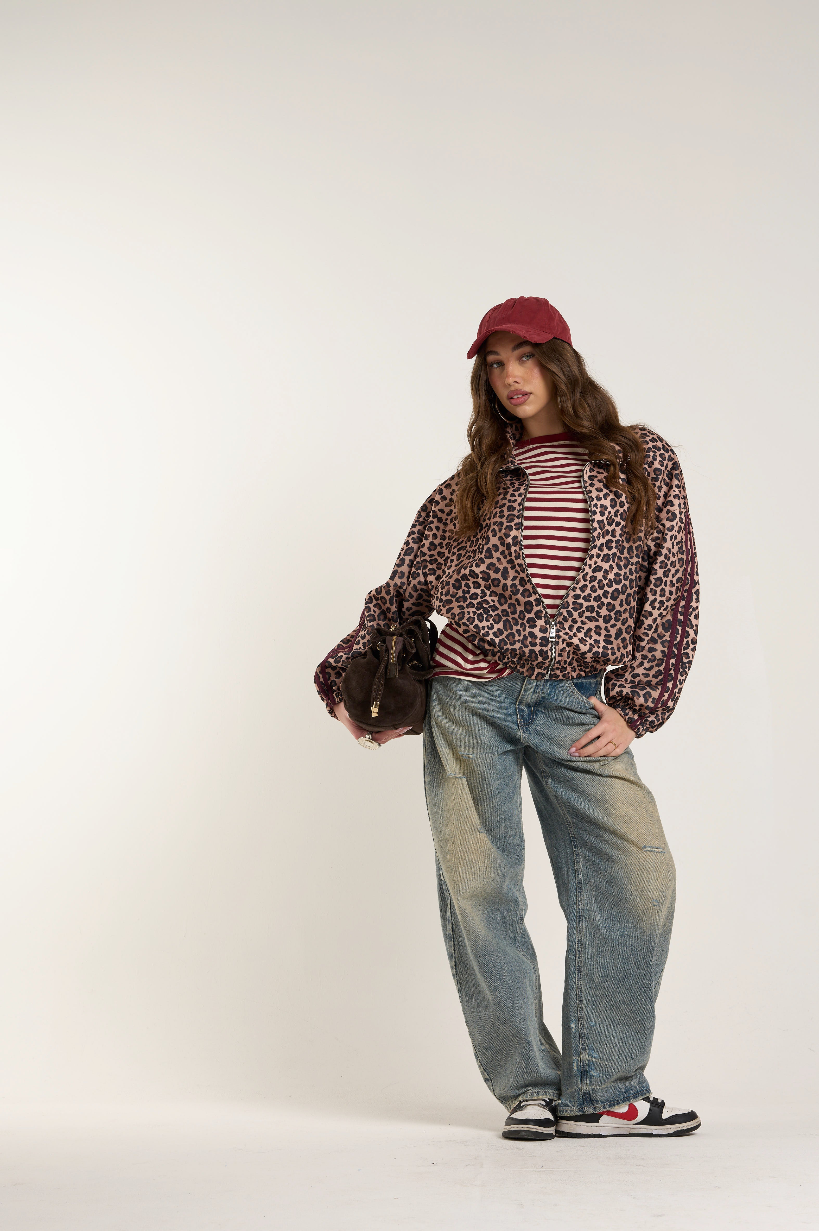 Felpa leggera, modello giacca bomber, con zip-up corta. Fantasia animalier leopardata. Vestibilità oversize. Con colletto alto. Maniche lunghe con volume leggero e polsini elasticizzati. Tonalità beige e marrone con dettagli borgogna.