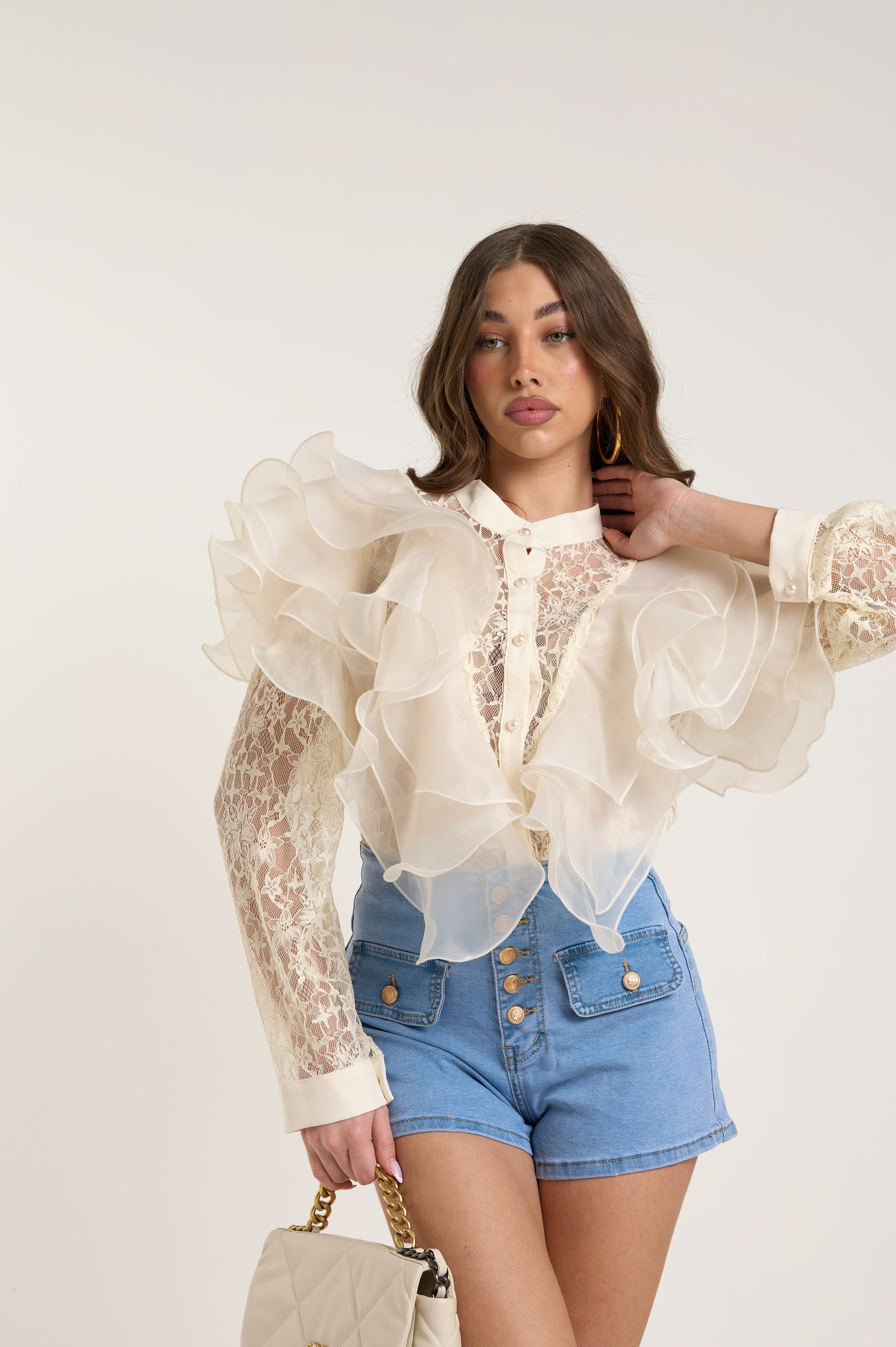 Camicia elegante con dettagli raffinati. Color Avorio. Tessuto di mix di organza e pizzo. Collo coreano con abbottonatura frontale. A maniche lunghe in pizzo trasparente con polsino strutturato. Dettaglio Maxi volant in organza sul davanti e sulle spalle.