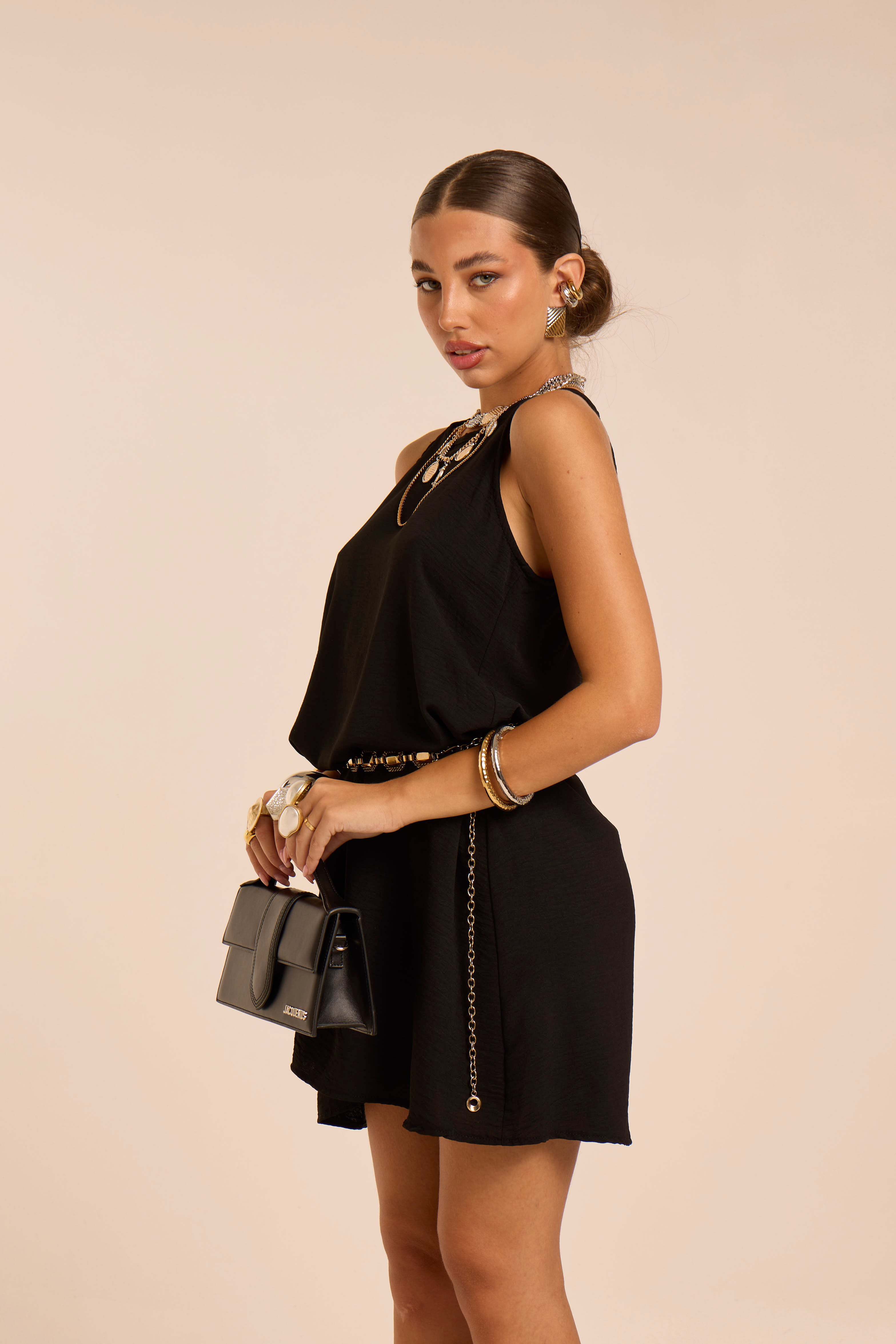 Abito corto. Leggero. Chiusura con bottone parte posteriore. Cade giù dritto.