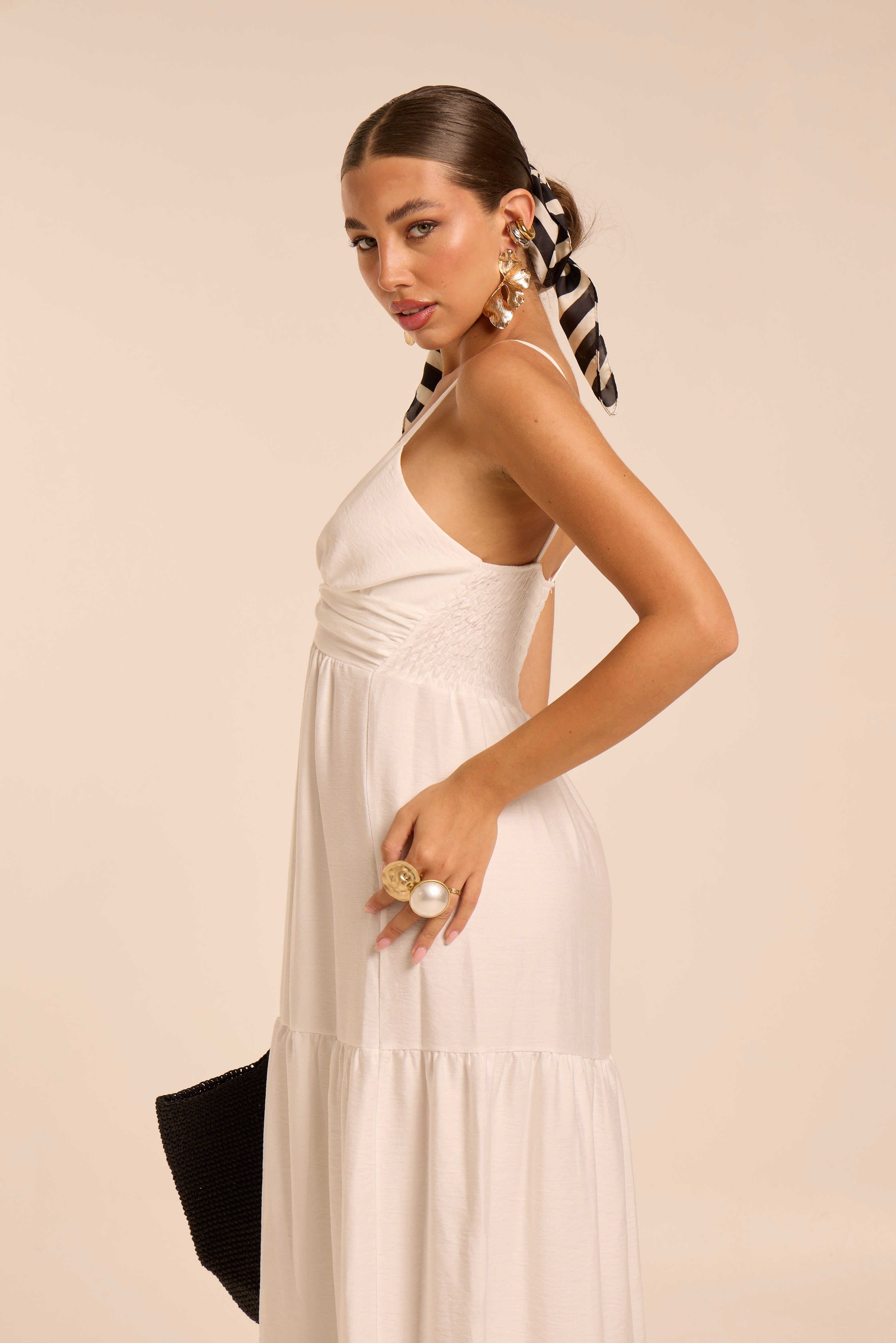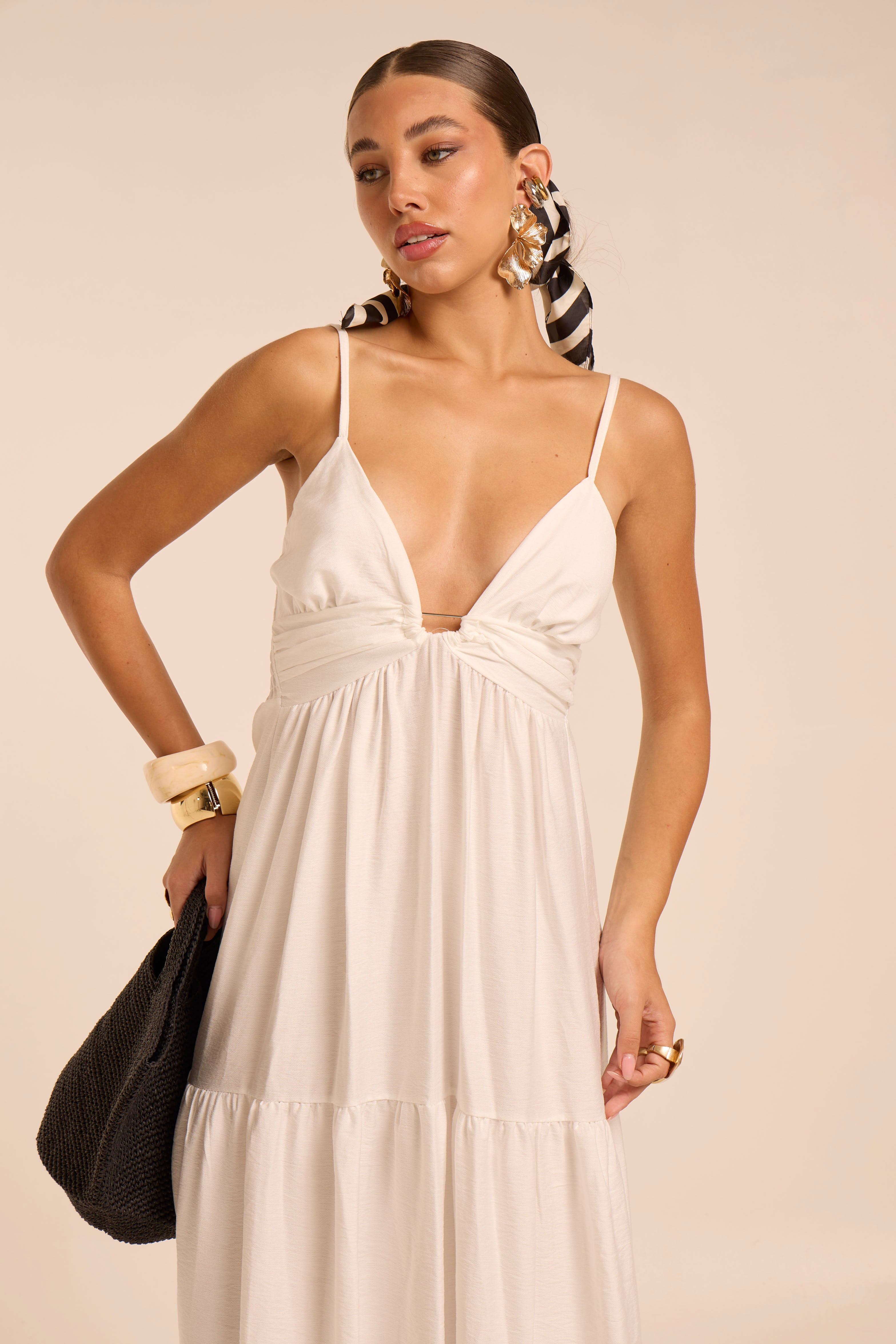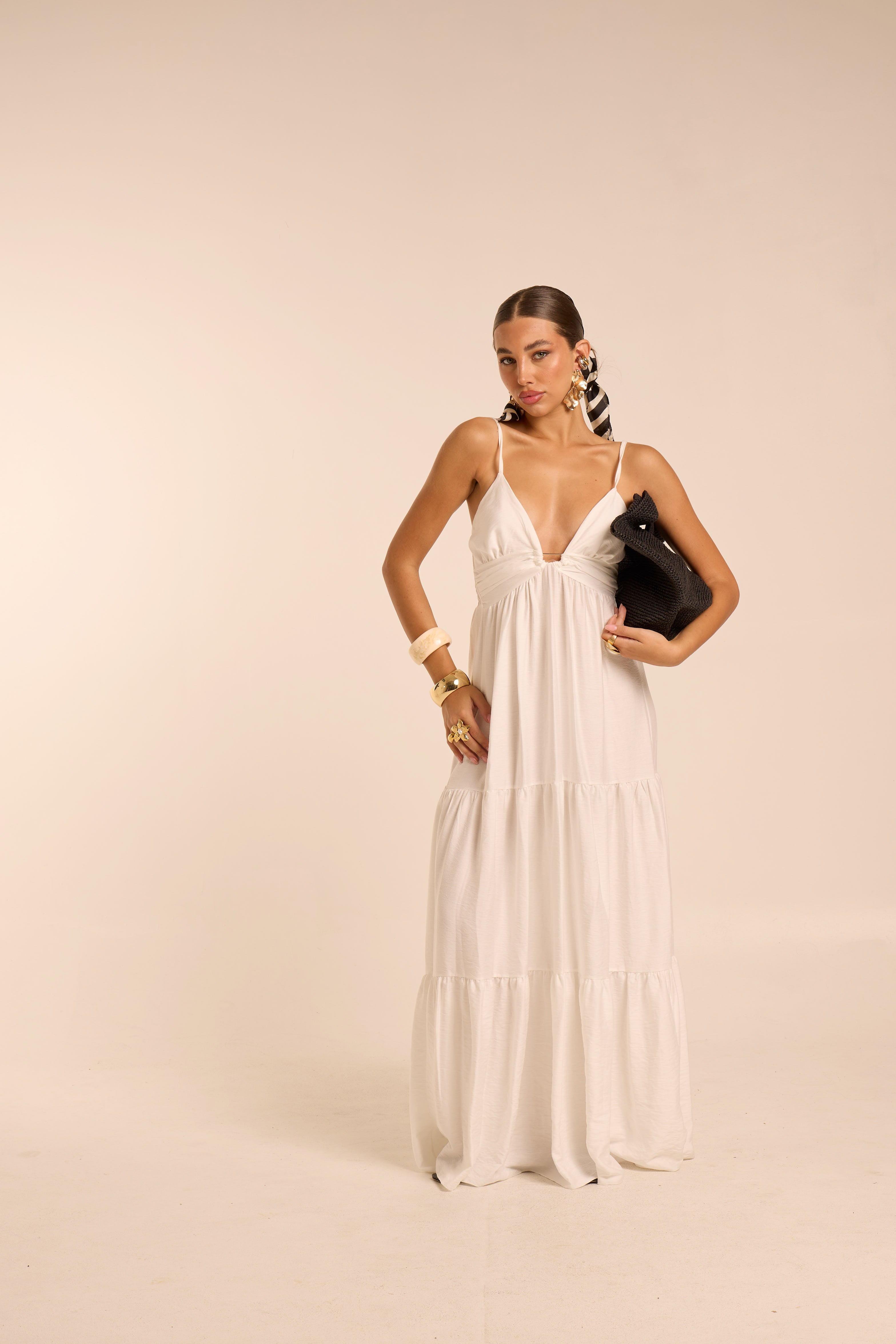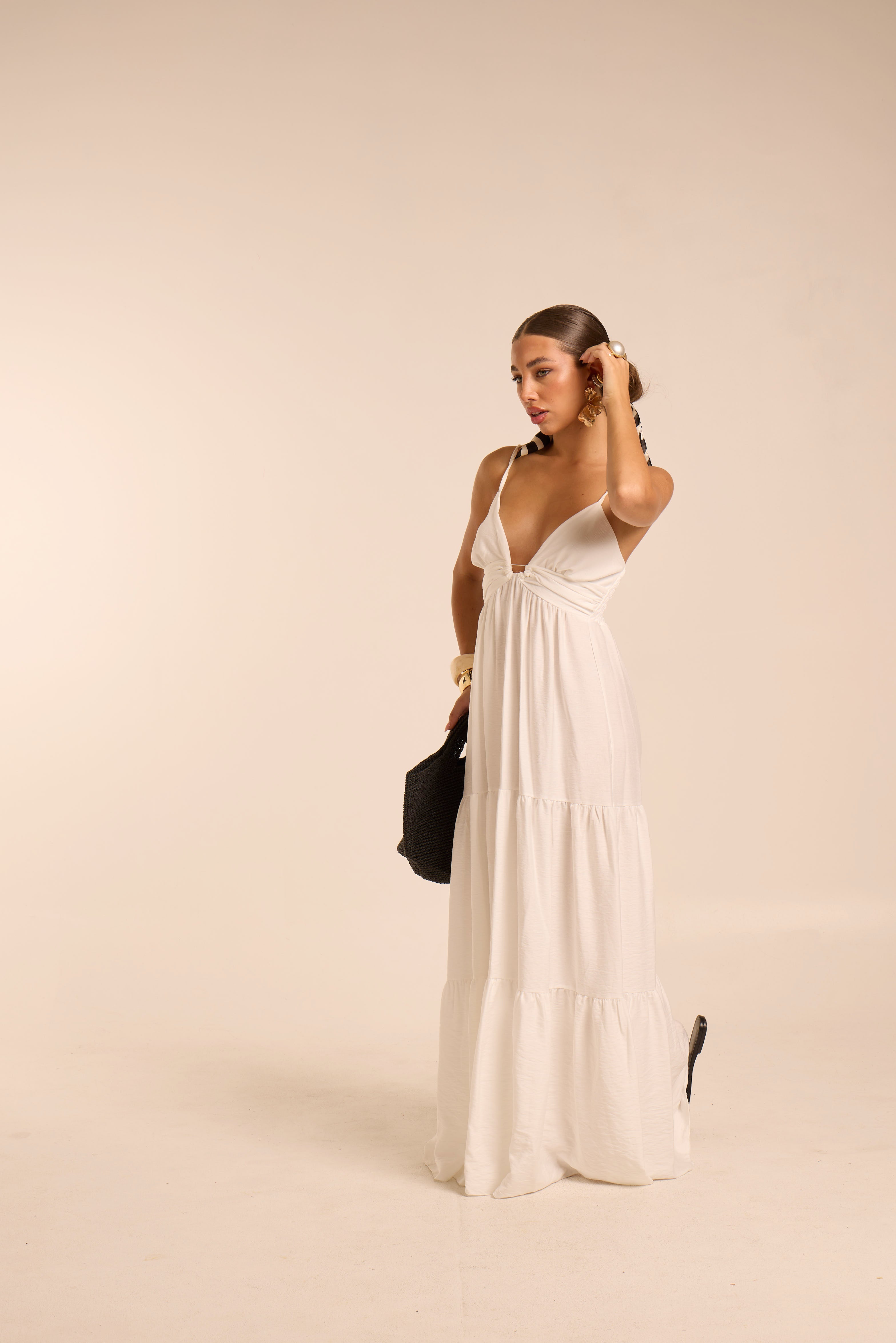 Abito lungo. Leggero. Con busto elasticizzato. Scollo a V, con dettaglio silver. Gonna ampia, a balze larghe.