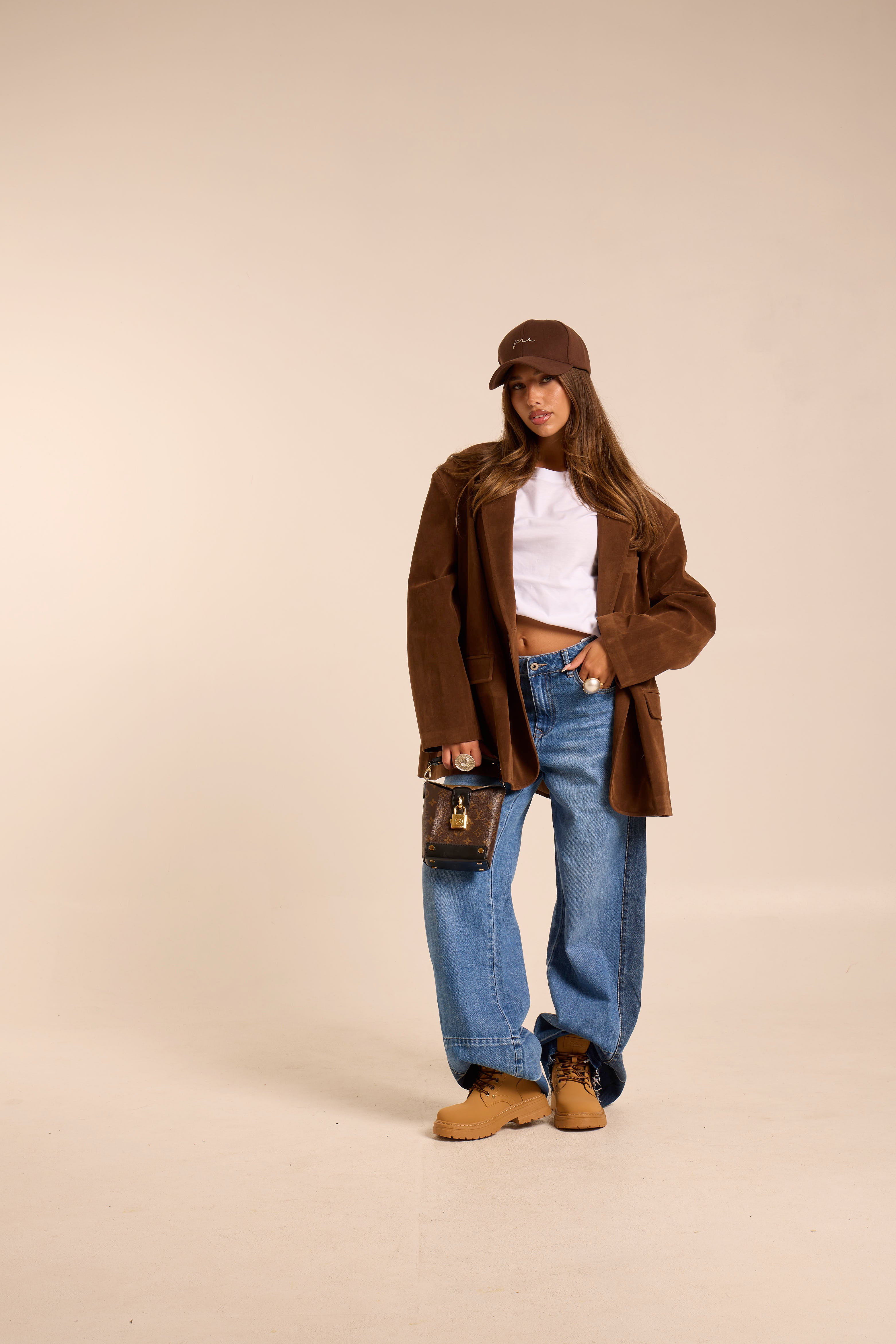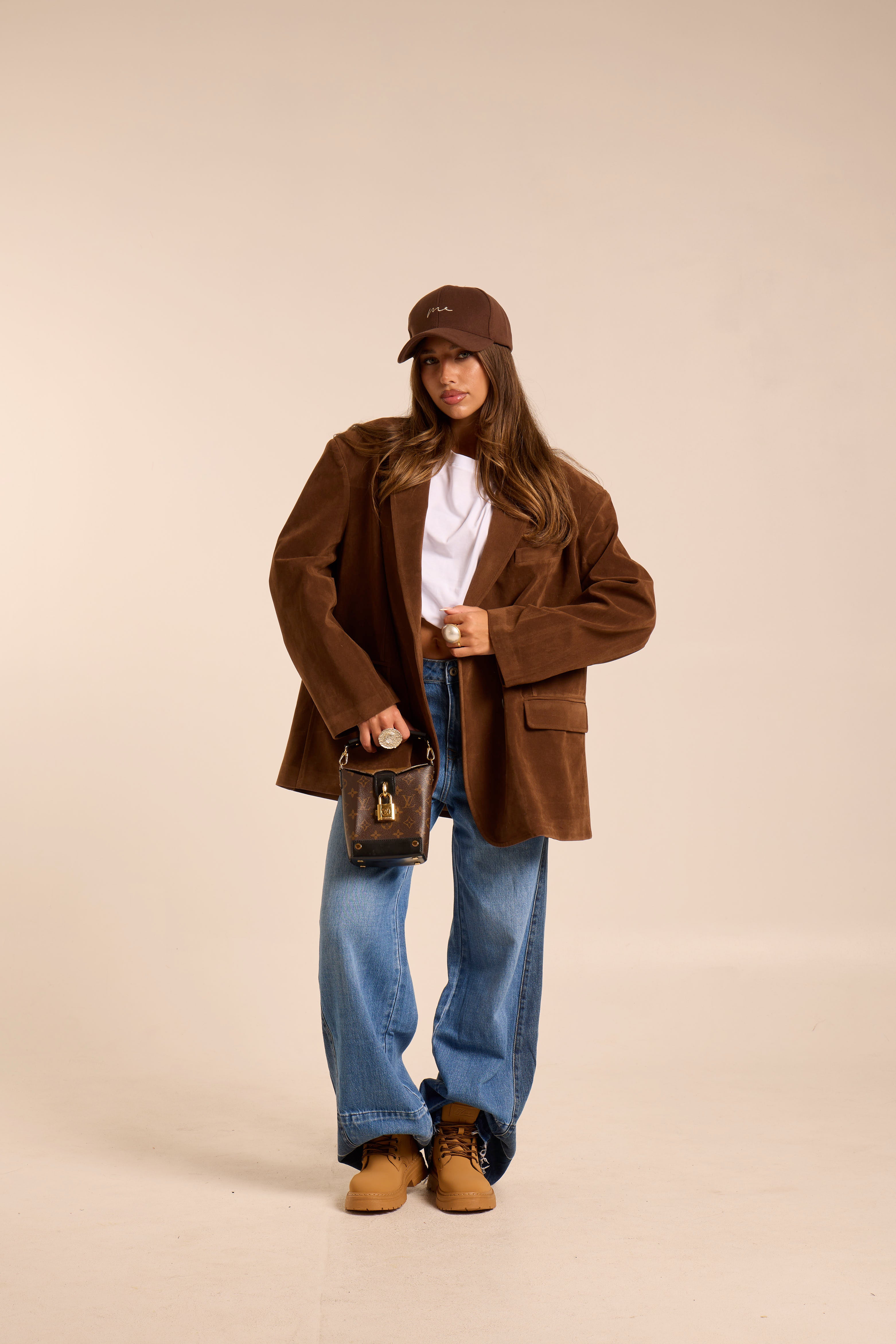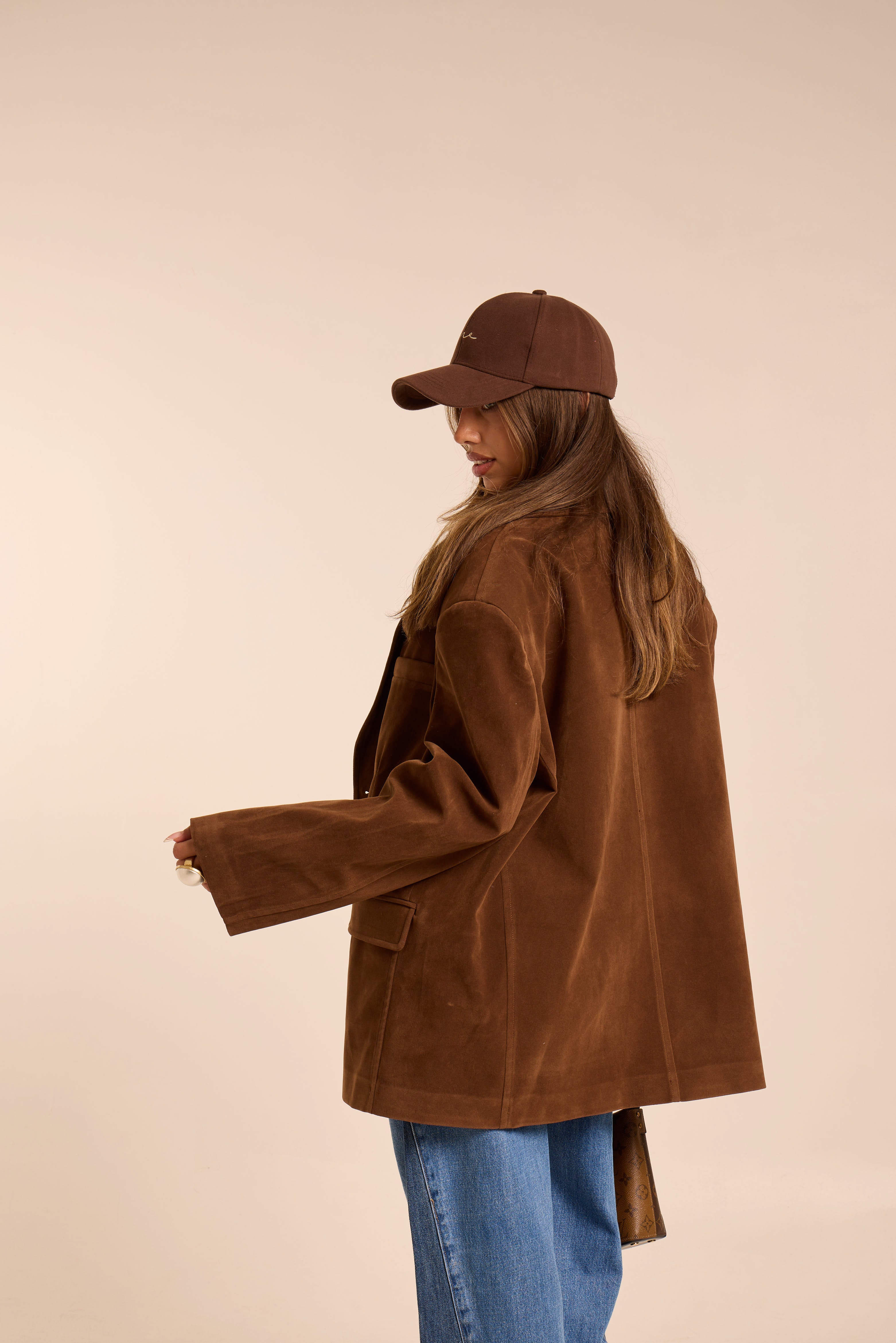 Blazer modello oversize. Strutturato. Spallina imbottita. Foderato. In simil camoscio. Tasche con patta e tasca in linea frontale. Chiusura frontale ad intreccio con bottoni.