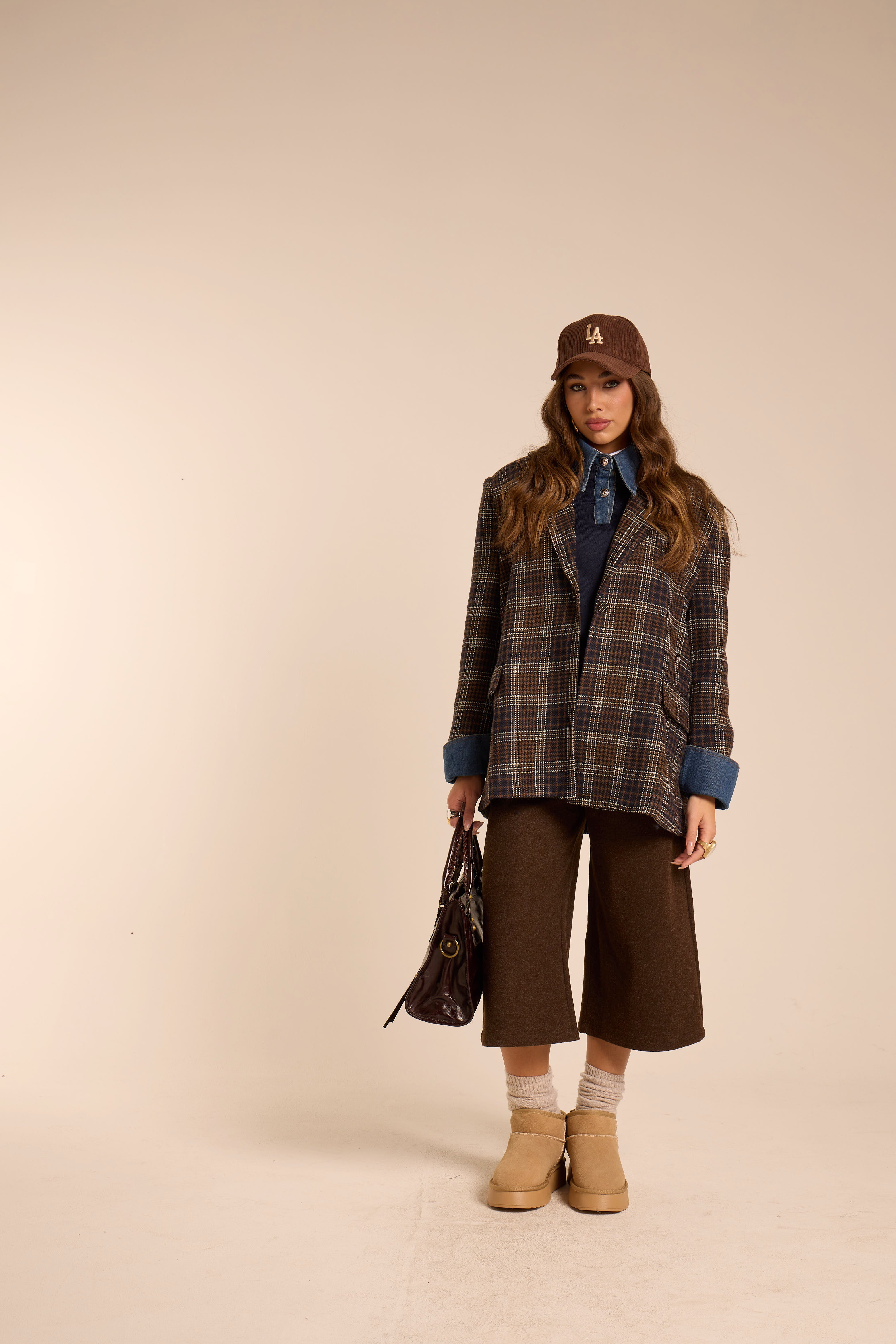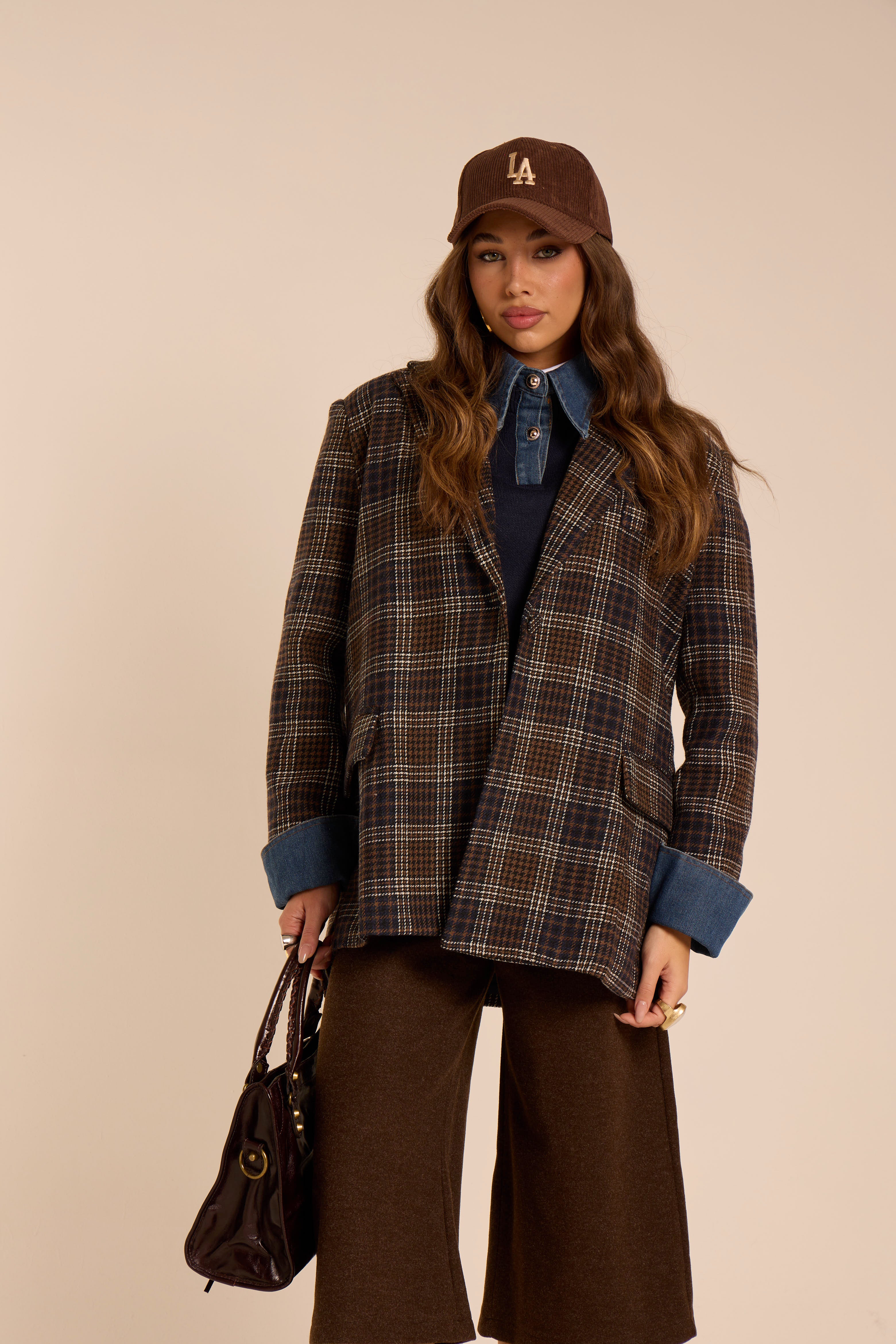 Blazer oversize strutturato. In flanella. Con spallina imbottita. Scollo a revers. Tasche frontali con patta e tasca in linea. Toni del marrone, bianco, nero e Khaki.