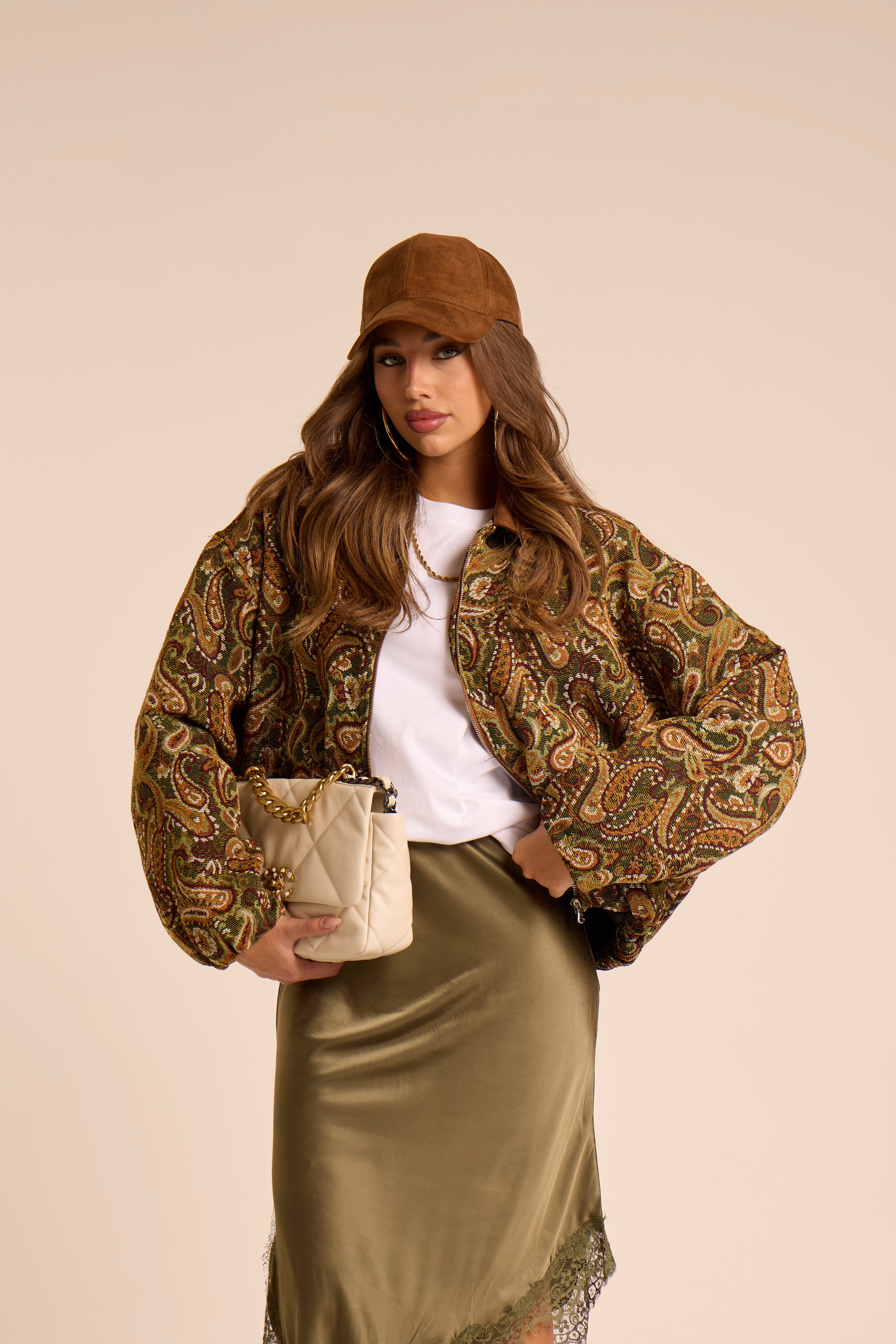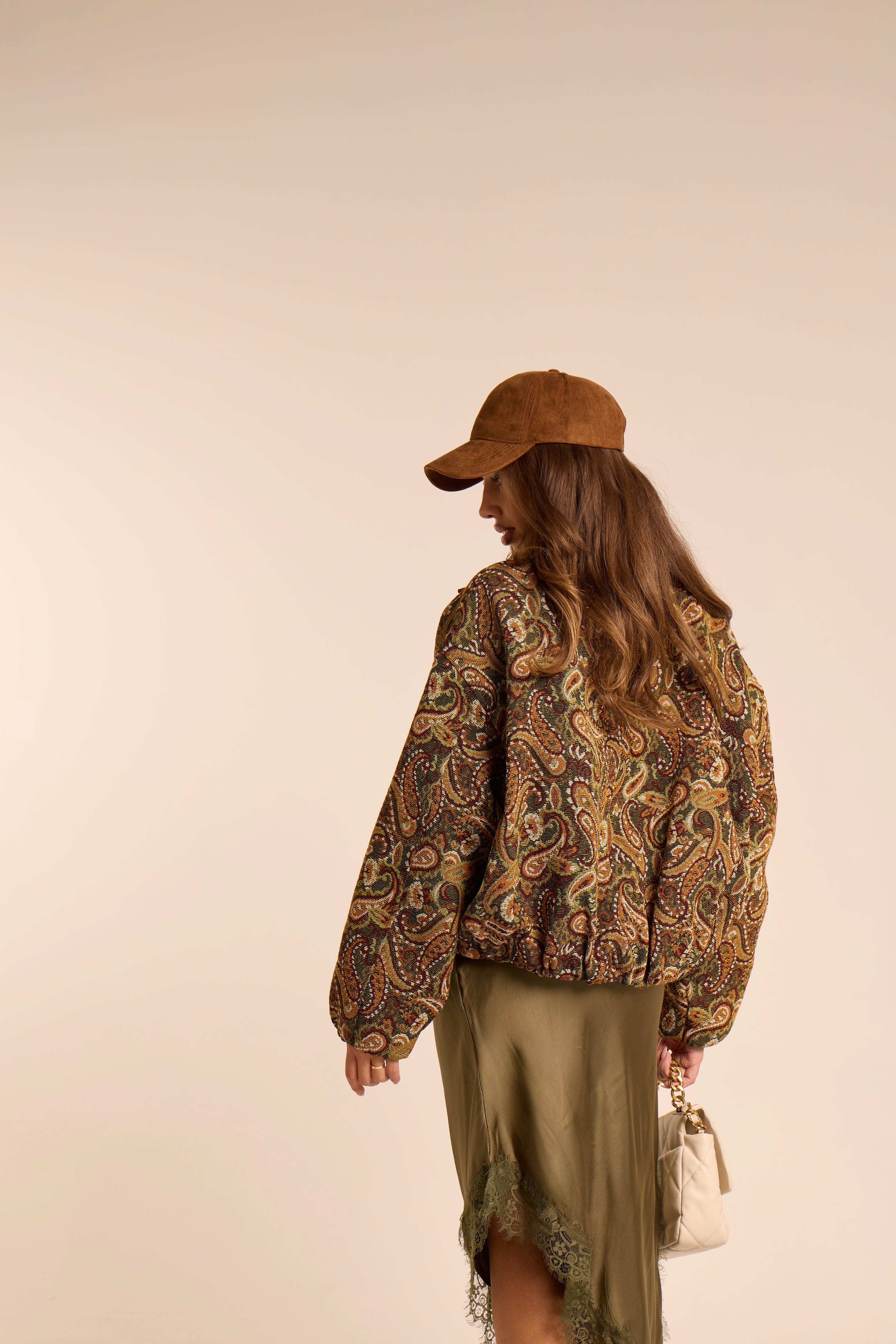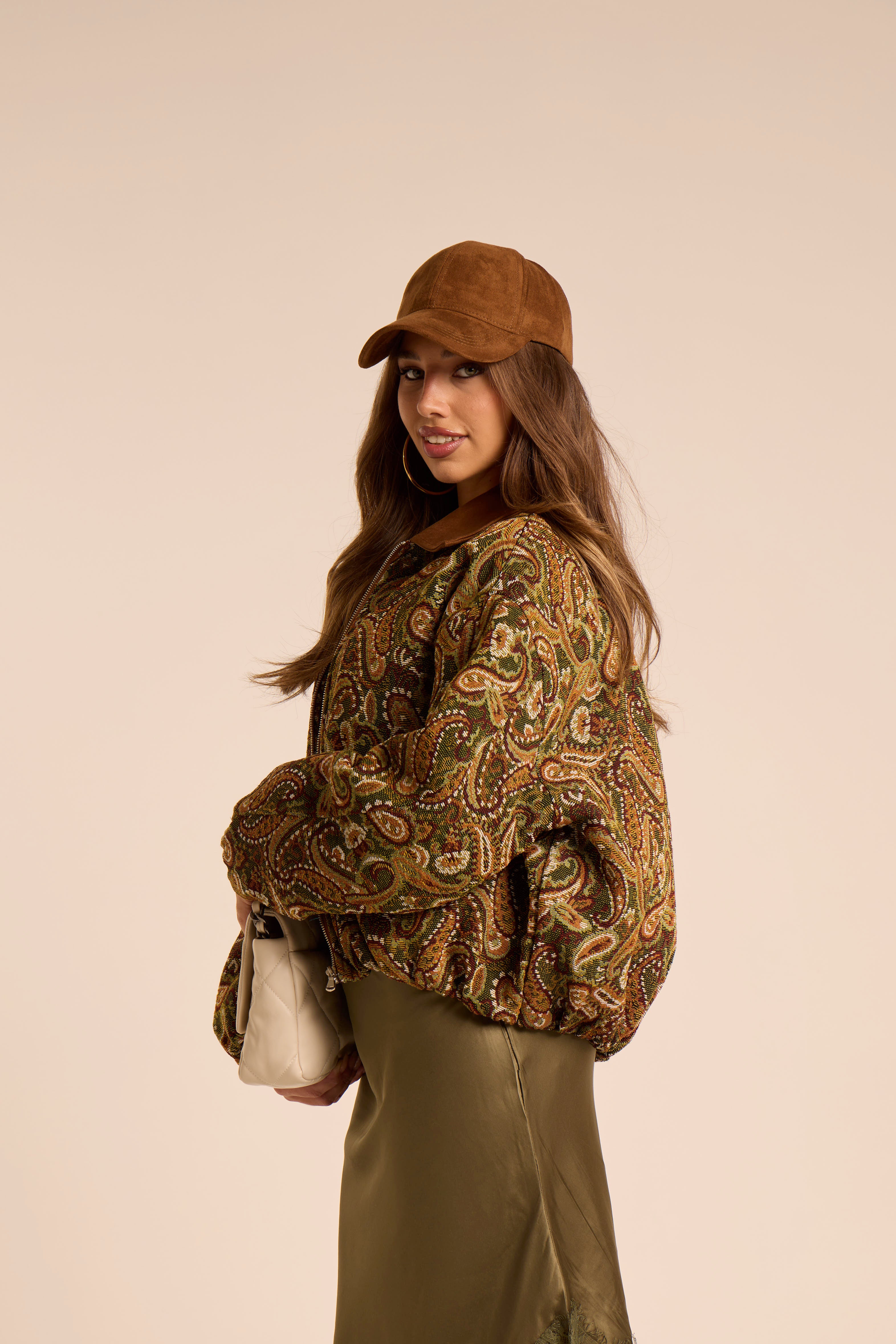 Bomber oversize. Chiusura frontale con cerniera. Tasche laterali. Arricciato sul fondo. Manica spalla bassa. Foderato e imbottito. Scollo a camicia in simil camoscio.