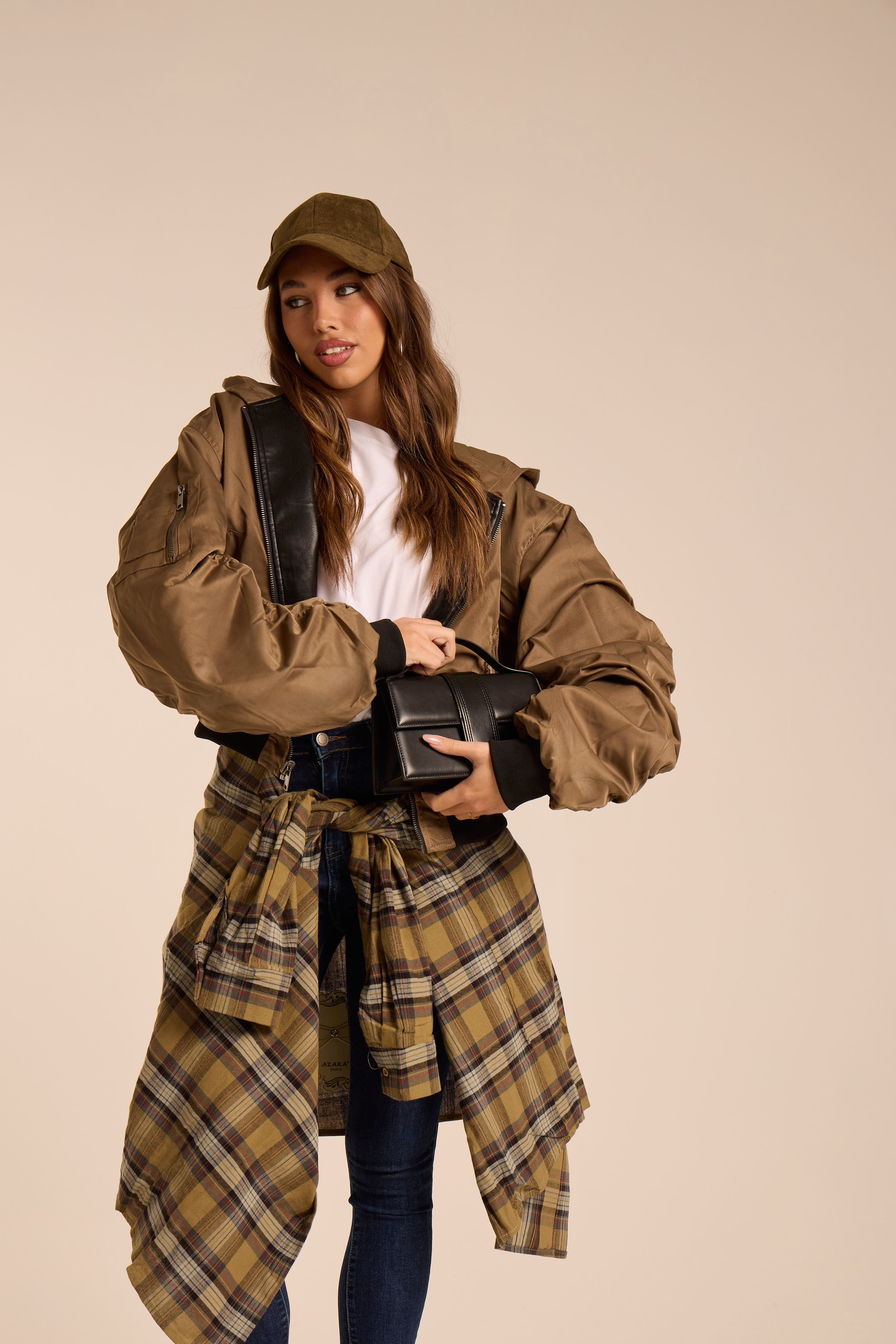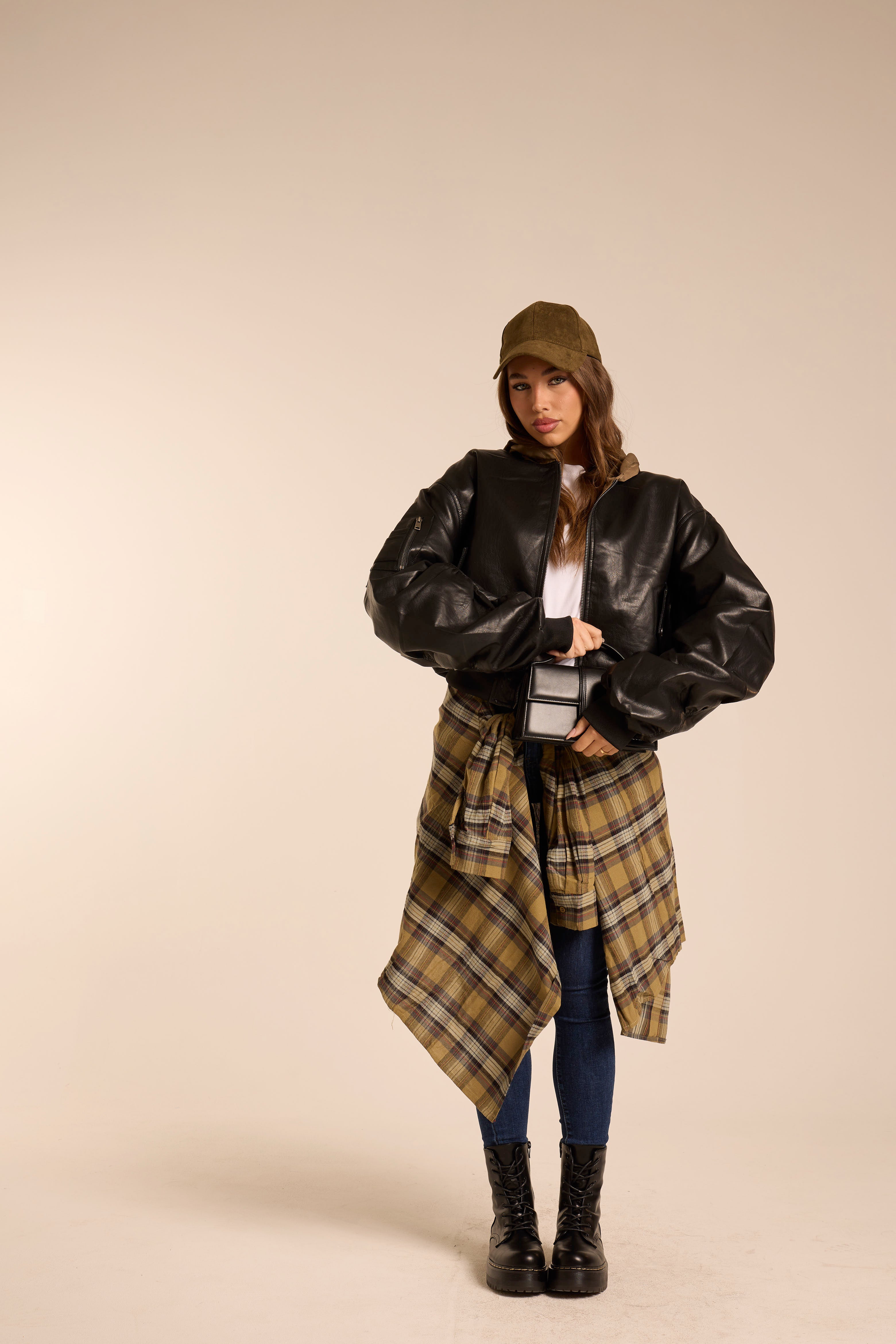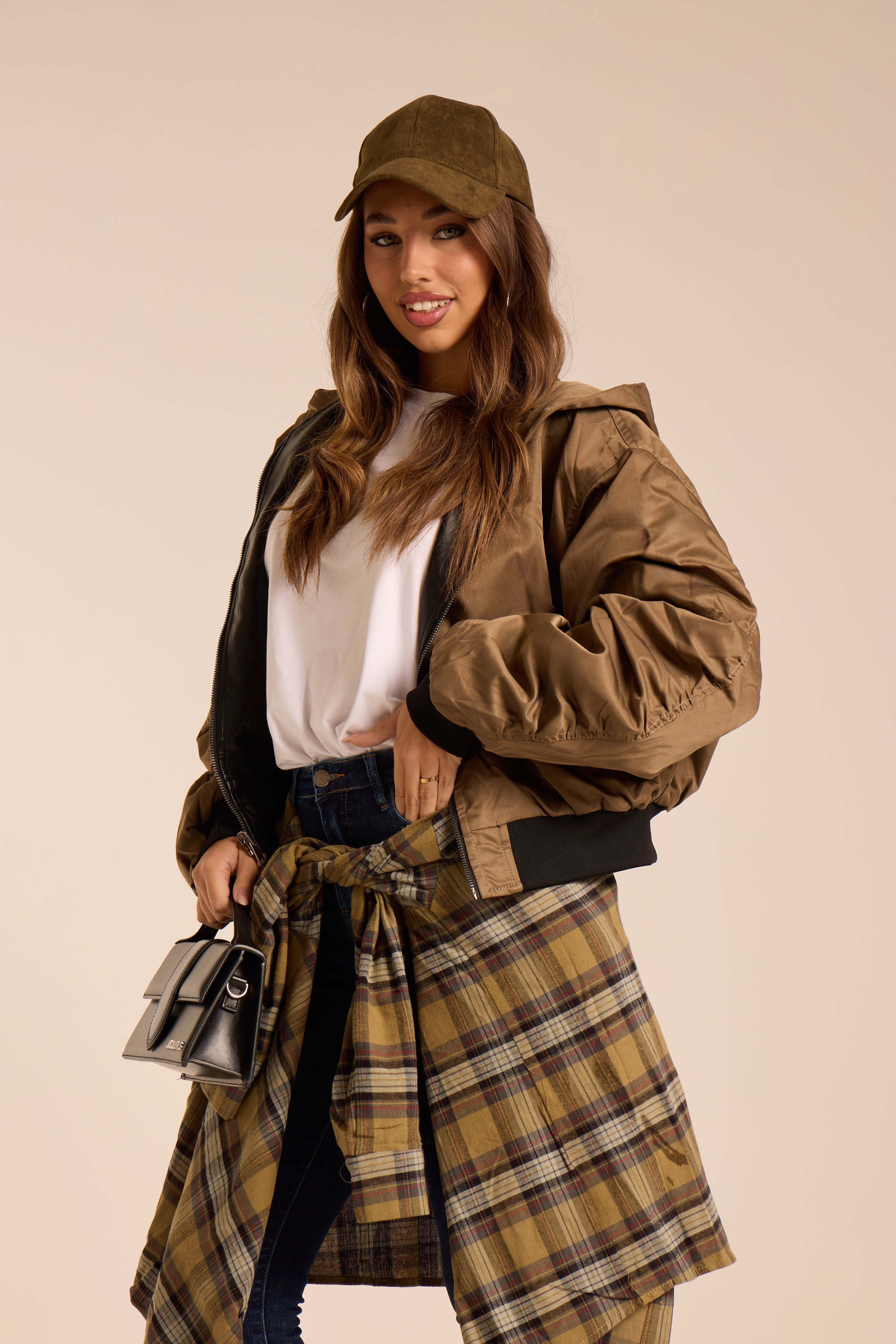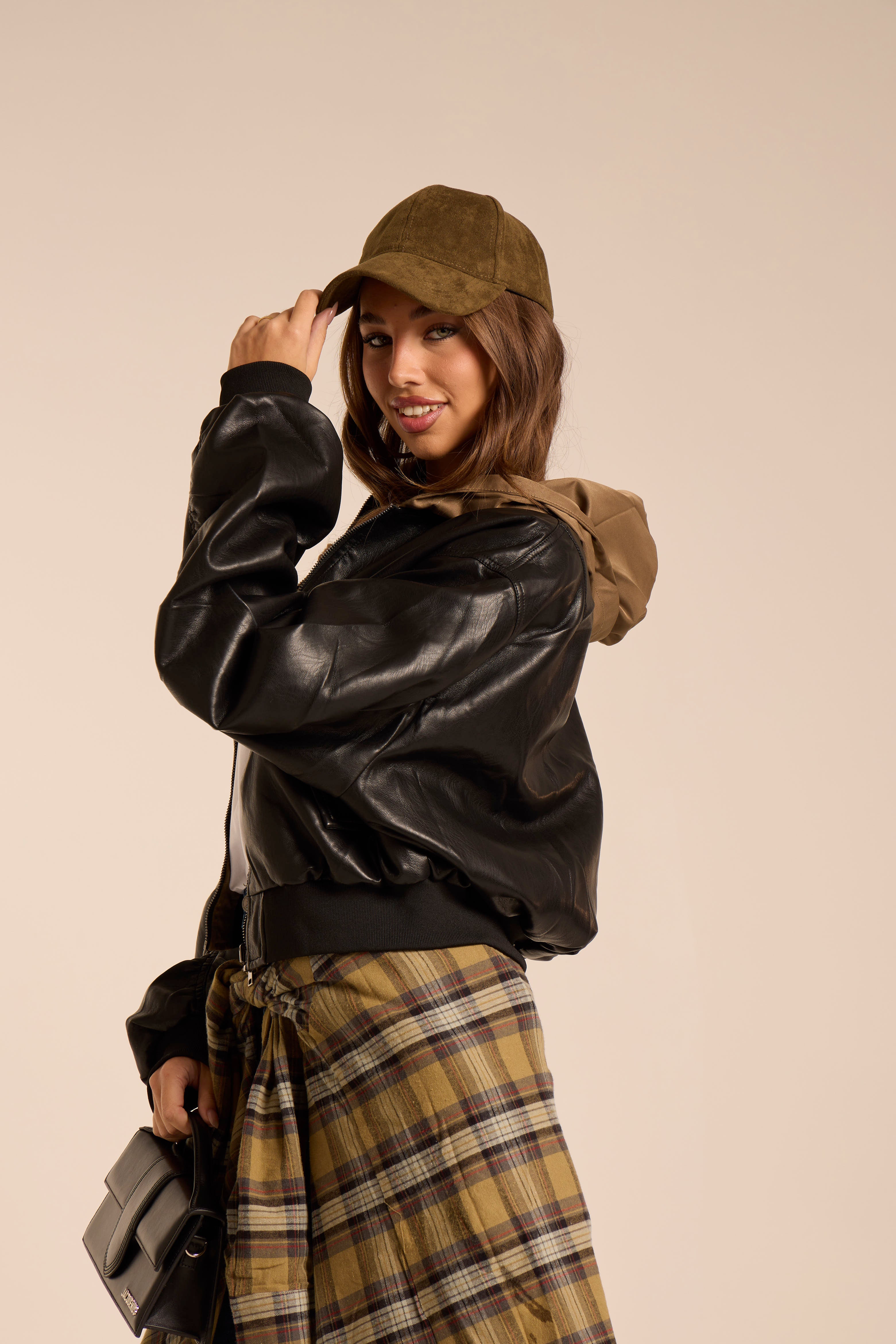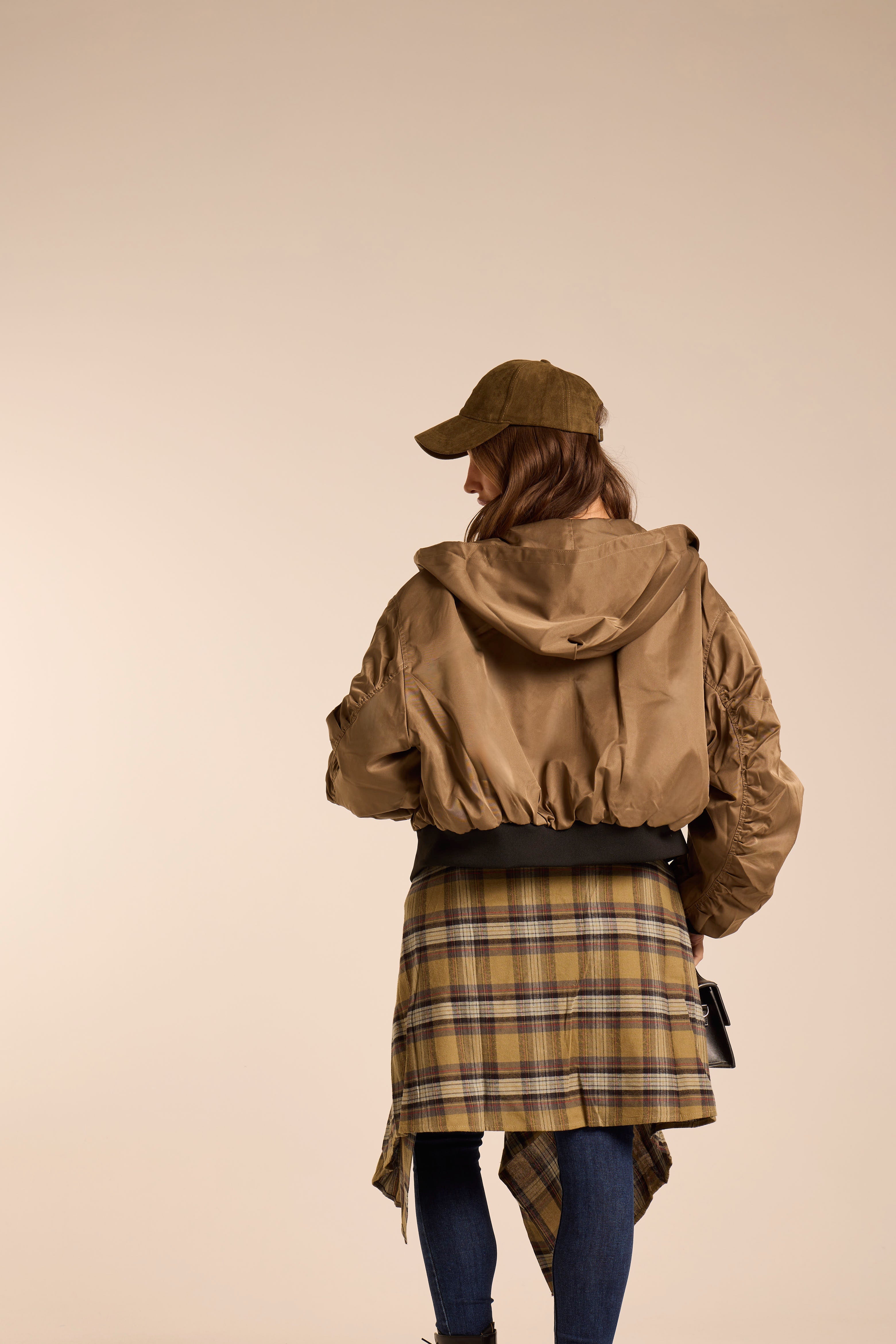 Bomber in eco pelle lucida. Reversibile bomber. Con cappuccio e fodera, doppio tessuto. Tasche laterali, chiusura con tip. Manica a palloncino arricciata. Polsini in maglia a costine. Chiusura centrale con cerniera.