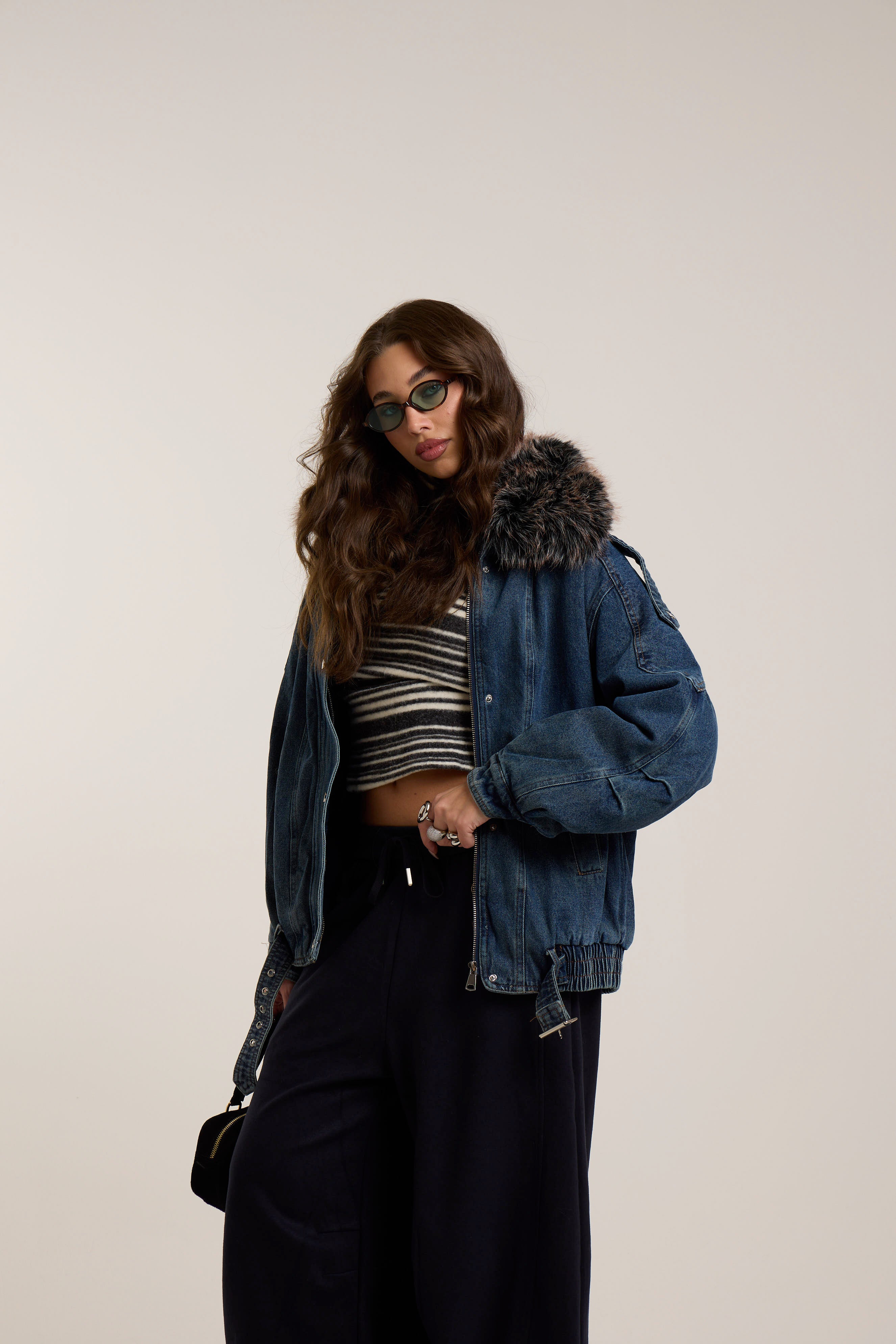 Giacca in denim. Presenta un fit over e boxy. Il colletto in pelliccia sintetica, soffice e voluminoso, aggiunge un tocco glam e avvolgente che eleva immediatamente qualsiasi look. Imbottito di pelo all’interno.