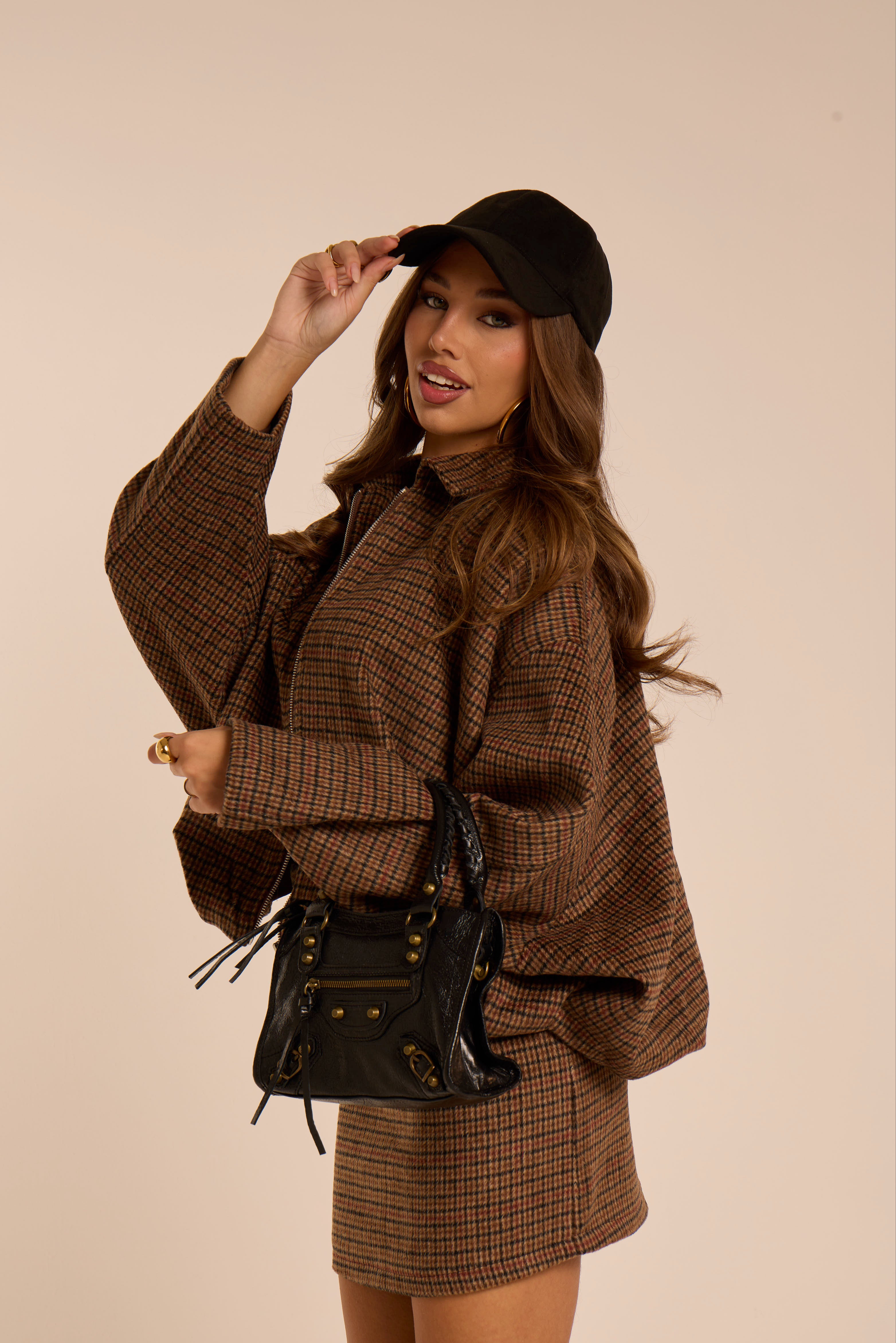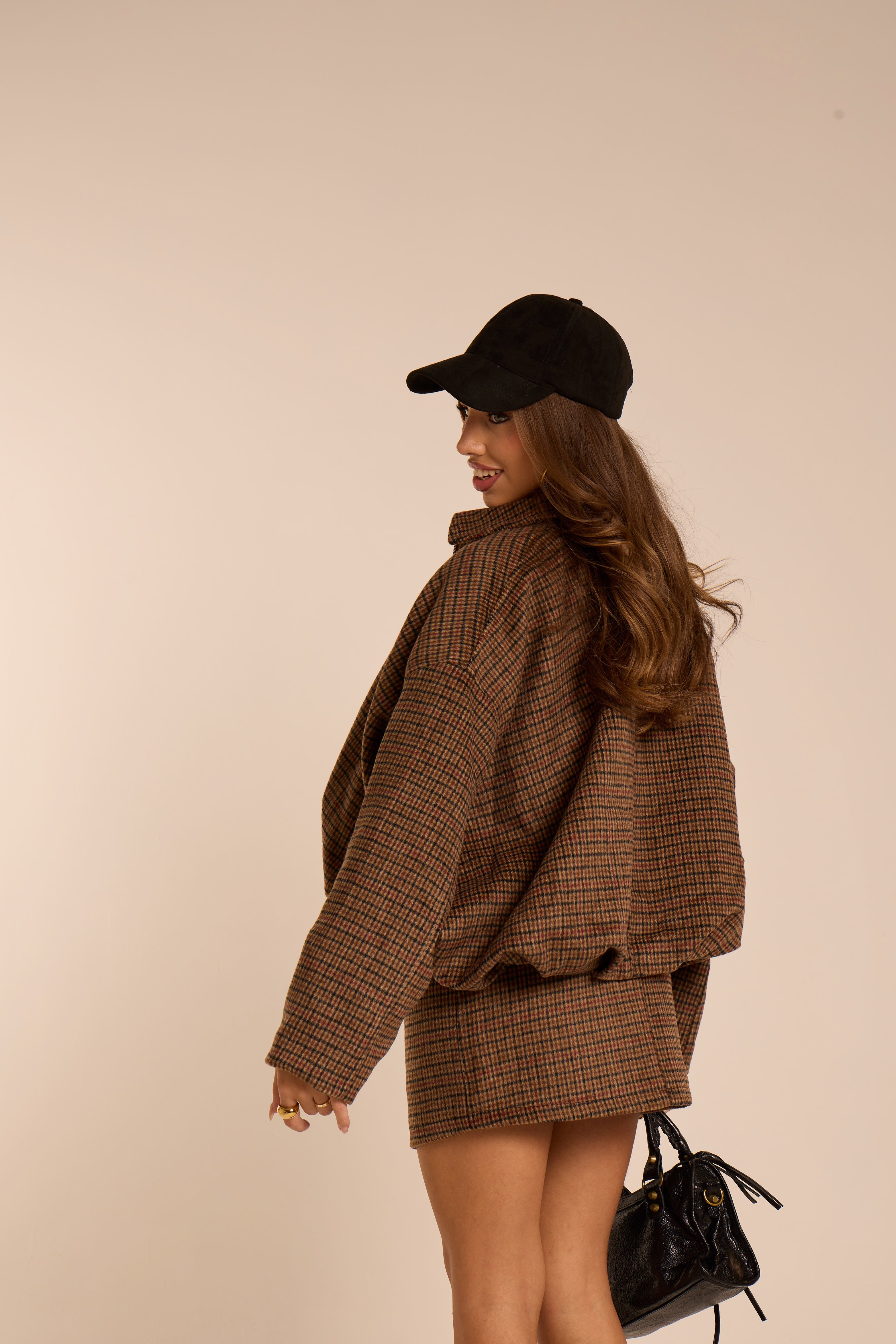 Bomber oversize. Foderato. Trama a quadretti. Chiusura frontale con cerniera. Tasche laterali. Arricciato sul fondo. Manica spalla bassa. Collo a camicia. Tessuto pelo corto.
