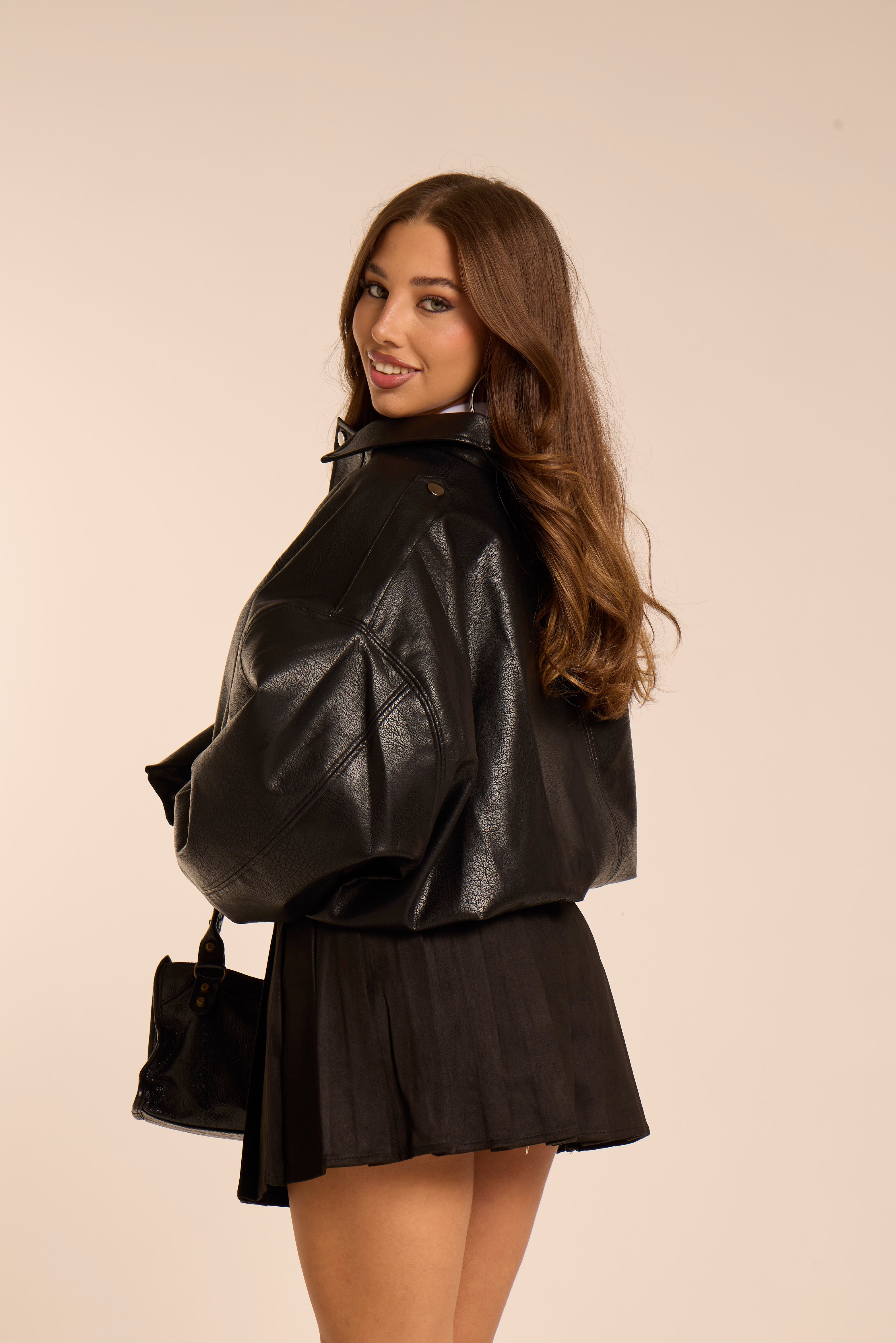 Giacca modello bomber. Effetto simil pelle. Modello oversize. Cuciture e rifiniture tono su tono. Fibbia con bottone sulla spalla. Chiusura con cerniera zip, coperta da tessuto. Rifinitura finale con elastico. Foderata.