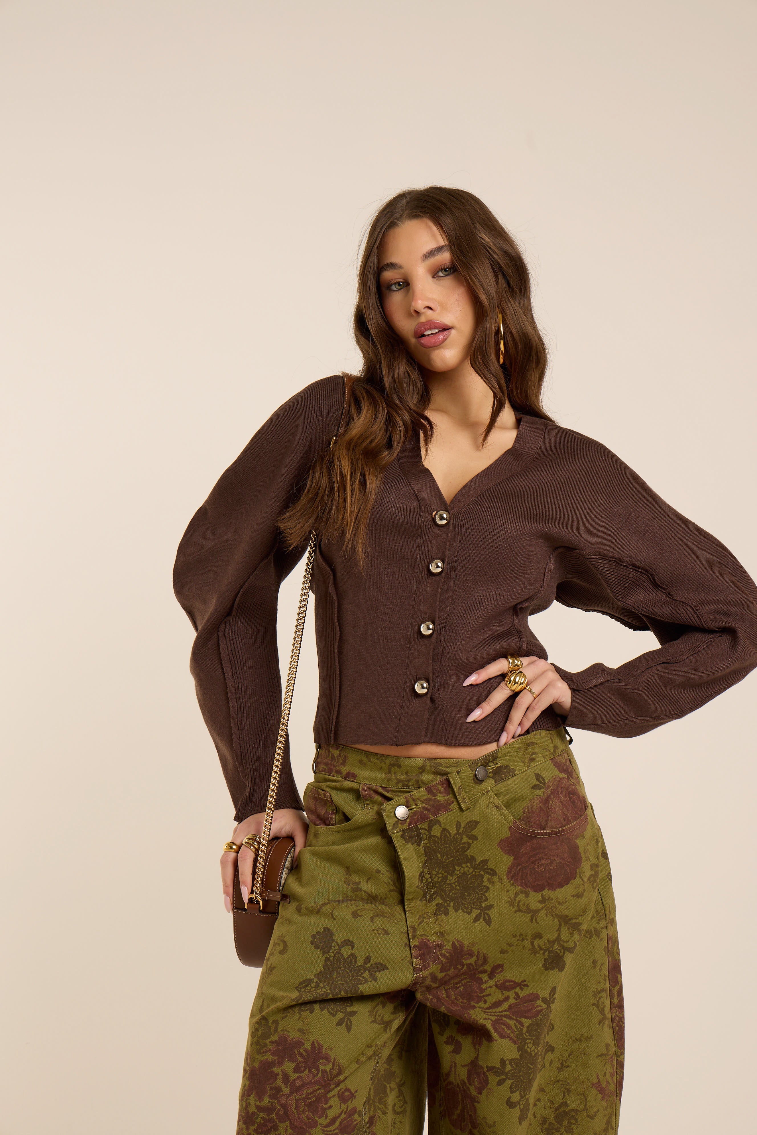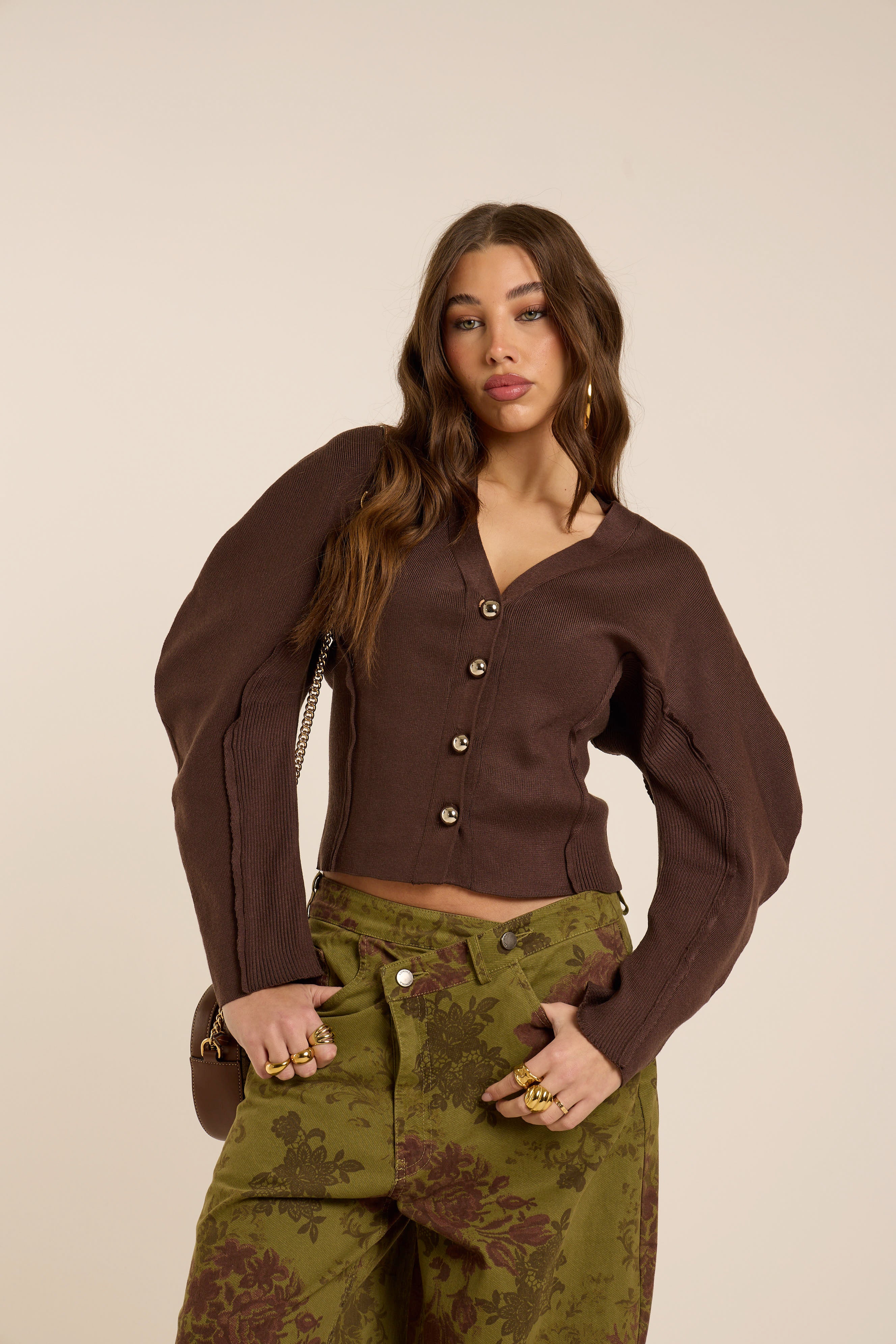 Cardigan corto in maglia color cacao scuro, realizzato in filato morbido a trama fine. Silhouette sagomata e femminile, con scollo a V profondo che valorizza il décolleté e chiusura frontale con bottoni gioiello dorati, protagonista del capo. Le maniche leggermente a palloncino creano volume.