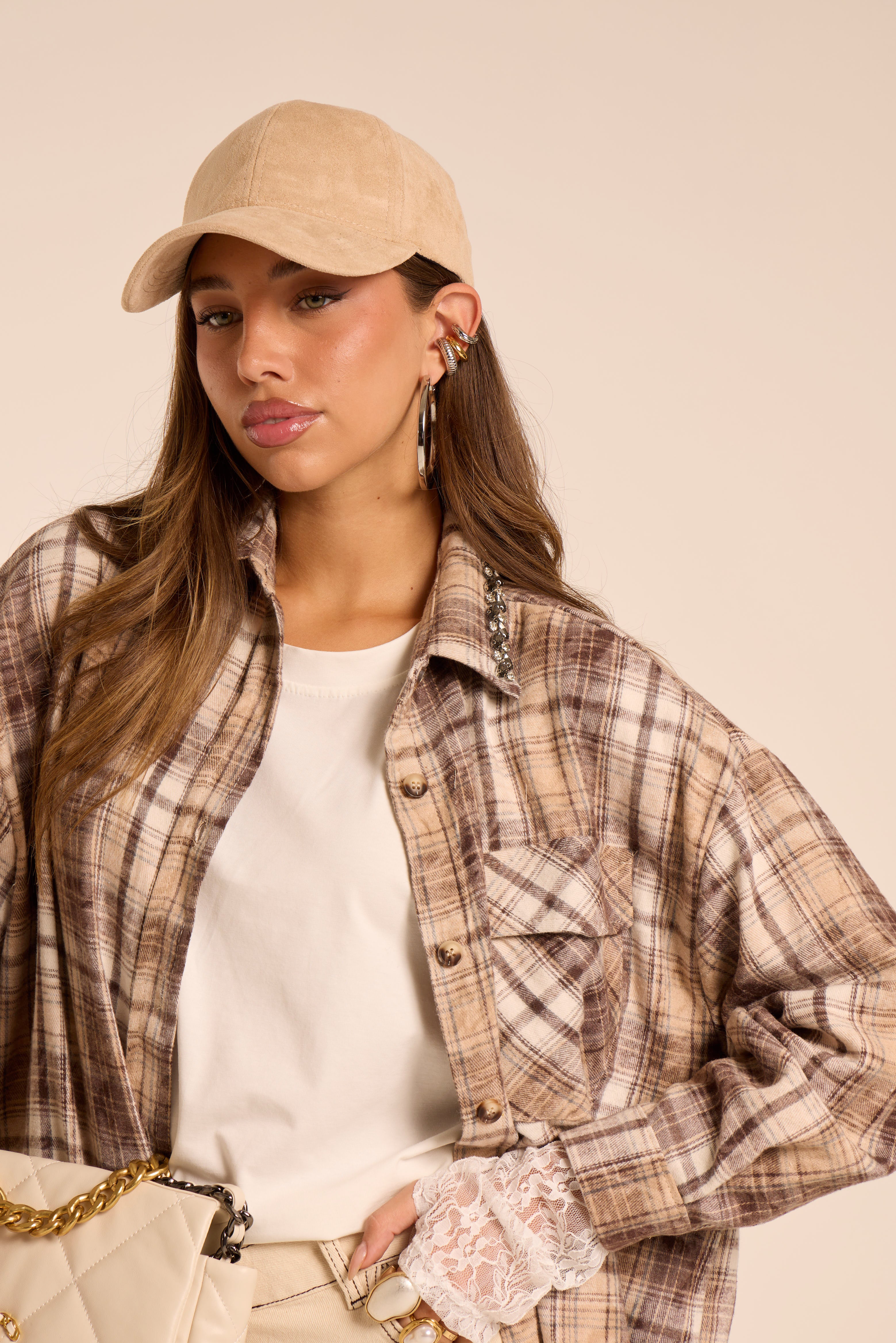 Camicia a quadri. Tessuto pesante. Oversize. Dettaglio strass sul colletto. Tasca con patta parte laterale. Chiusura con bottoni e bottone al polso regolabile.