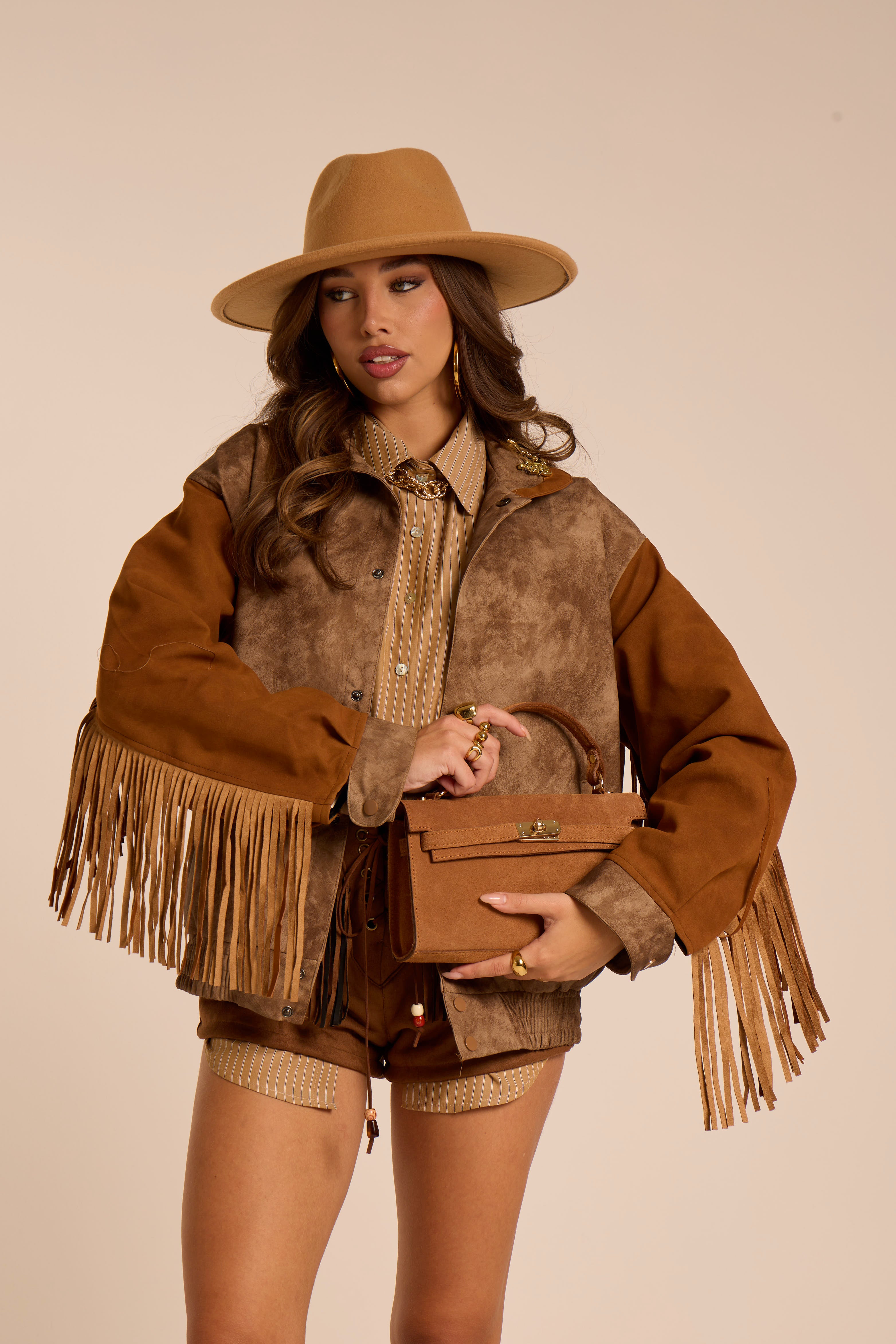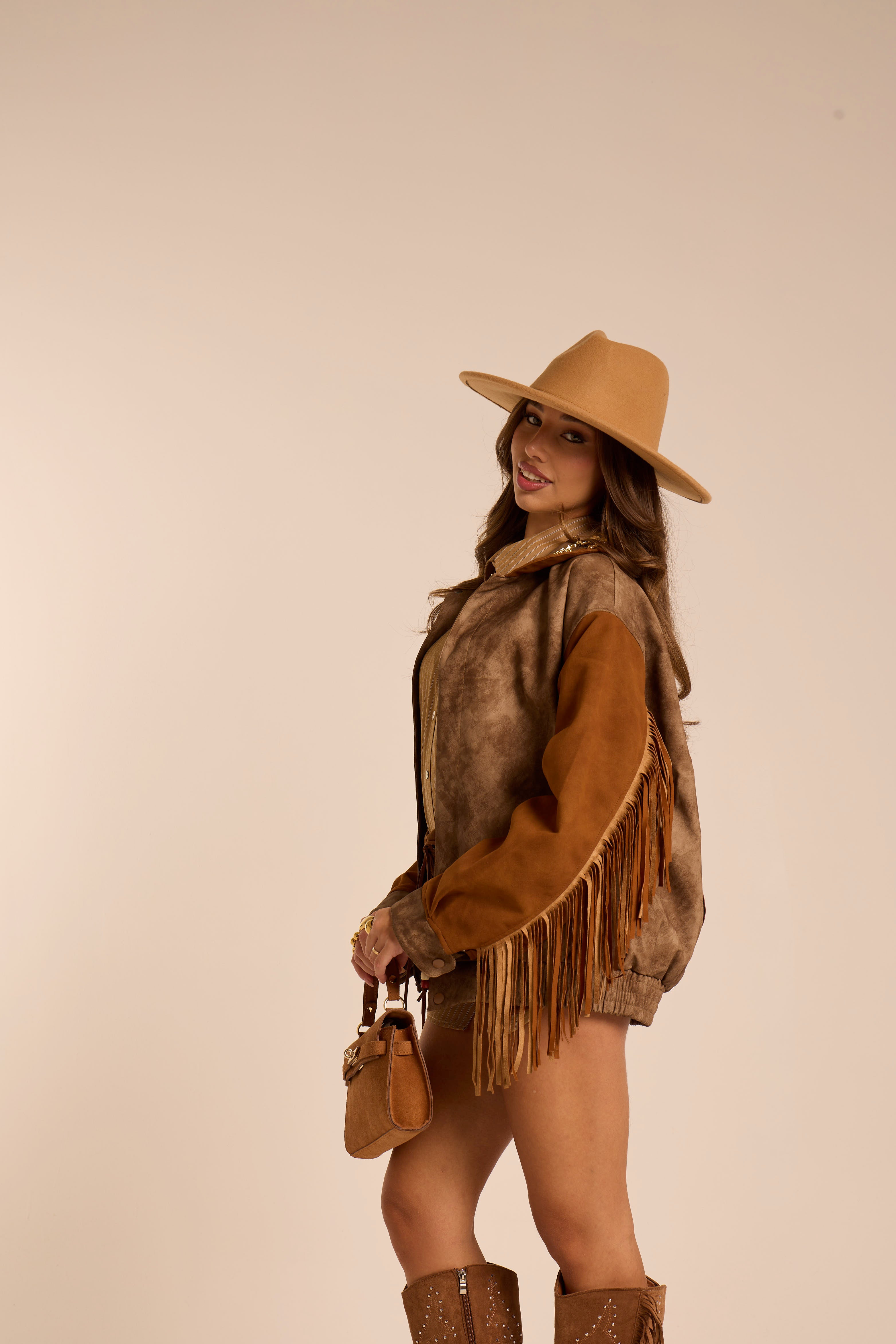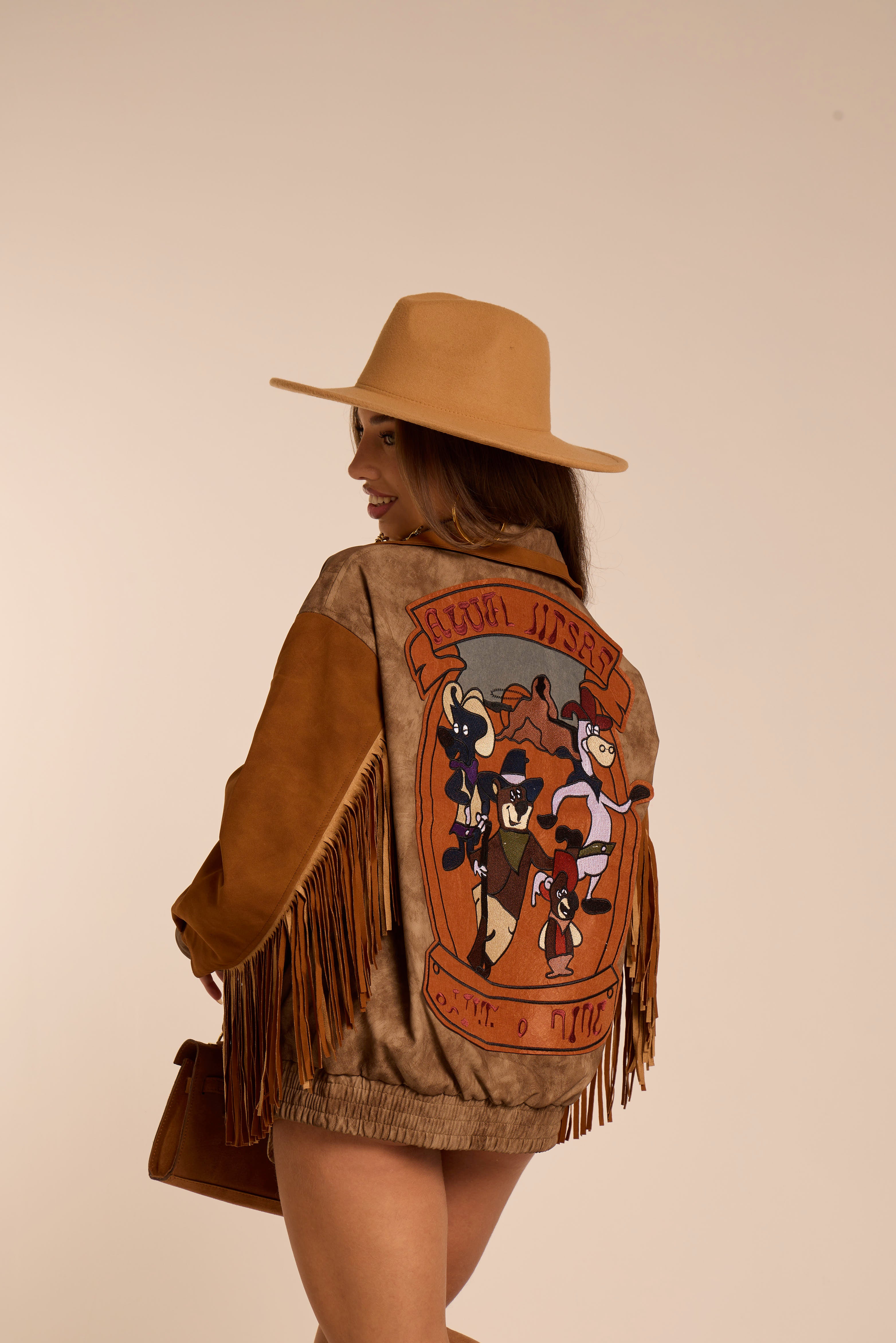 Giacca oversize. Modello bomber. Con doppio tessuto, simil camoscio e pelle. Tasche laterali. Chiusura frontale con bottoni in tip. Dettaglio spille rimovibili. Parte posteriore con stampa stampa, toppa, in rilievo. Manica con frangia.