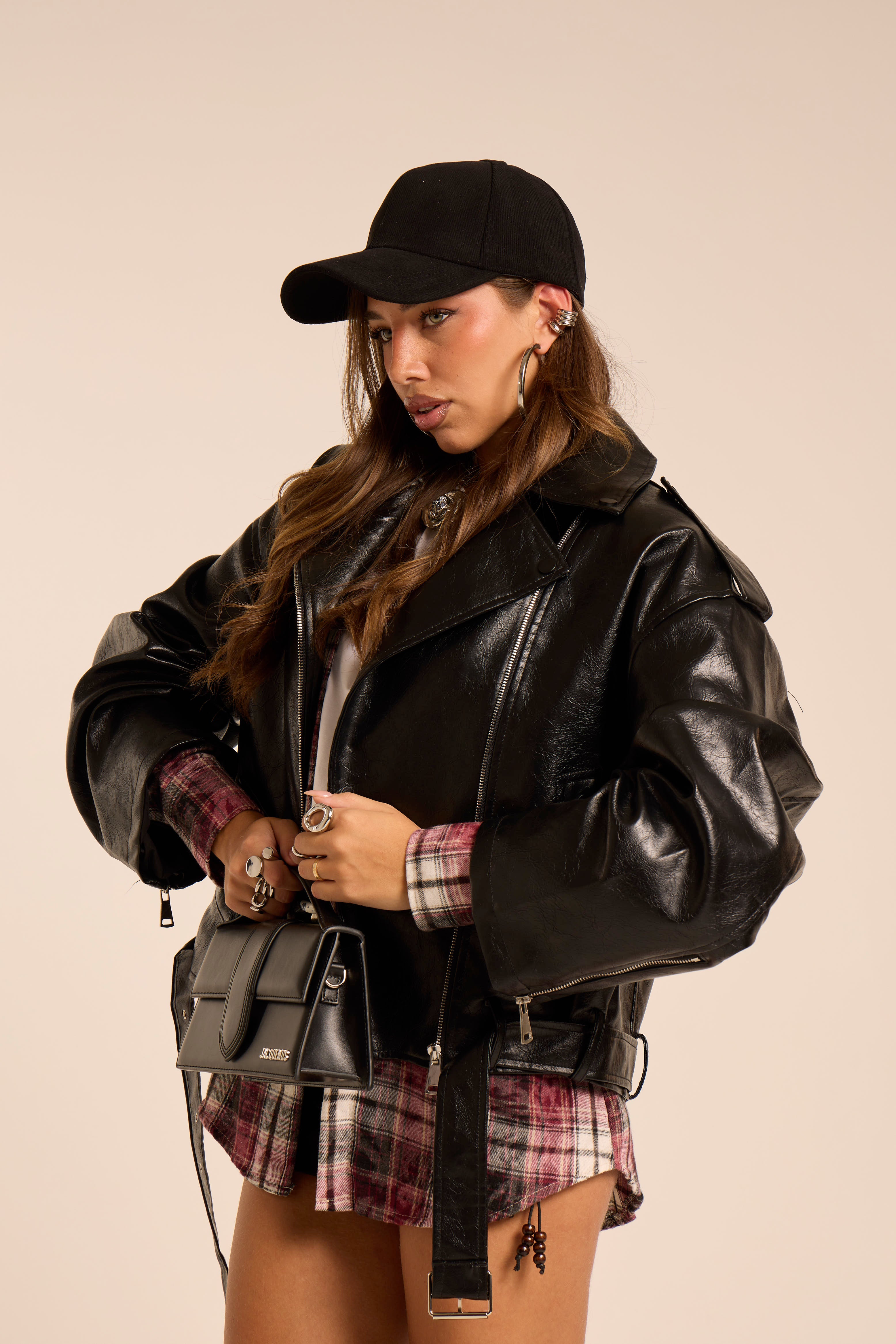 Giacca in simil pelle. Effetto vintage. Riflessi lucidi. Modello oversize. Cuciture bottoni e rifiniture tono su tono. Chiusura con cerniera zip parte centrale. Scollo intrecciato. Fibbia regolabile. Tasche laterali.
