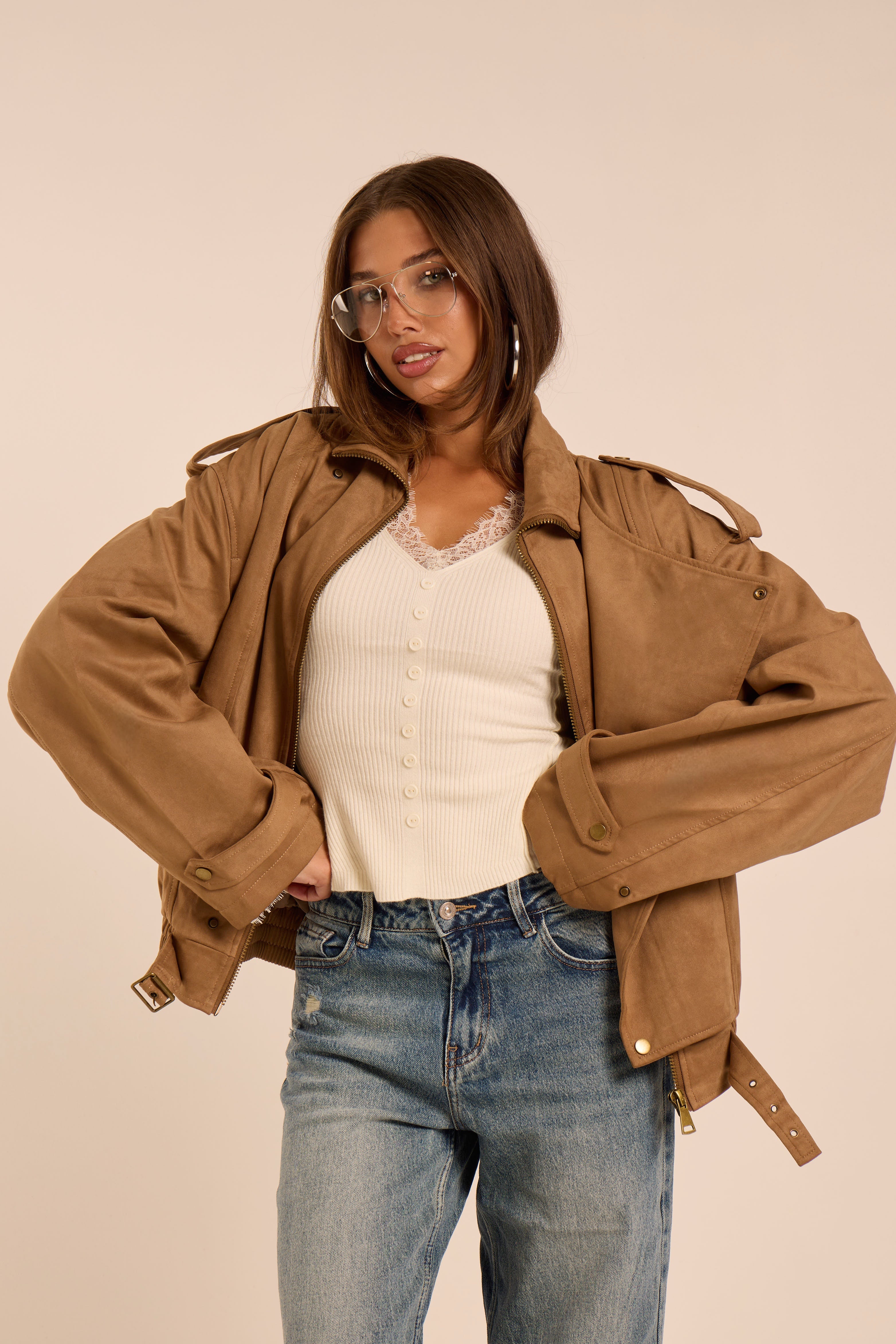 Giacca oversize. In simil camoscio. Collo a camicia. Chiusura intrecciata con cerniera coperta da tessuto. Foderata. Tasche laterali. Elasticizzata sul fondo. Dettaglio cinturini sulle spalle, polsini e parte finale.