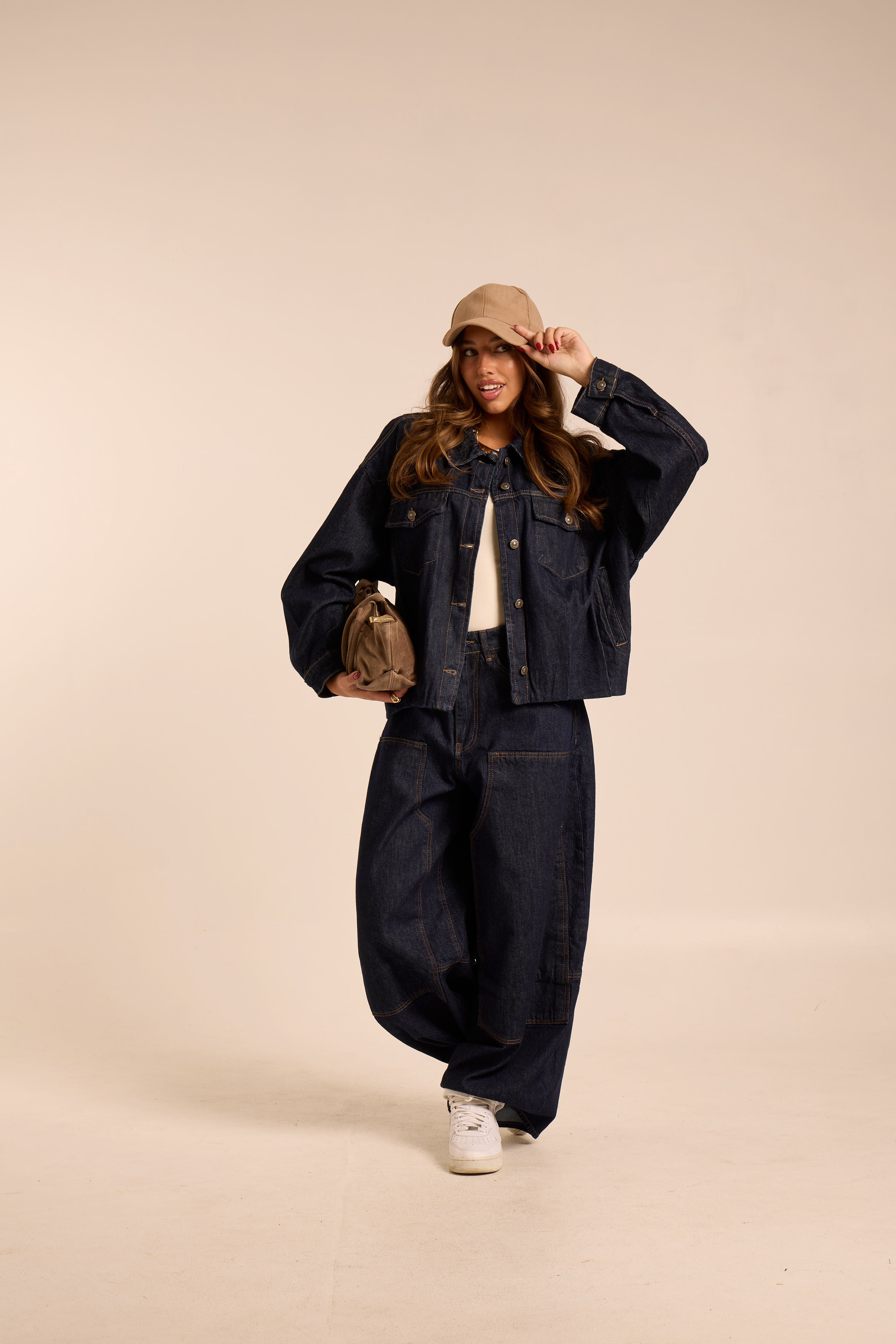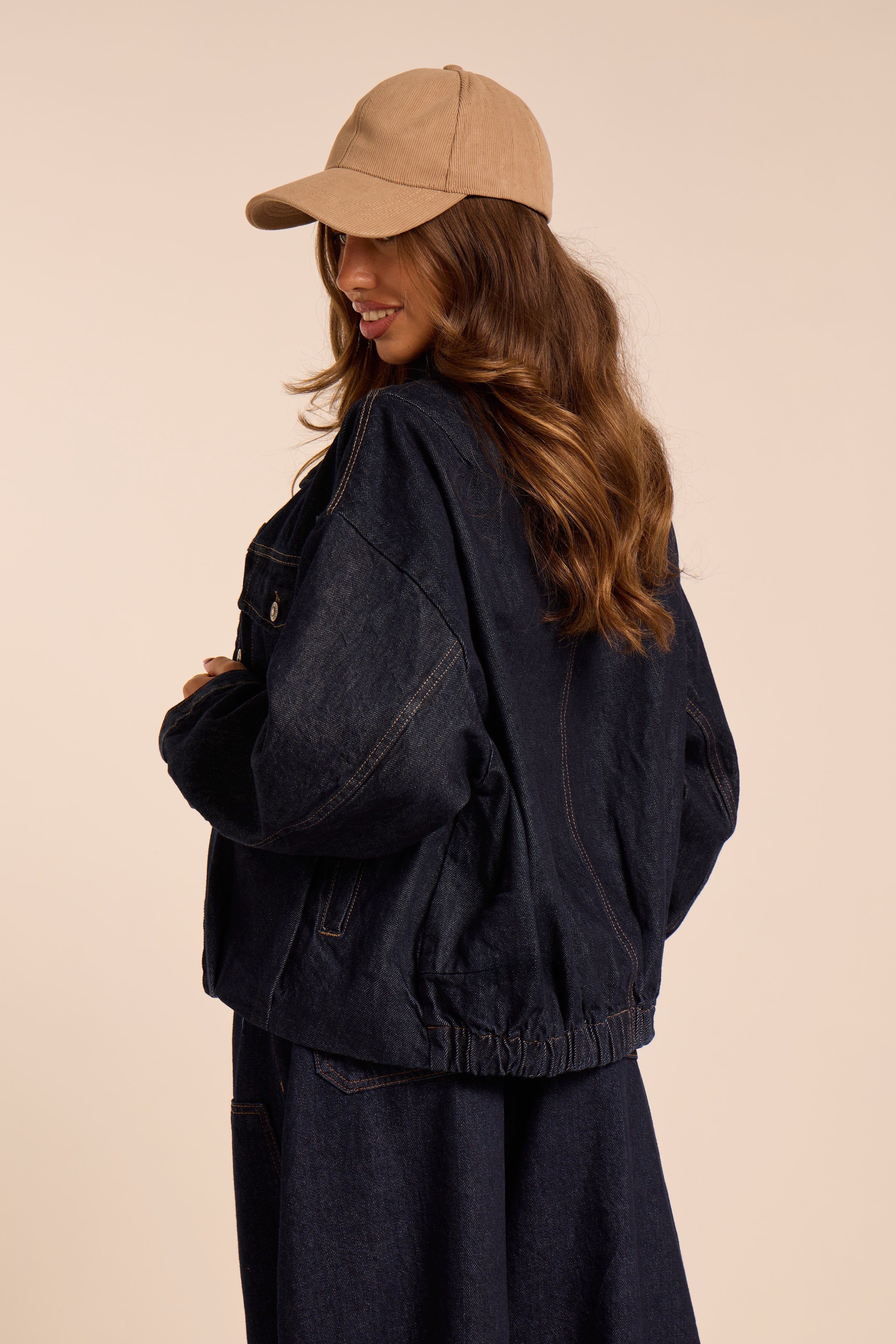 Giacca in jeans blu scuro. Modello oversize. Modello bomber, con elastico in fondo. Cuciture in contrasto colore. Chiusura centrale con bottoni. Tasche frontali con patta vere.