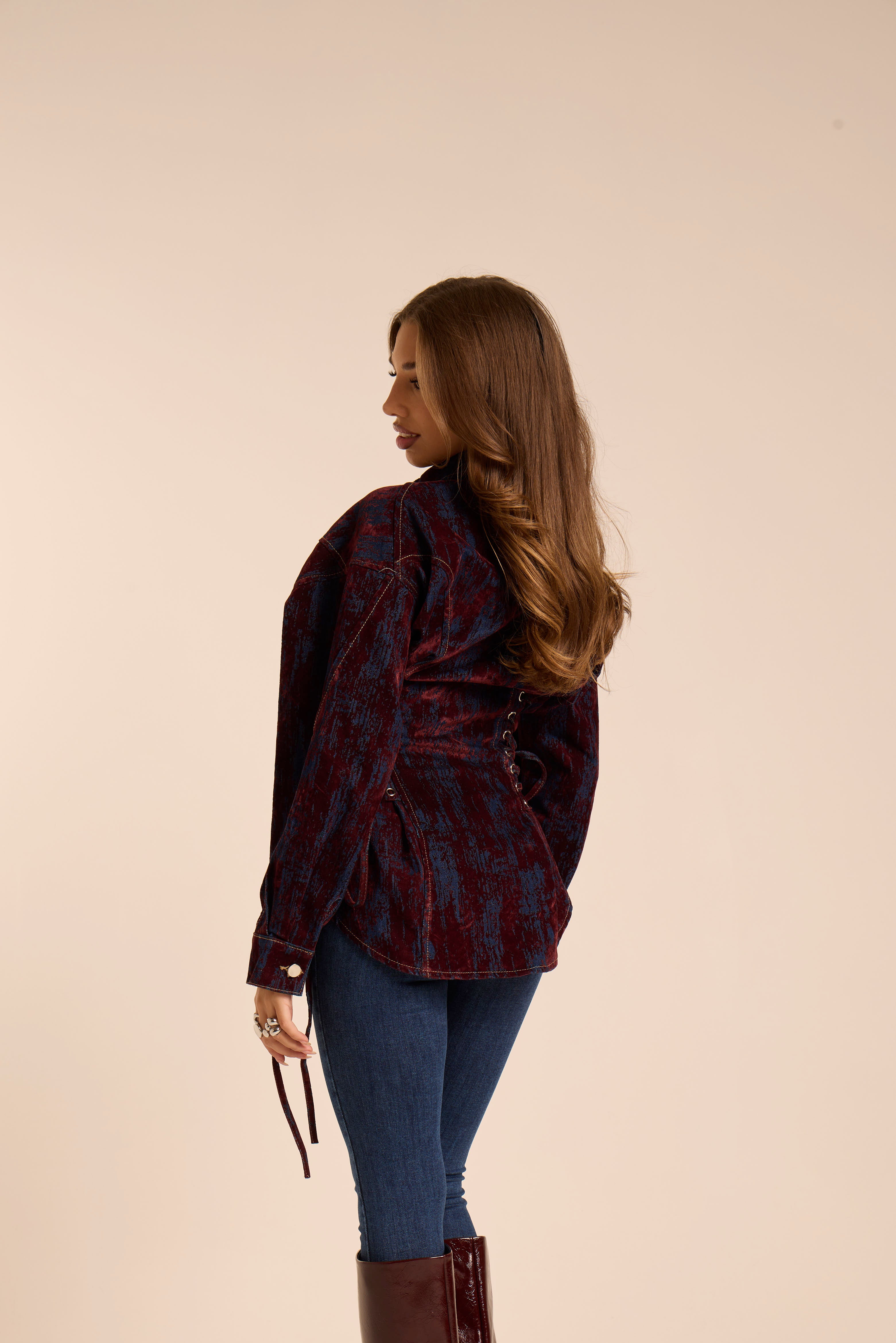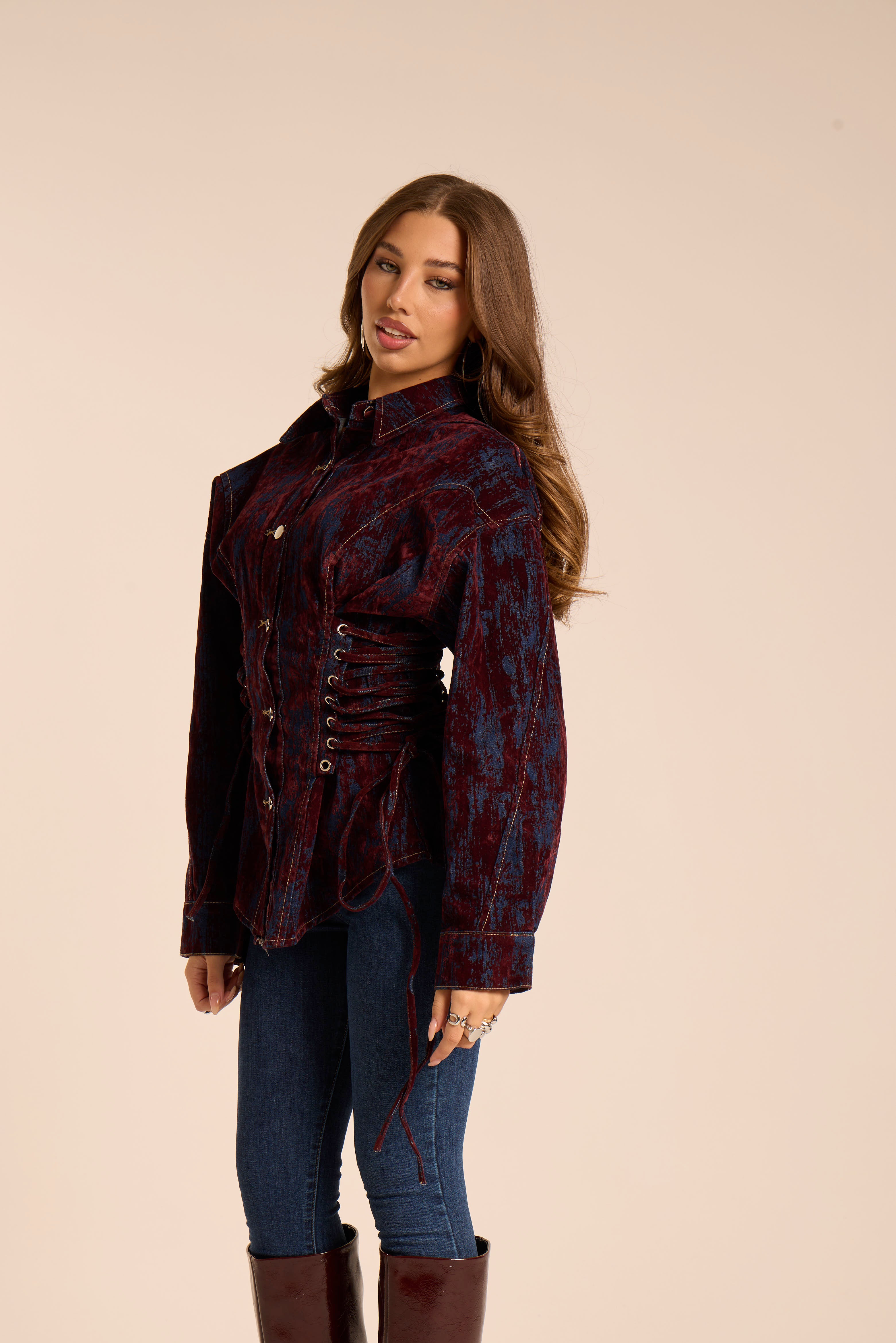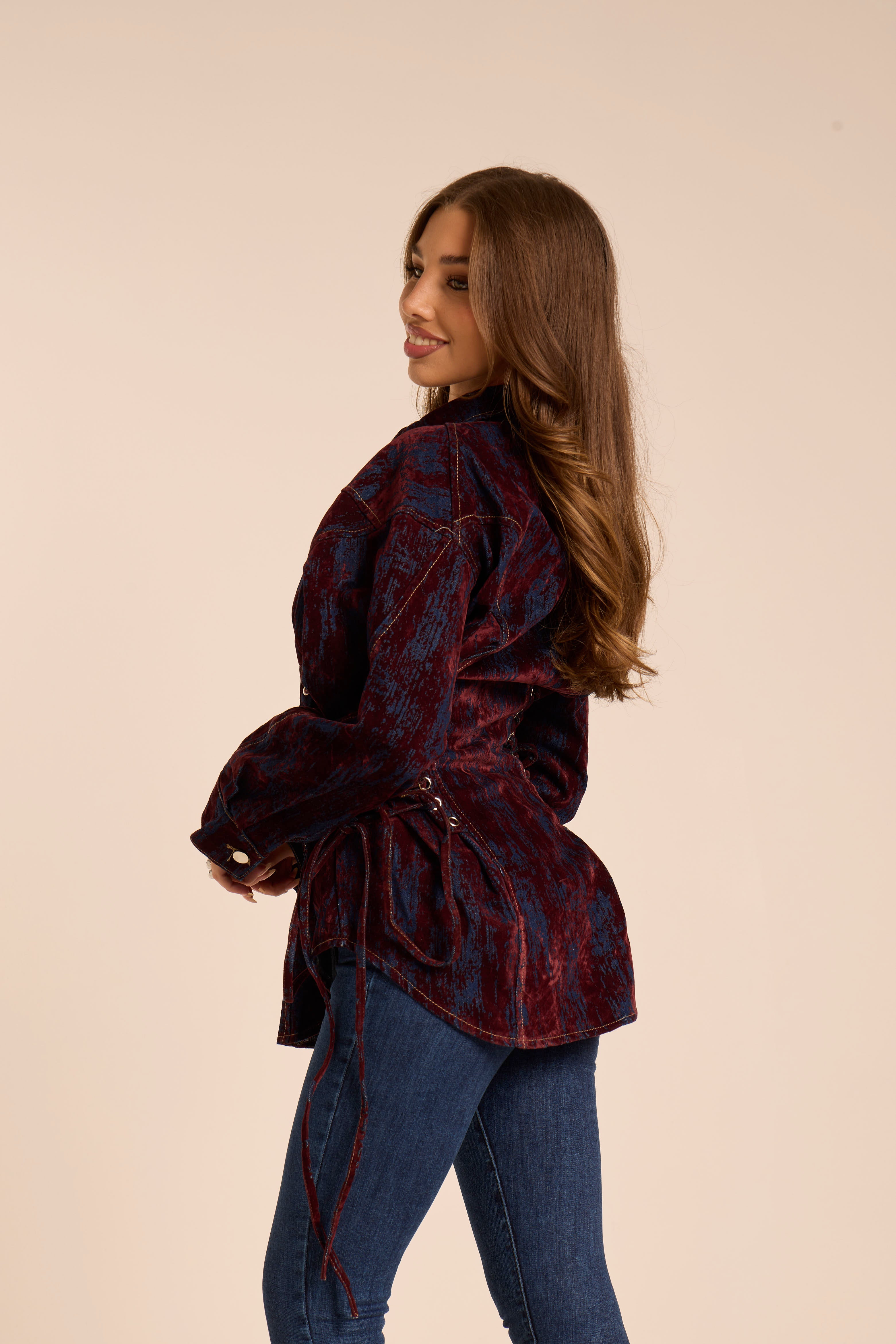 Giacca in jeans. A doppio tessuto, con velluto. Stringata sui lati, lacci regolabili. Chiusura centrale con bottoni. Manica leggermente a palloncino.