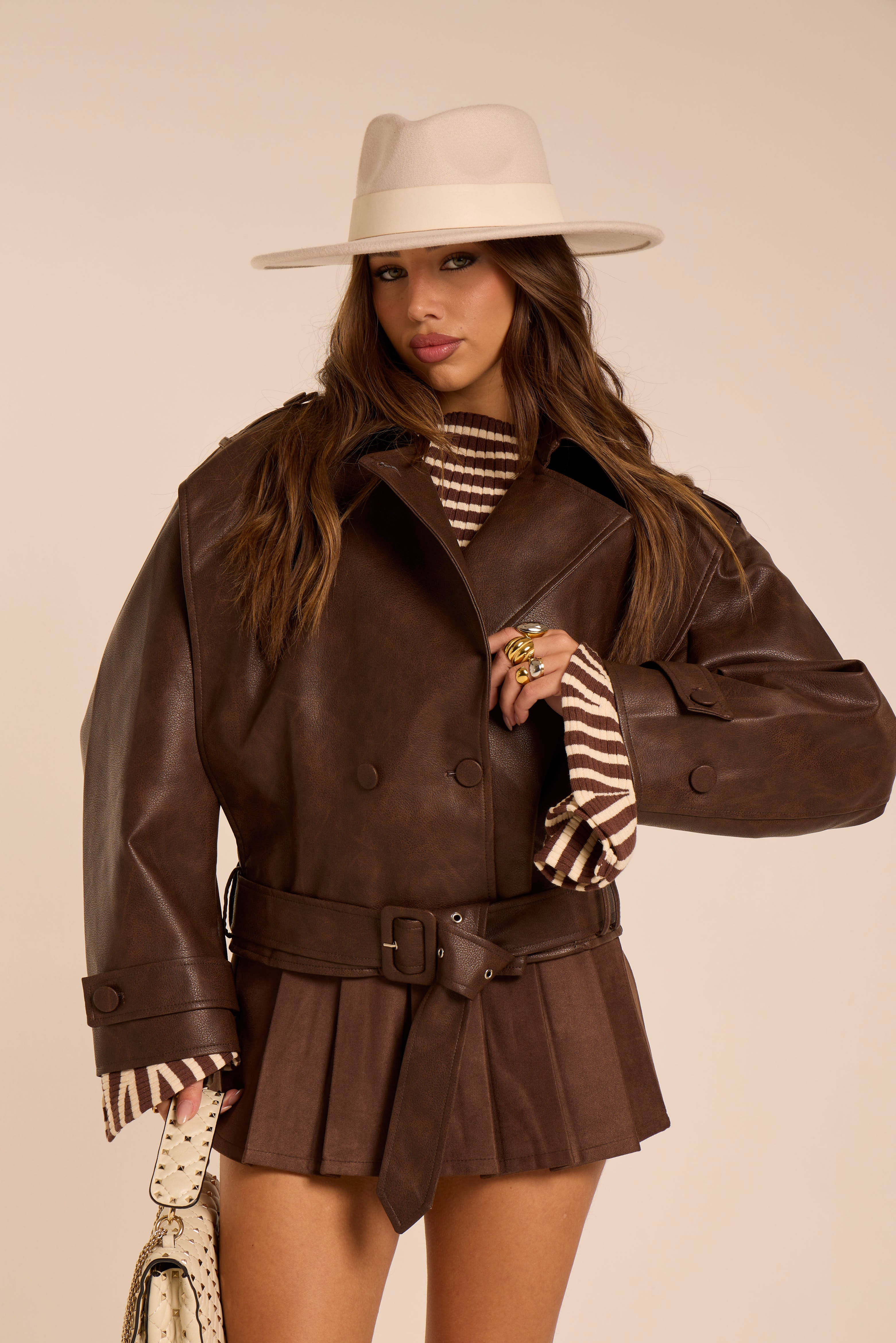 Giacca in eco pelle, modello trench. Oversize. Dettagli e rifiniture tono su tono. Chisura centrale intrecciata. Foderata.