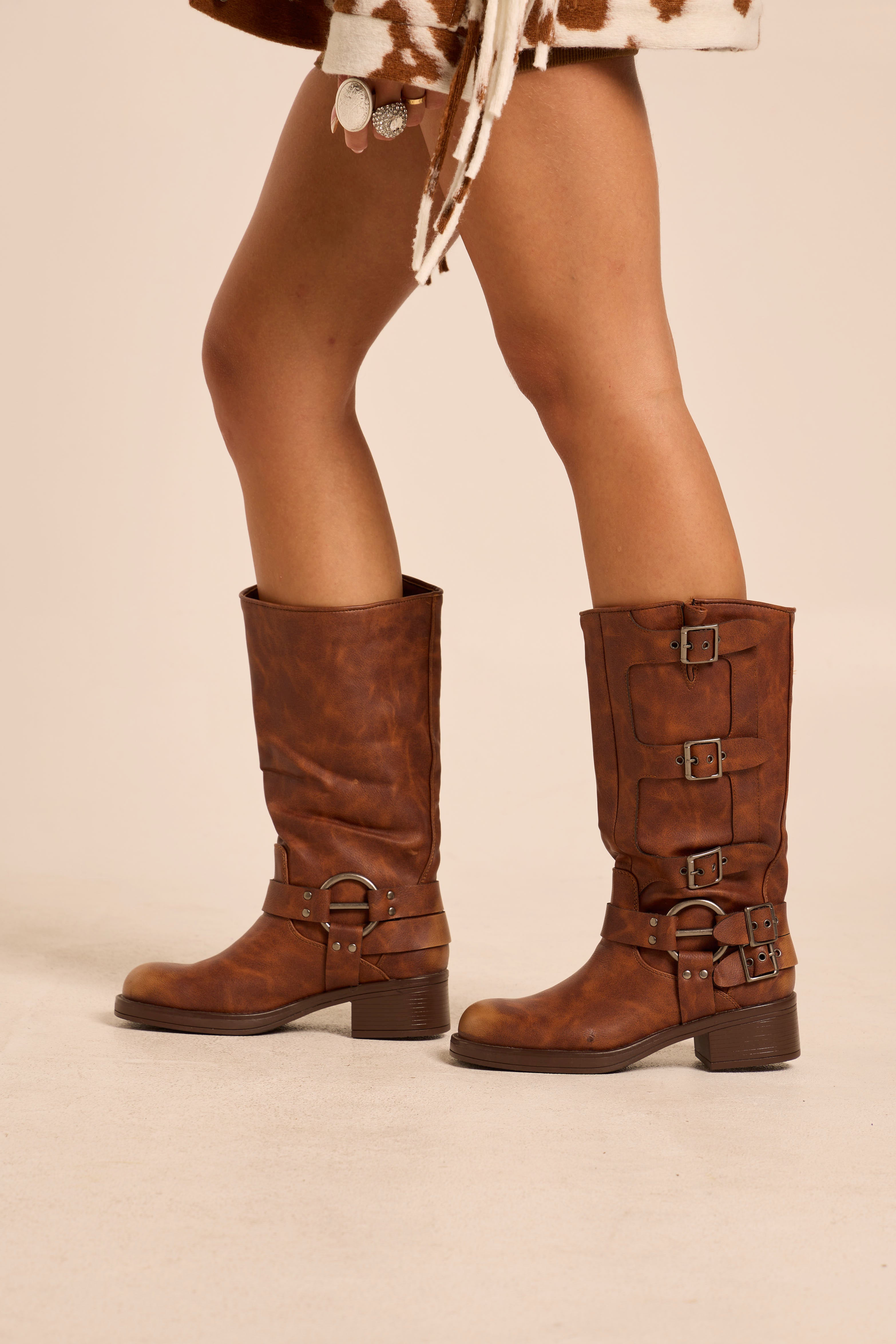 Stivale modello Biker a mezza misura. Fibbie regolabili. Rifiniture in silver. Punta squadrata. In simil pelle.